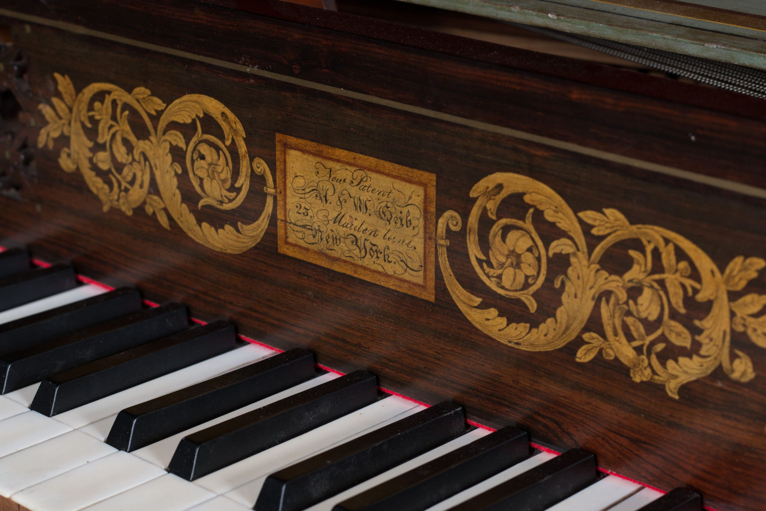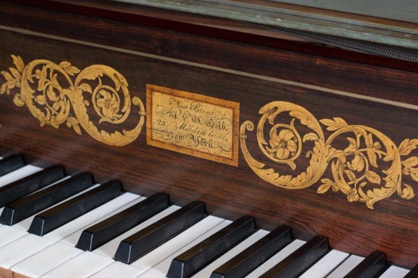 This lovely little instrument was built by William Geib in New York circa about 1830. Instruments of this type were quite popular in Europe during the late 17th and early 18th centuries. Instruments like this can often be seen featured in period movies such as “Sense & Sensibility” and “Pride & Prejudice”, etc., and this instrument was clearly built with a great deal of European influence.