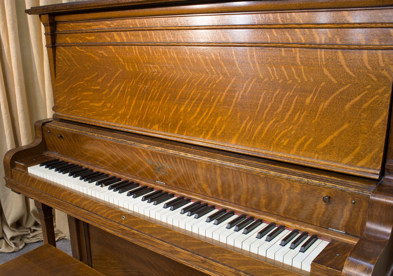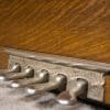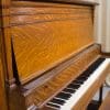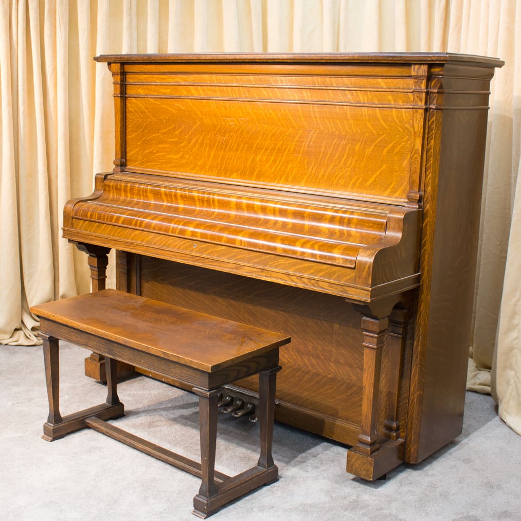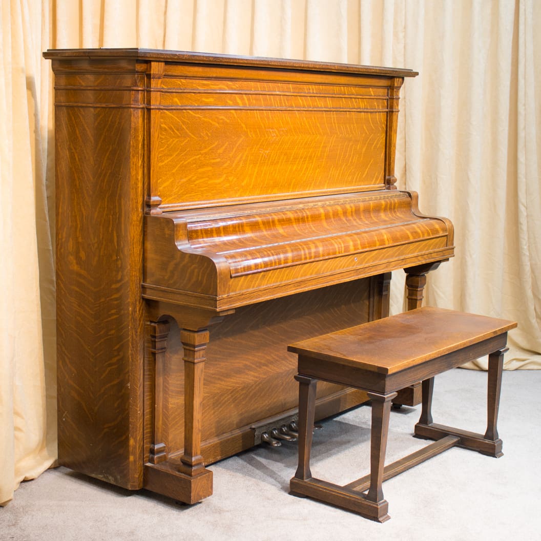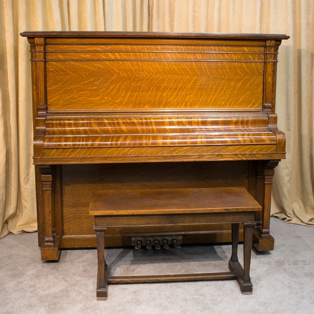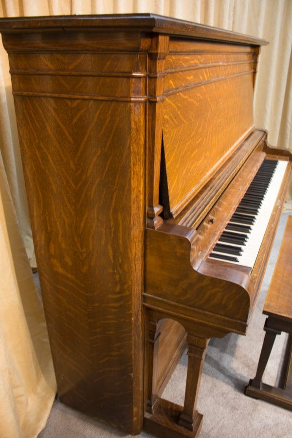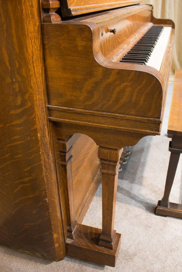 This piano was originally sold as the “Style 27” in lovely quarter sawn oak wood. Rather than being elaborately carved, this piano offers balanced elegance through simple lines and beautifully-figured oak wood grain. This piano is equipped with Wing & Sons exclusive 5 pedal mechanism which allows the pianist to mimic sounds of the mandolin, banjo, harp, and zither. It is such a delight to hear one of these pianos after professional restoration! When not engaged, the piano plays normally without any interference from these pedal attachments.