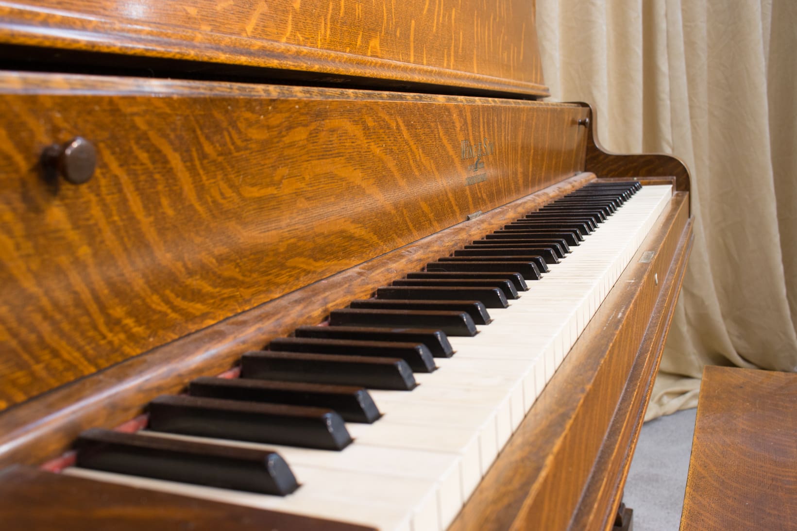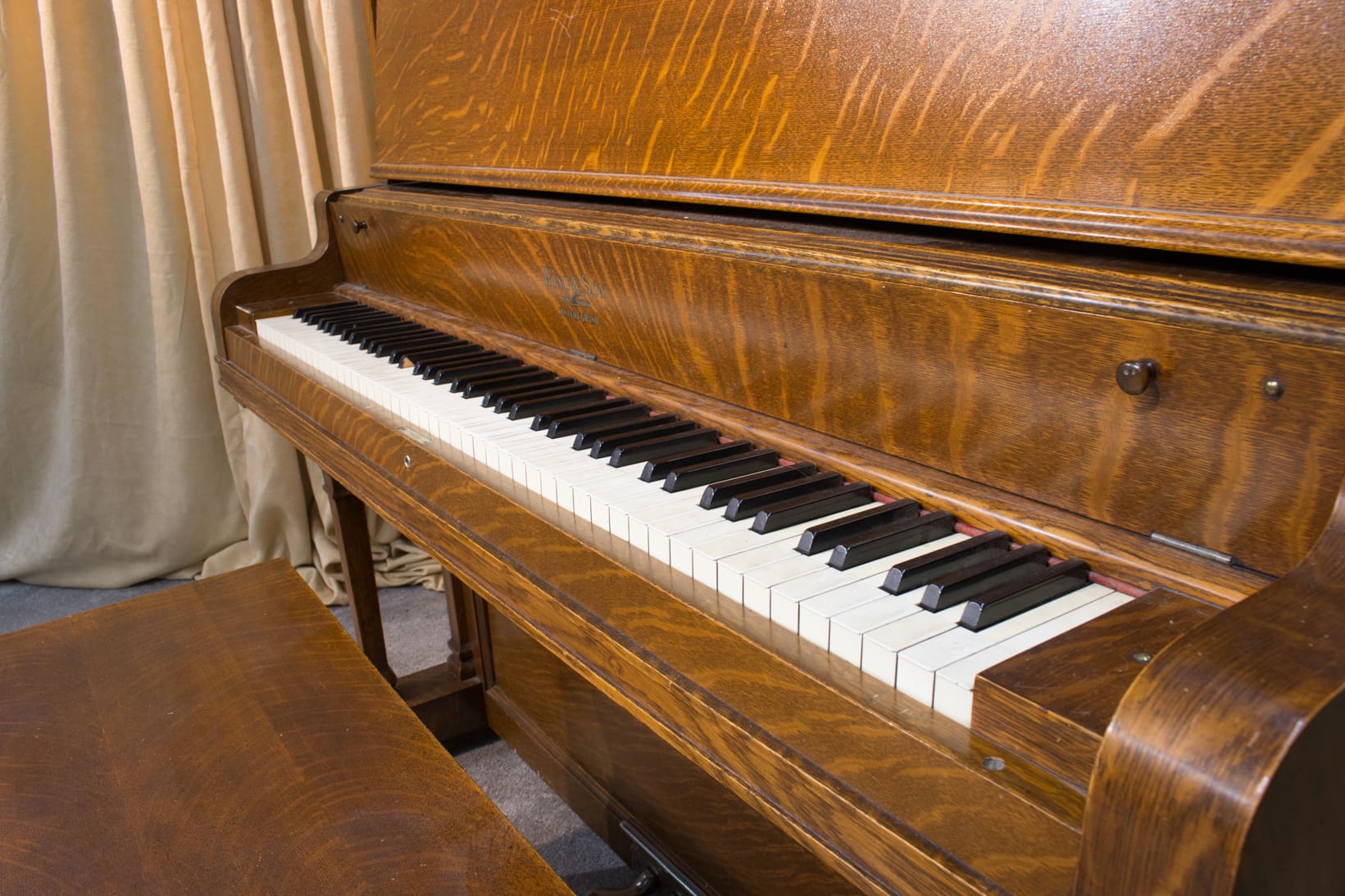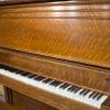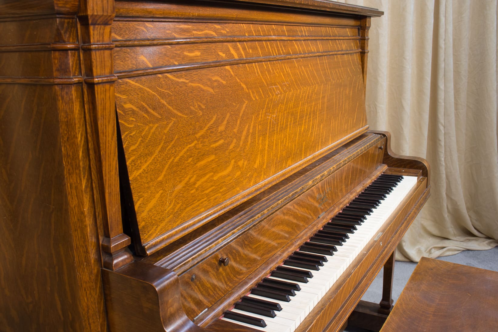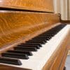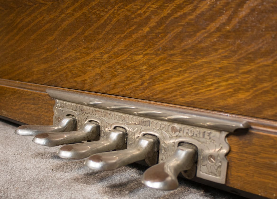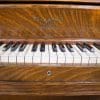 This piano was originally sold as the “Style 27” in lovely quarter sawn oak wood. Rather than being elaborately carved, this piano offers balanced elegance through simple lines and beautifully-figured oak wood grain. This piano is equipped with Wing & Sons exclusive 5 pedal mechanism which allows the pianist to mimic sounds of the mandolin, banjo, harp, and zither. It is such a delight to hear one of these pianos after professional restoration! When not engaged, the piano plays normally without any interference from these pedal attachments.