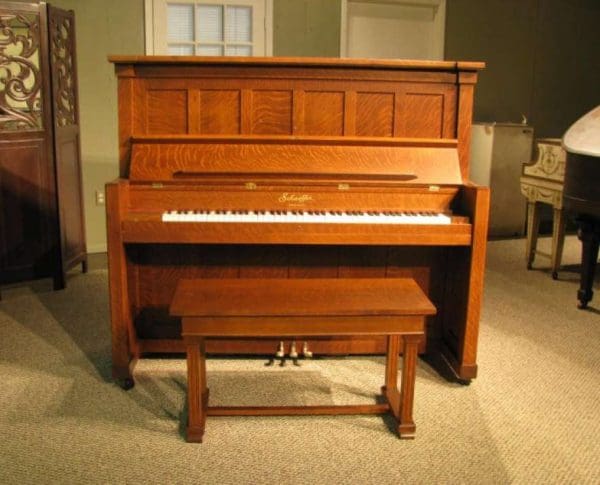 This is an amazing Schaeffer Arts & Crafts style piano in stunning quarter sawn oak. This design was known as the “Library Model”, with elegantly paneled sides, front, and bottom boards. It is rare to find an Arts & Crafts/Mission style upright piano of this caliber and design. They are truly among the rarest of the rare. This piano has been restored to perfection inside and out. Computerized player mechanisms can be installed at an additional cost if desired. A matching bench is included.