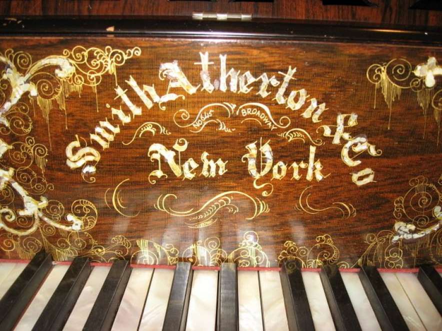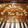 This is a stunning square grand piano built by the Smith-Atherton Piano Company of New York City during the height of the lavish Victorian era. It is made of Brazilian Rosewood, and the keyboard is made entirely of Mother-Of-Pearl instead of ivory! Both exquisite Mother-Of-Pearl inlay and hand painted designs of wildlife and flowers grace the front panel of the instrument. This piano would have been one of the most elaborate, expensive instruments of its time. This piano will be restored to like new condition inside and out. An original matching stool is included.