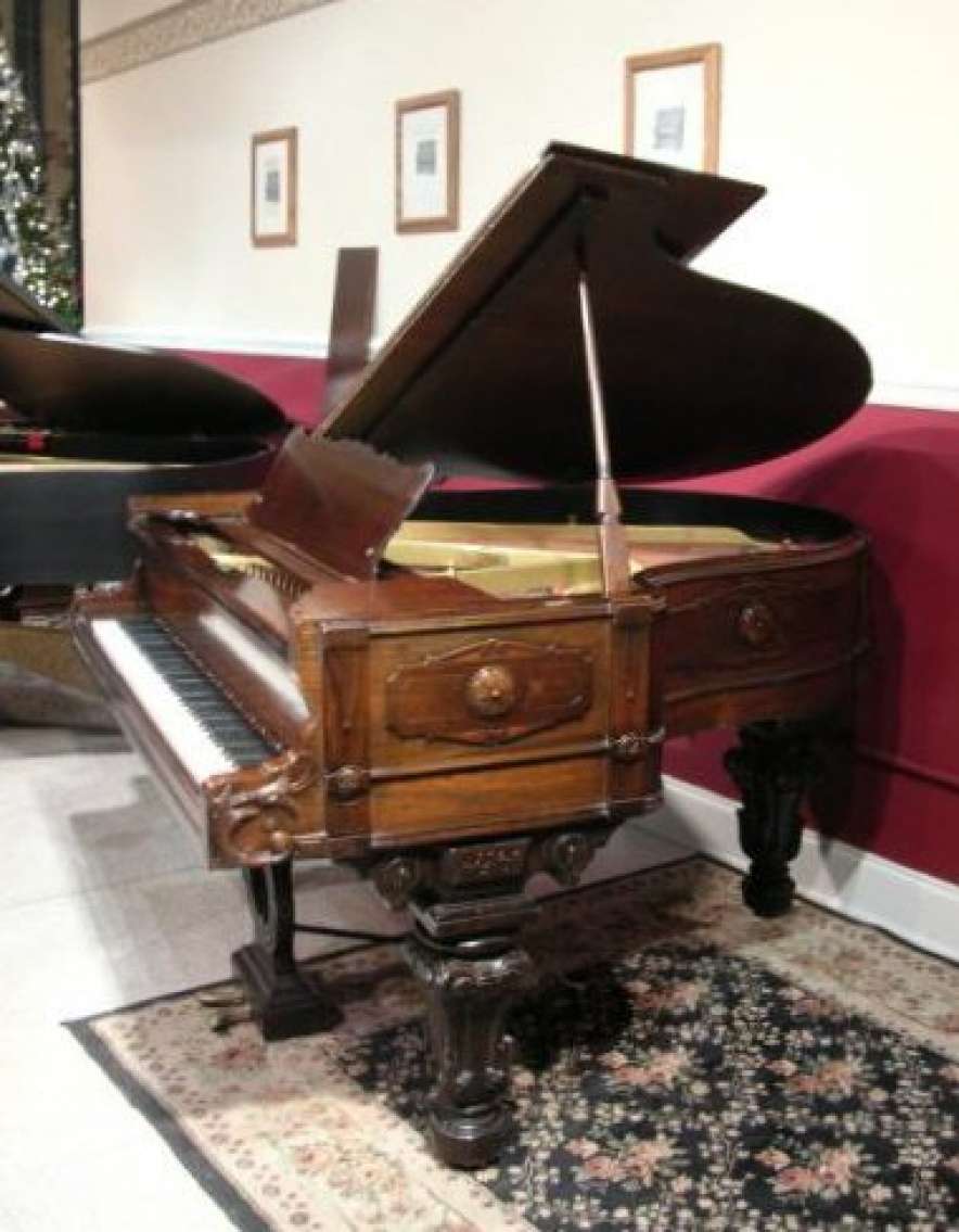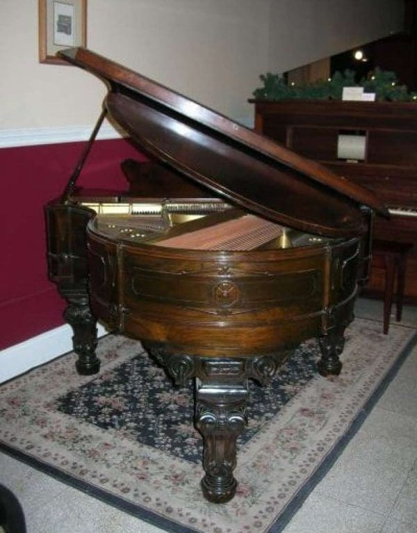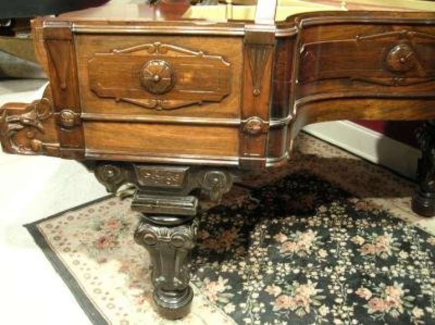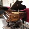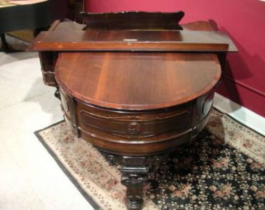 This piano is made of highly carved rosewood, and is unusual in that it is curved on both sides as opposed to being curved only on the right side. Note the elaborately carved shields and molding all around the entire case. The tone and touch of this piano is just breathtaking! Since this piano is only 5 feet long, it would be ideal for someone wanting a Victorian period piano who has limited space. This is the only piano of this kind we have ever seen. It can be equipped with computerized player mechanisms if desired.