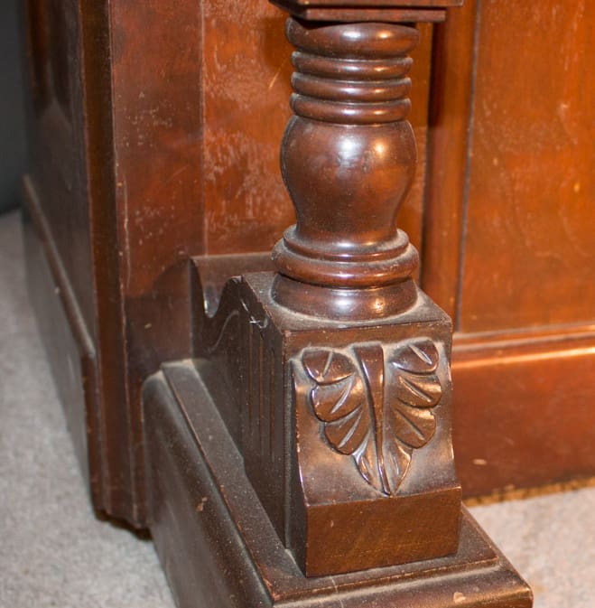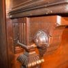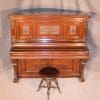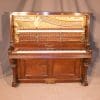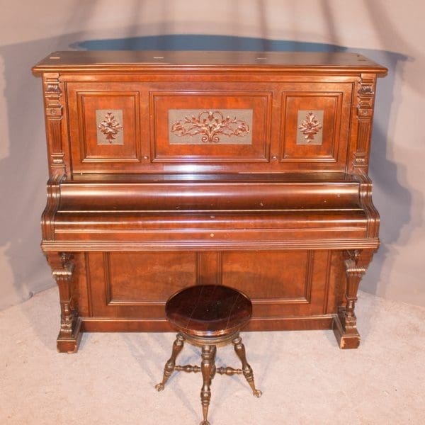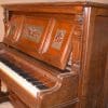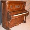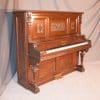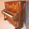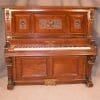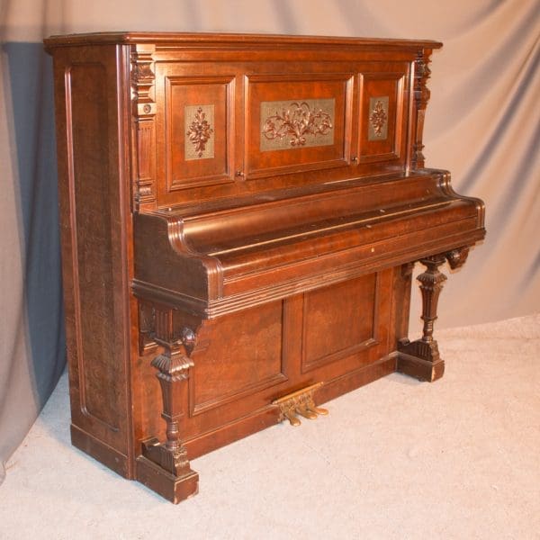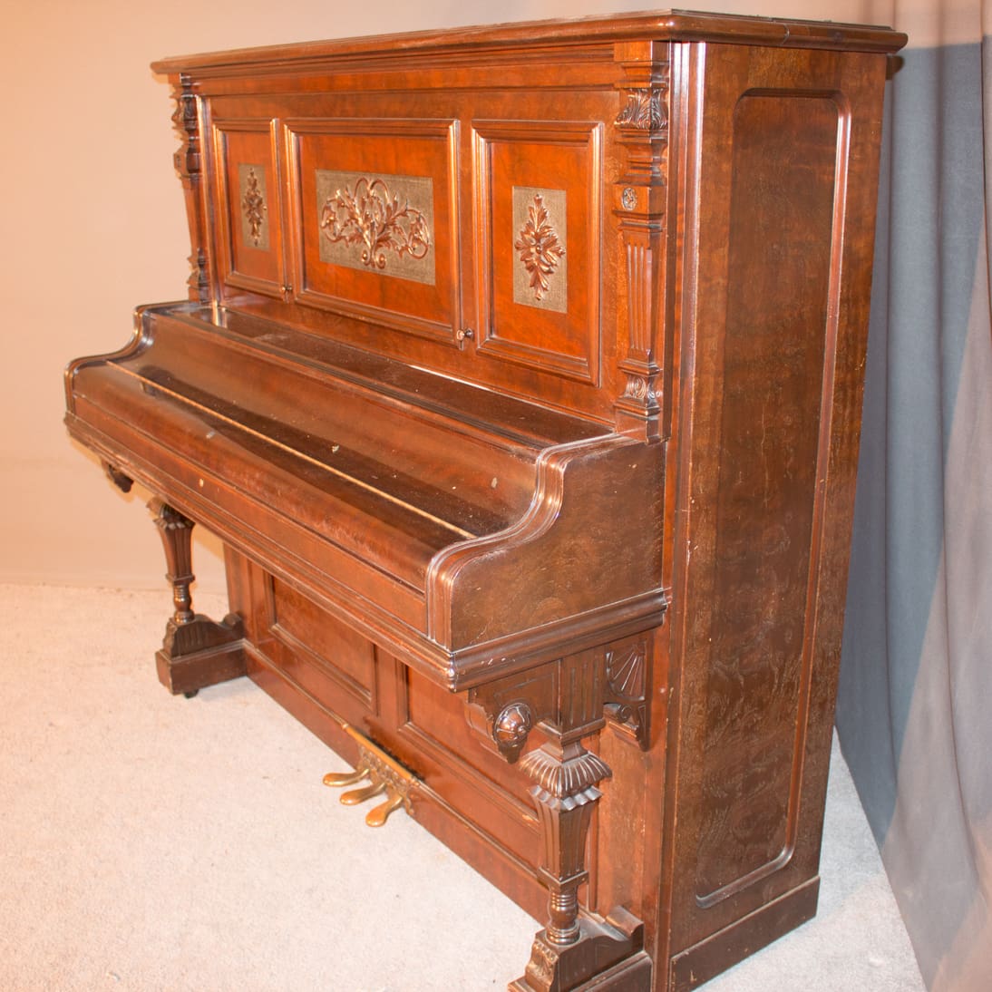 This piano is made of beautiful book-matched wood and is of the carved Victorian style. Although the cabinet is beautifully carved, it is also beautifully proportioned with an overall elegant appearance. This model is a full-size “upright grand” which will have the sound of a full grand piano after professional restoration.