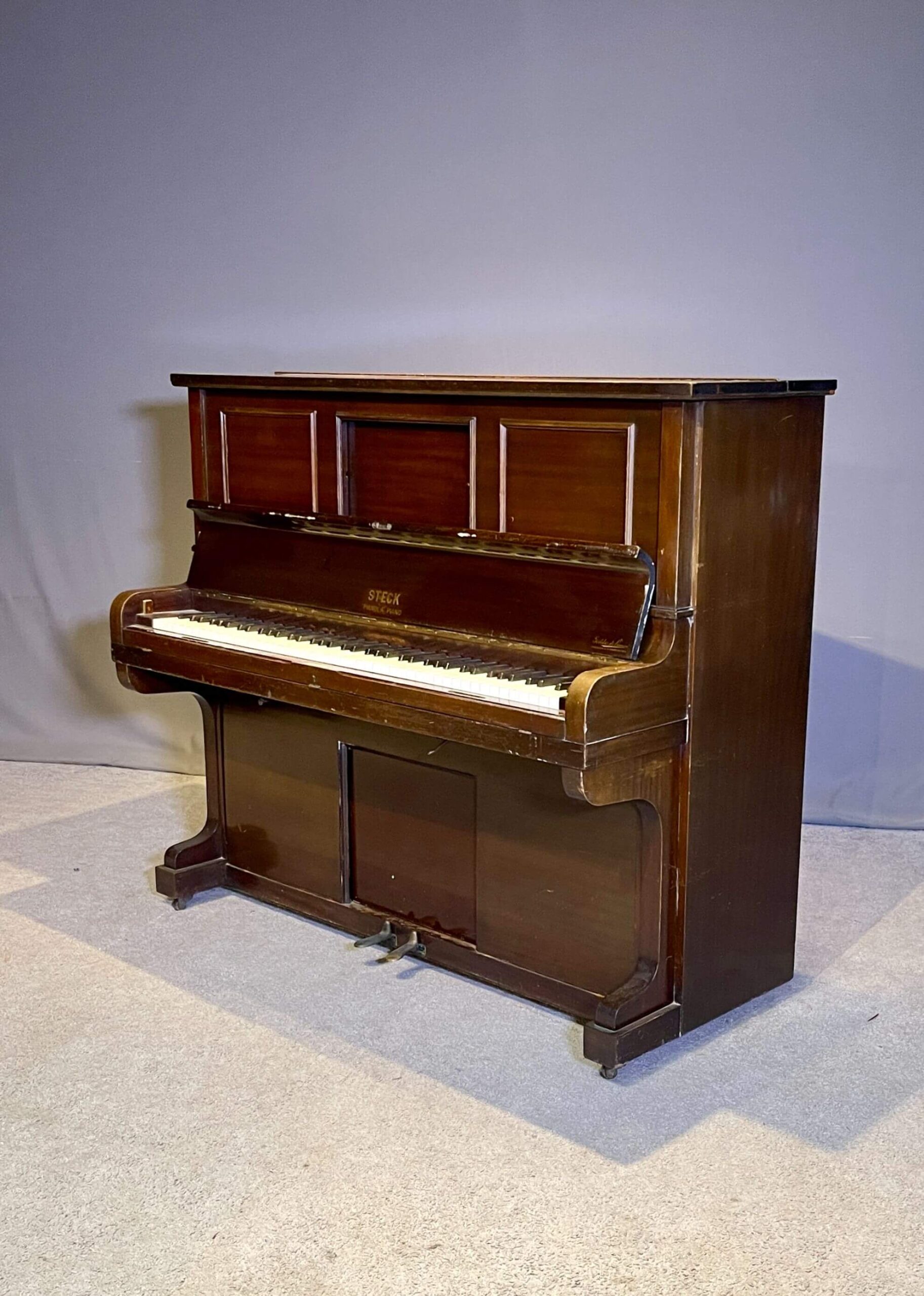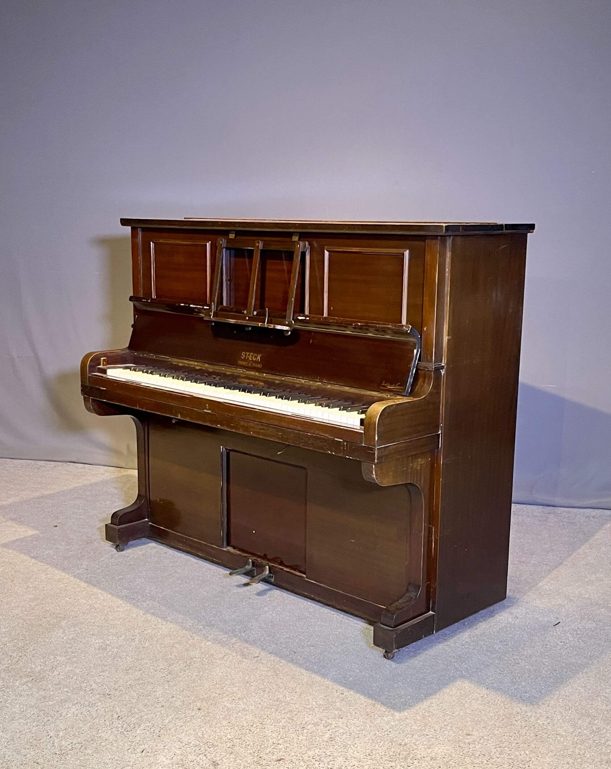 This particular instrument was built in 1923 at the Steck factory in London for the European market and later imported to the United States by a previous owner. While George Steck pianos built in New York remain relatively common in the U.S., those produced in the London factory are considerably rarer and highly collectible.