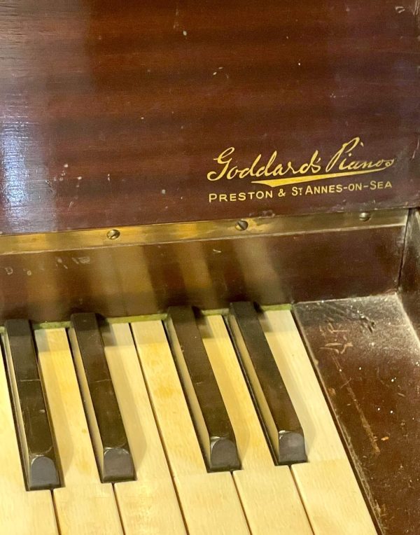 Another historical detail of note is the original dealer label indicating the piano was sold by “Goddard’s Pianos, Preston & St Annes-on-Sea,” a seaside resort town near Blackpool on England’s northeastern coast. The underside of the foot pedals also displays a series of international patent numbers, granted in the United States, Great Britain, France, Germany, and Austria.