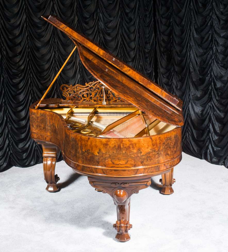 This lovely piano is a rare carved Rococo style Model “A” Steinway in a custom exotic black walnut burl wood cabinet. Note the lovely carved serpentine legs and elegant music rack and pedal lyre. Although this carved Rococo style was quite popular in larger Steinway models, it is seldom found on a piano of this size. This instrument is finished in a stunning high gloss polished finish which makes it look absolutely new in every way. The touch and tone of this piano are of the best quality, and the instrument is overall very impressive. The piano has been totally restored to like new condition inside and out, and is absolutely like new in absolutely every detail.