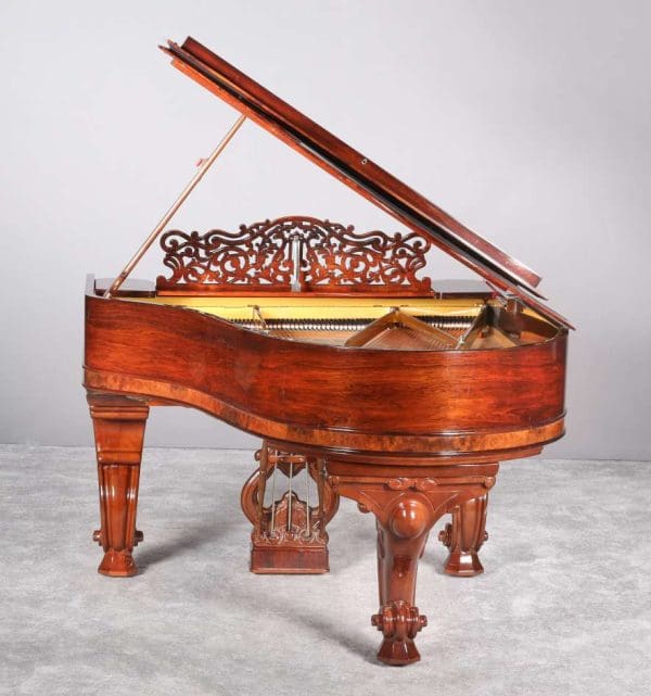 This lovely piano is a rare carved Rococo style Model “A” Steinway in a custom designed cabinet. The body of the piano is made of endangered Brazilian Rosewood which is accented by exotic burl wood banding and inlay around the base of the cabinet, music rack and name plate. Note the lovely carved serpentine legs and elegant music rack and pedal lyre. Although this carved Rococo style was quite popular in larger Steinway models, it is seldom found on a piano of this size. This instrument is finished in a stunning high gloss polished finish which makes it look absolutely new in every way. (The piano can be rubbed out into a traditional satin rubbed dull finish is an “old world” satin patina is desired). The touch and tone of this piano are of the best quality, and the instrument is overall very impressive. The piano has been totally restored to like new condition inside and out, and is absolutely like new in absolutely every detail.