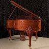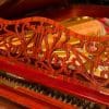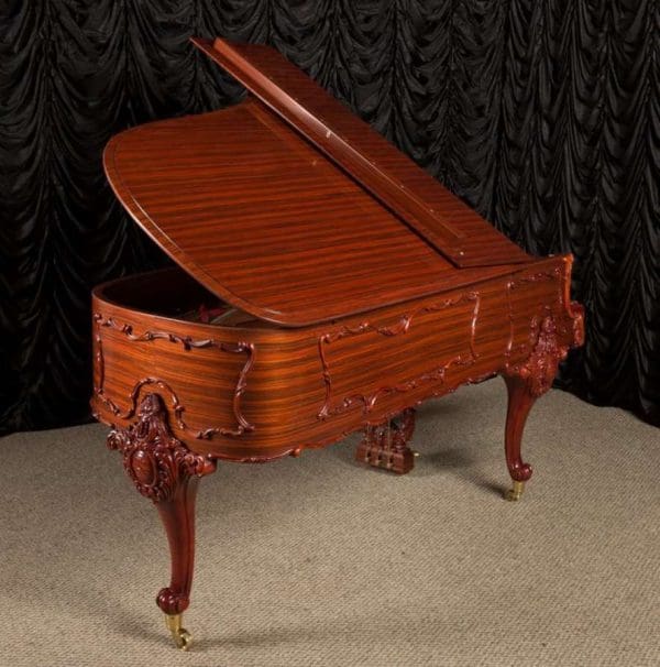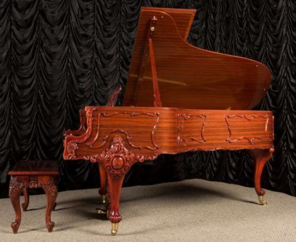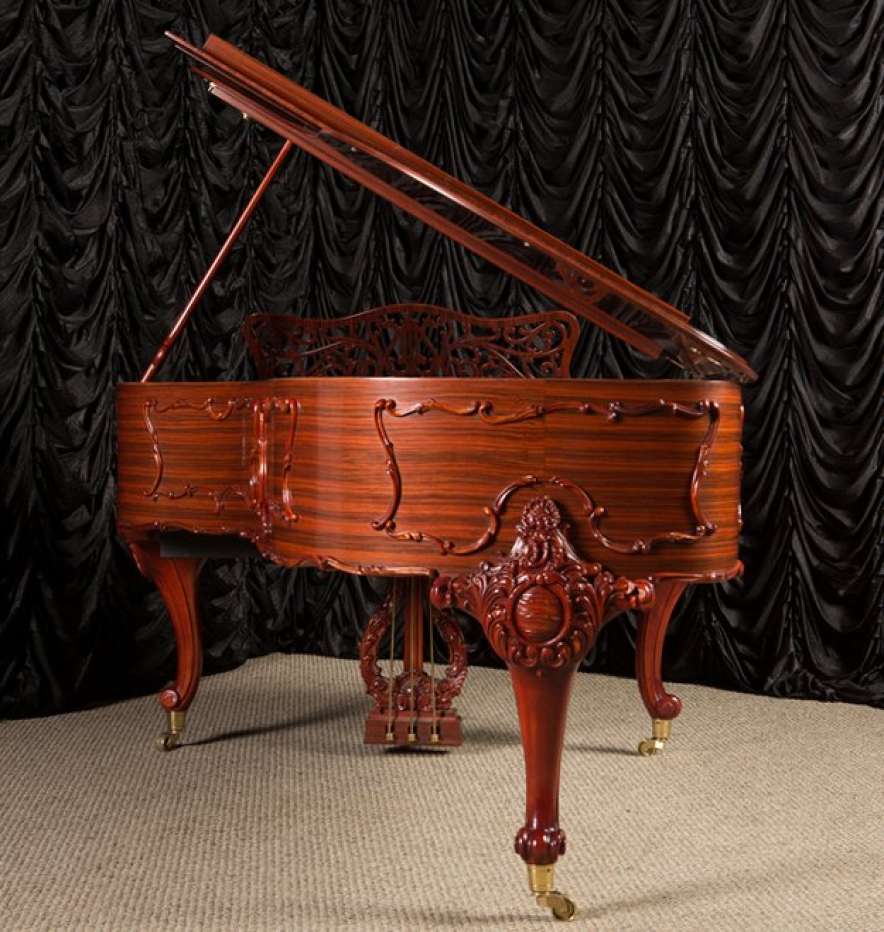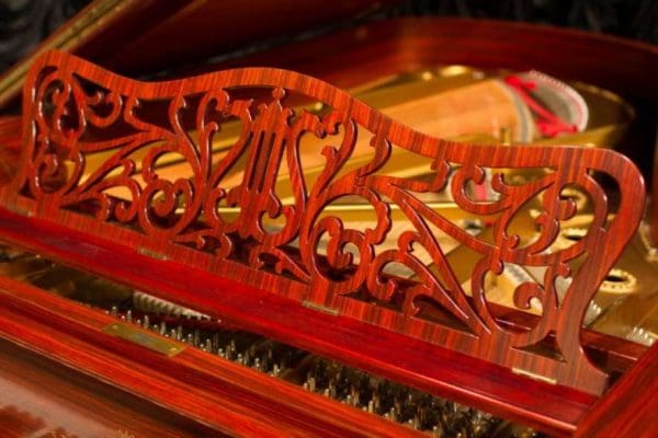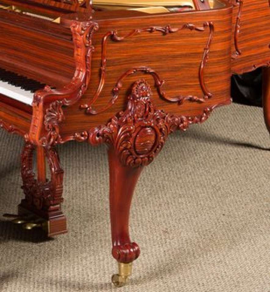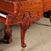 Although this is a large concert size piano, it has an overall delicate and formal appearance. Note the elaborate picture frame carved panels around the entire outside rim of the cabinet. The piano is made of an exotic Indian Rosewood which has a depth and color unlike anything found on contemporary instruments.