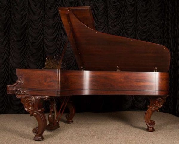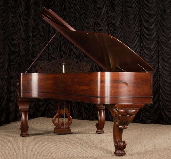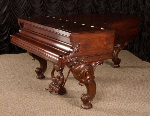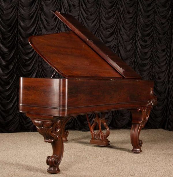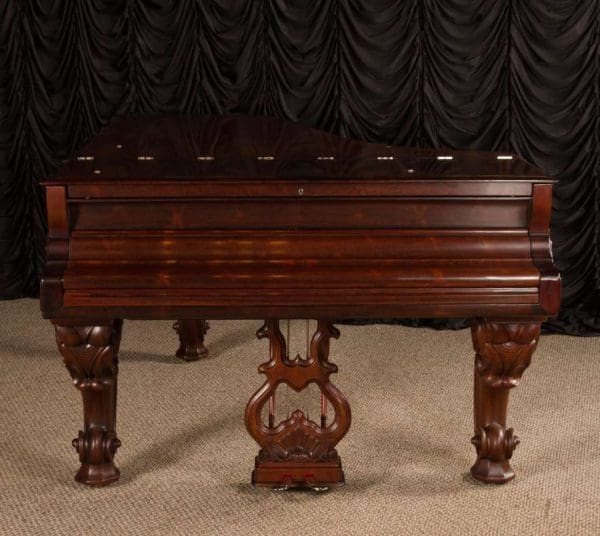 This piano, known today as the “Early Parlor Grand”, was built by Steinway & Sons in 1869, just a few short years after the Civil War. This model was originally sold by Steinway as the “Style 1” grand piano, a style that Steinway produced from 1861 – 1879. When this piano was built, the majority of pianos built by Steinway were square grand pianos, with only a small fraction of Steinway pianos being of the grand or upright type. It is made of the desirable cabriole leg style with carved music rack and pedal lyre. Steinway grand pianos this early are quite rare, and the majority of surviving instruments are not in playable condition. This instrument has been restored with an entirely new action of modern design so that it plays and sounds like a newer conventional concert grand piano. It is truly a spectacular instrument to see and hear. This piano is made of Brazilian Rosewood and is of the Rococo Victorian style with heavily carved Cabriole Legs, pedal lyre and music rack. Brazilian Rosewood is nearly extinct and is endangered today. It is nearly impossible to get in the United States and is very desirable as a result. This piano has been finished in a soft hand-rubbed satin finish which gives it a very beautiful “old-world” antique patina.