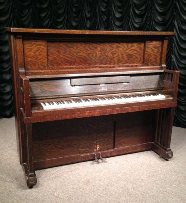 This is a very unusual Library Mission style player piano by the Sterling Piano Company of New York. Sterling built very high quality pianos during the early 20th Century, and they were one of the few manufacturers to offer several different varietys of Arts & Crafts/Mission style cases on their instruments. Built in 1916, this piano was one of the last true Craftman pianos Sterling built; just as the Arts & Crafts movement was coming to a close. This piano is especially unique because it is made of a straight-cut grain of oak rather than the quarter sawn oak wood found on most pianos. It features beautifully style Mission style post legs with pyramid accents. Note how the mulitple Mission style post legs are reflected above the keyboard, giving the instrument a beautiful symmetry overall.The piano is being restored to like new condition. The piano does play by itself by using a perforated paper roll. One originally had to pump the pedals to get the piano to play, but we can install an electric motor inside the instrument so that one can either pump the pedals or flip a switch to make it run.An original matching Mission style piano bench is included.