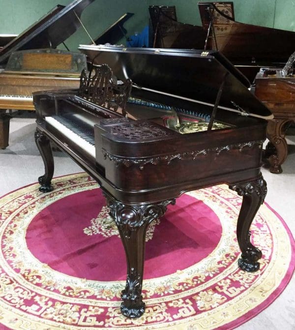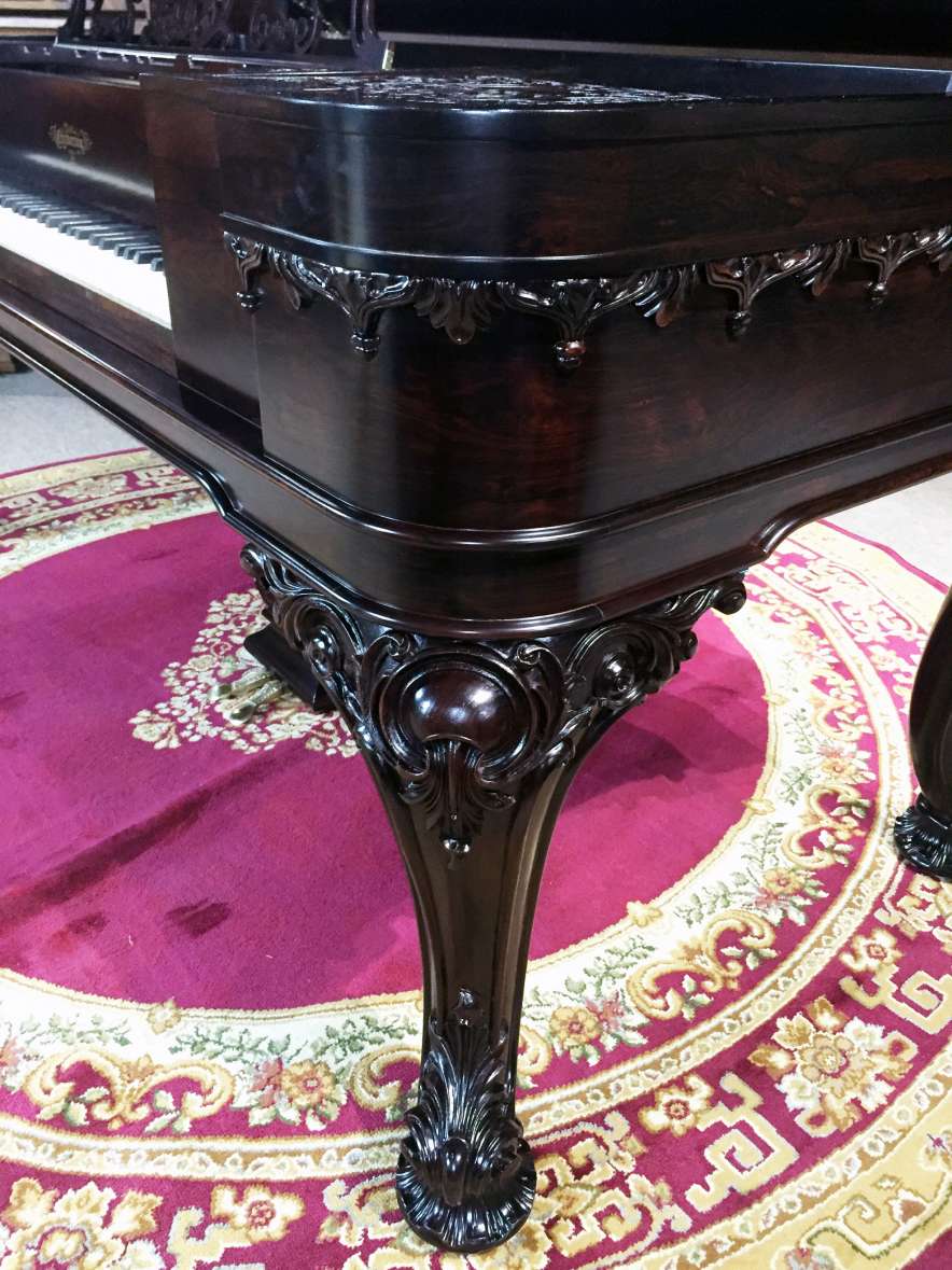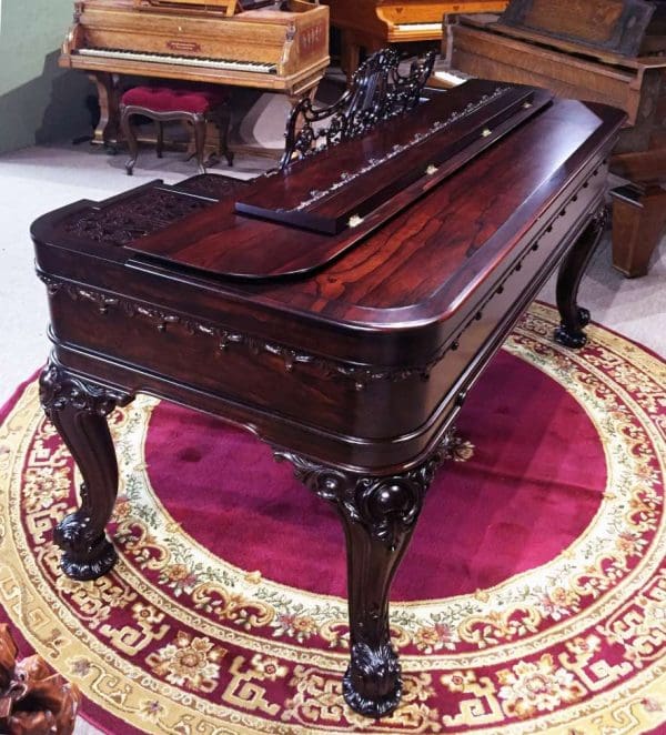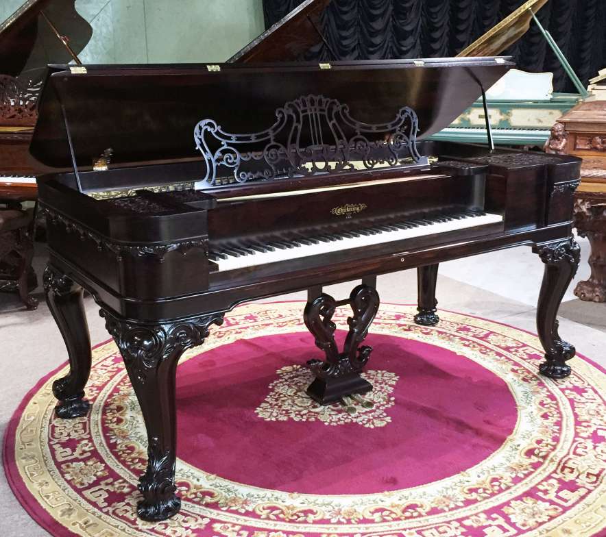 Chickering was the first piano manufacturer in America, established in 1823. This lovely piano was built about a decade prior to the Civil War, and is one of the lucky instruments to survive over 150 years in the Southern United States. It is made of Brazilian Rosewood, and is made in a more delicate Rococo Revival style. Note the beautifully carved legs and the elaborately carved moldings, all hallmarks of this classic style. Only a wealthy few could afford this type of instrument in the early 19th Century. This piano is a bit smaller and more dainty in appearance than most square pianos, making it ideal for someone with limited space. This piano is being restored to like new condition.