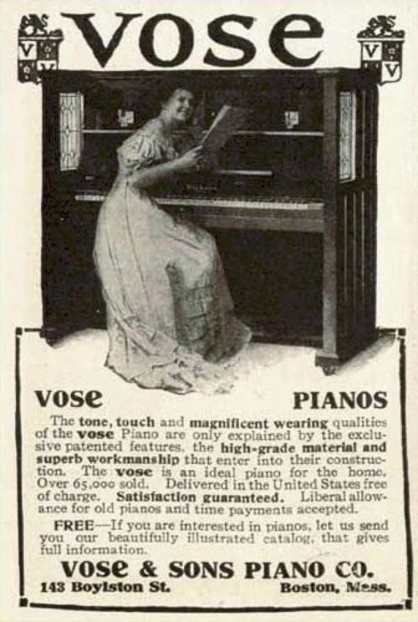 The Vose & Sons Model O Library Model Piano was originally offered with leaded glass panels. This particular piano would have most likely been custom ordered with solid wood panels rather than glass.