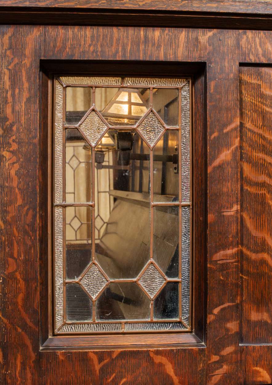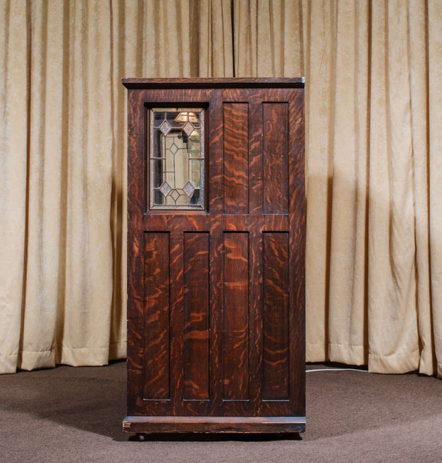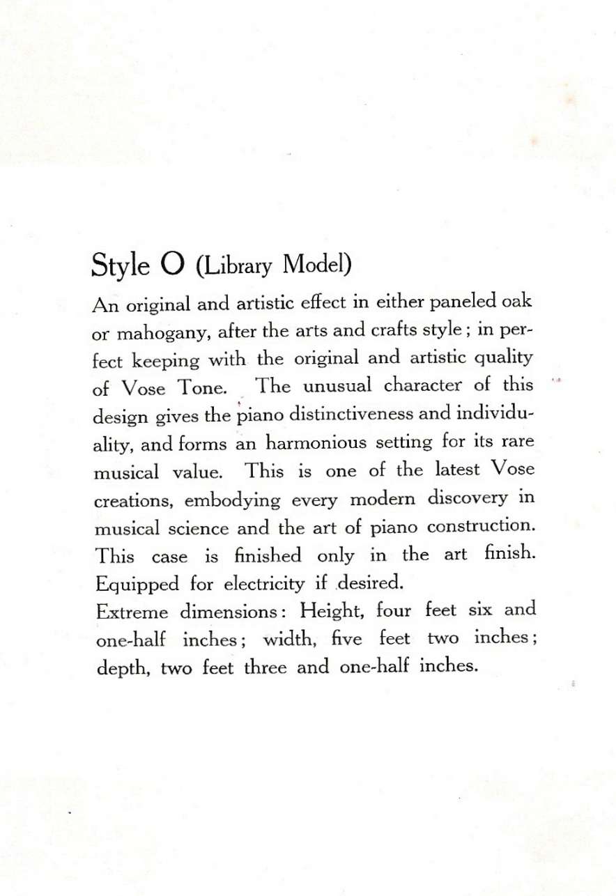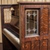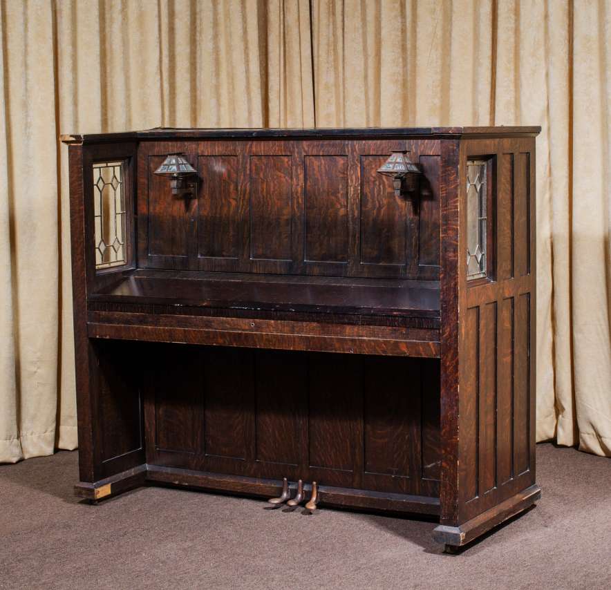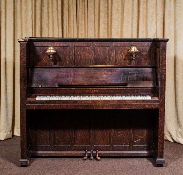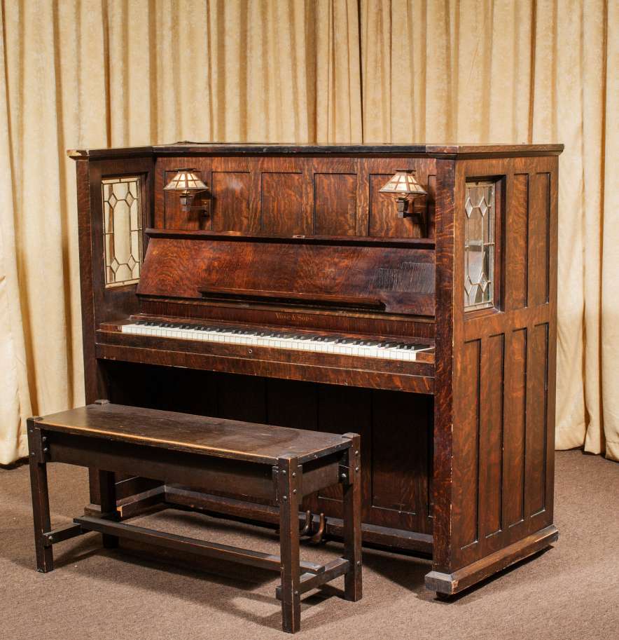 This beautiful piano was built during the height of the Arts & Crafts era, and is one of only a handful of Craftsman style pianos offered by the Vose Piano Company. Sold in 1911 as the “Style O Library Model”, this piano features beautiful original leaded glass panels on either side of the keyboard and Mission style electric lanterns with acorn pulls on either side of the sheet music holder. Made of beautiful quarter sawn oak wood, this piano is made in a simplistic yet stunning Mission design that accentuates it’s lovely woodgrain. This piano is being restored to perfection inside and out. It can be ordered with computerized player mechanisms if desired. A matching bench is included.