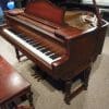 This exquisite “Duo-Art” grand piano was built by the famous Weber Piano Company in 1925, the “Golden Age” of piano building in America. This piano is of the rare and desirable “Louis XVI” style in walnut wood. Note the elegant burl wood panels that adorn the sides of the piano, giving the piano a “two tone” depth of color and wood grand that is rich and formal in appearance. It has been our experience that these Weber pianos are among some of the most well made pianos built in America during the early 20th Century. A matching bench is included.