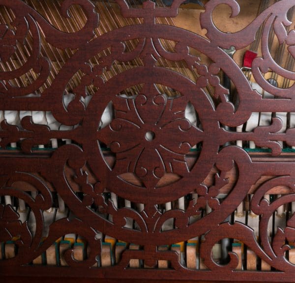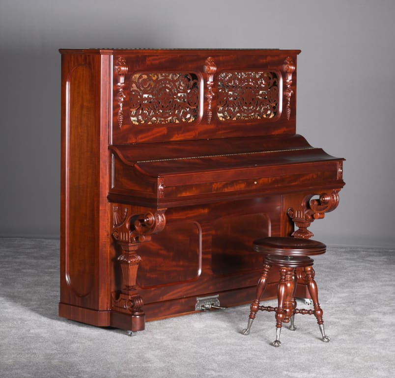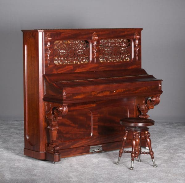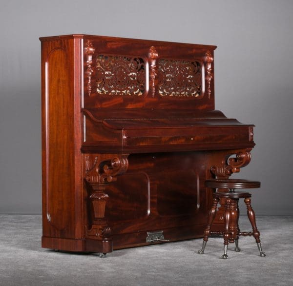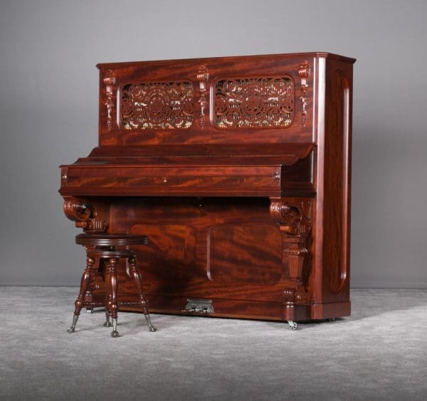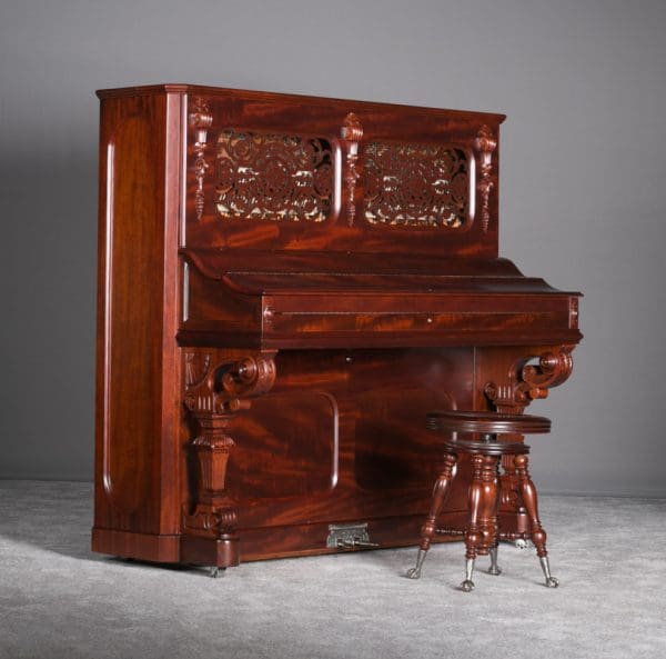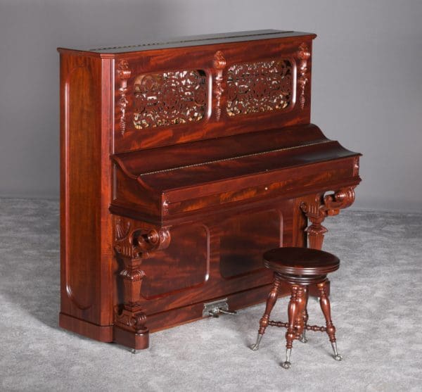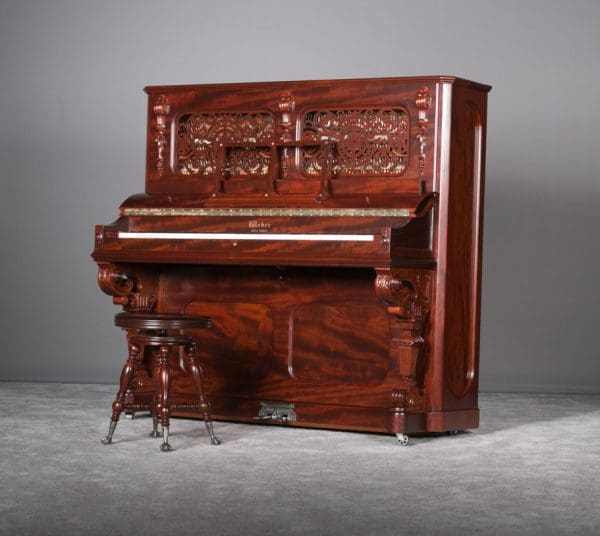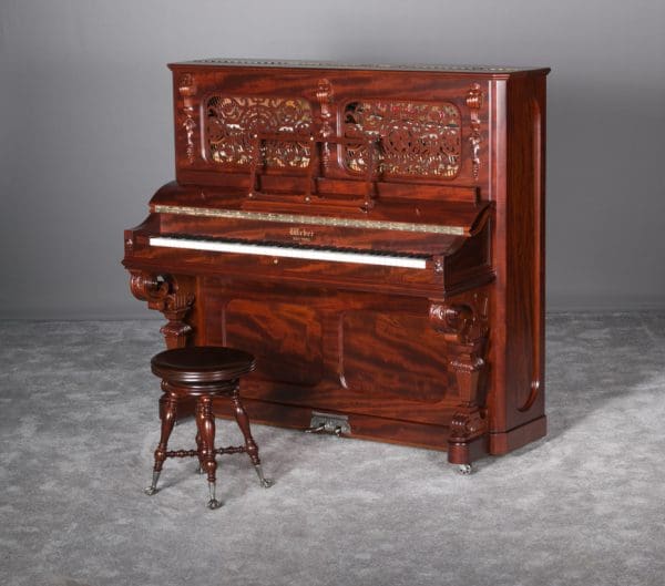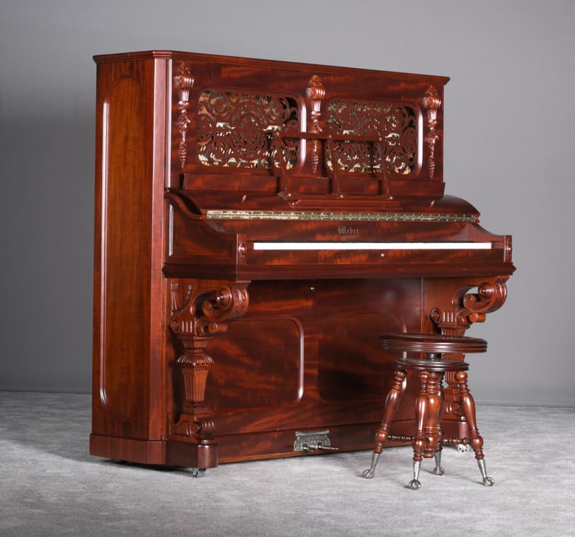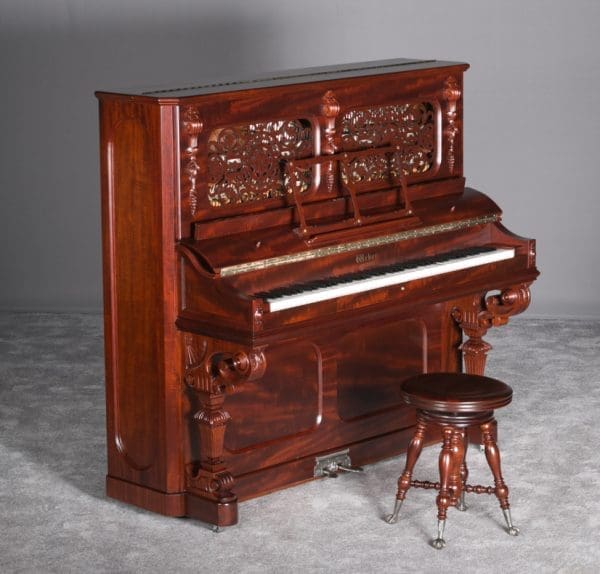 This Weber upright piano is a full size, hand made instrument made in the highly elaborate Rococo style, with beautifully carved legs, moldings, and fretwork. Weber was established in 1852, a year before Steinway, and they built some of the most expensive, well made pianos of the 19th Century. The Weber name has been built consistently ever since, but today Weber pianos are being built overseas. We have restored several Weber upright and grand pianos, and find them to be consistently about the best pianos we have ever seen. Only the wealthy could afford such luxury, hence the rarity of these pianos today. This is truly a magnificent piece of Victoriana at it’s finest. A matching stool is included. This piano can be equipped with computerized player mechanisms if desired.
