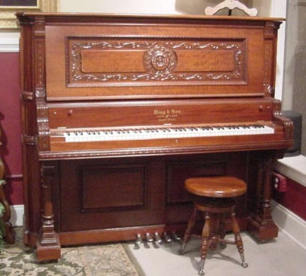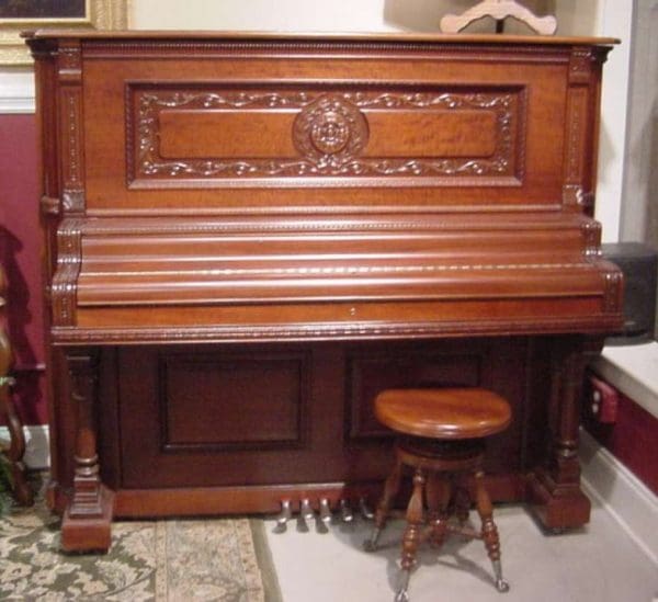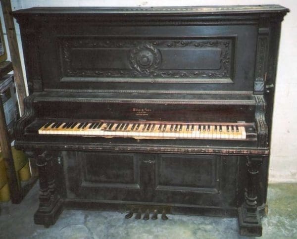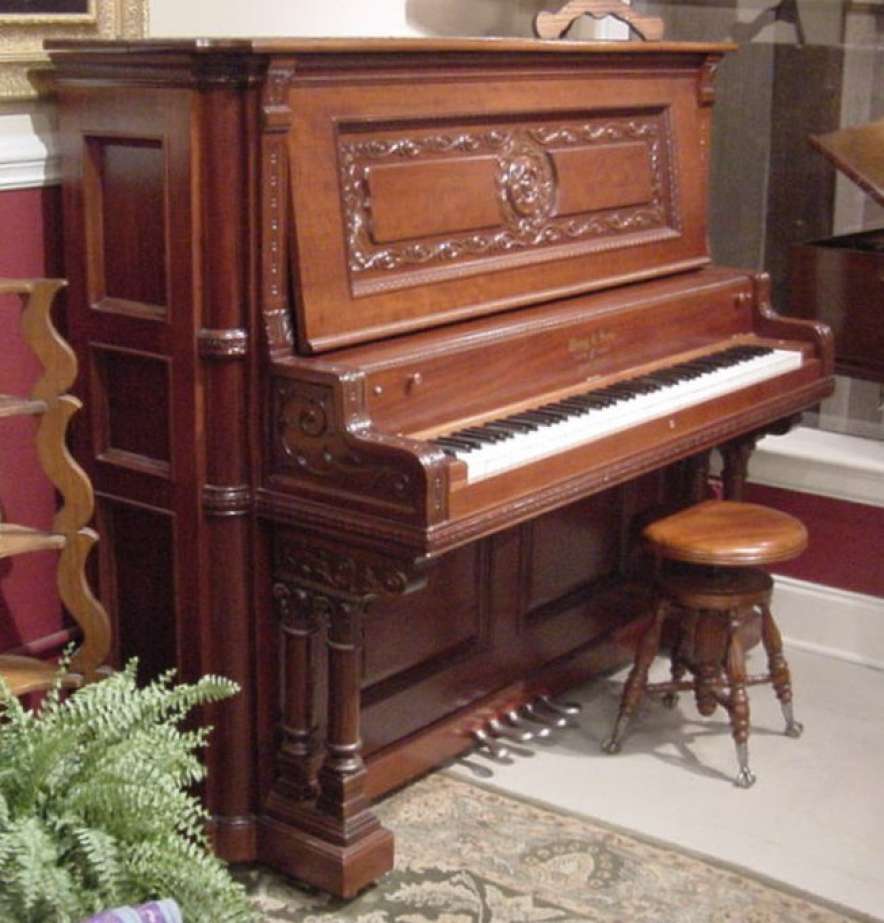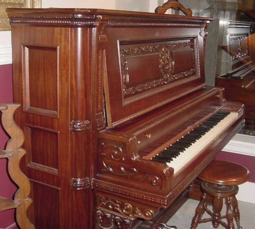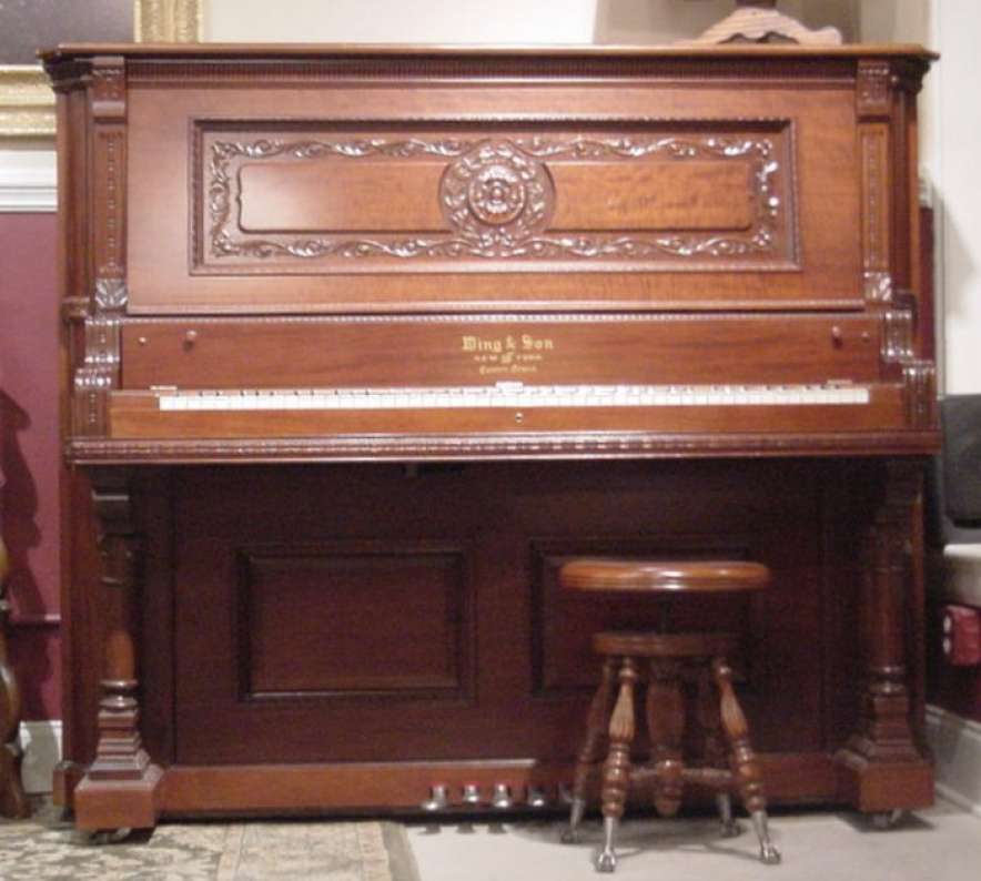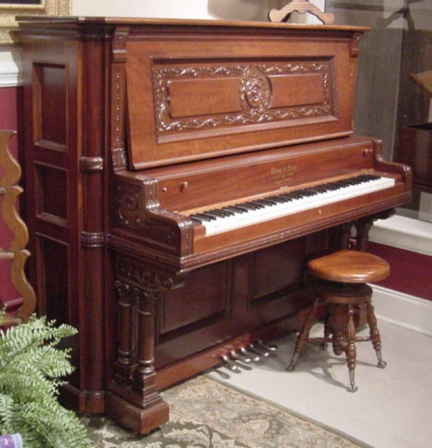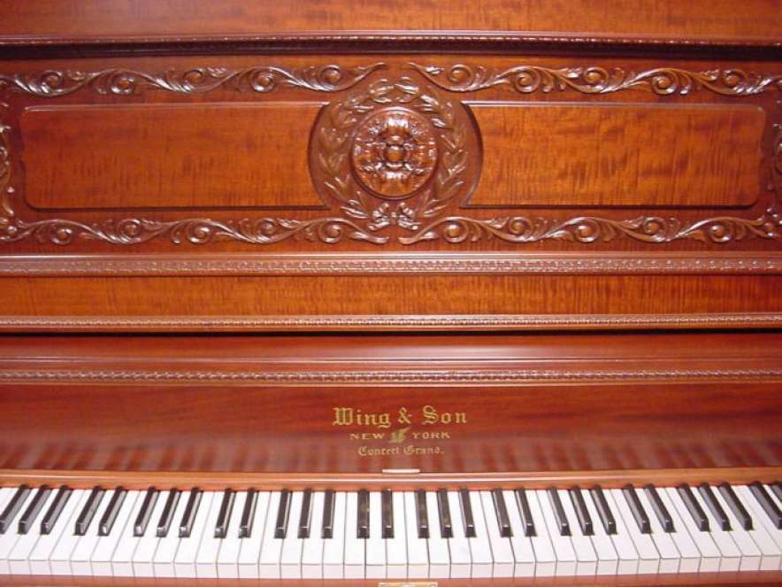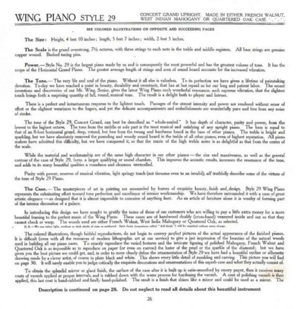 The Wing & Son Piano Company had a reputation for building only high quality pianos and sold them exclusively from their lavish mail order catalogs. They were most popular for their 5-pedal “Orchestral Attachments” which mimicked harp, zither & mandoli