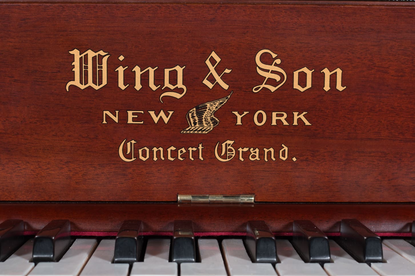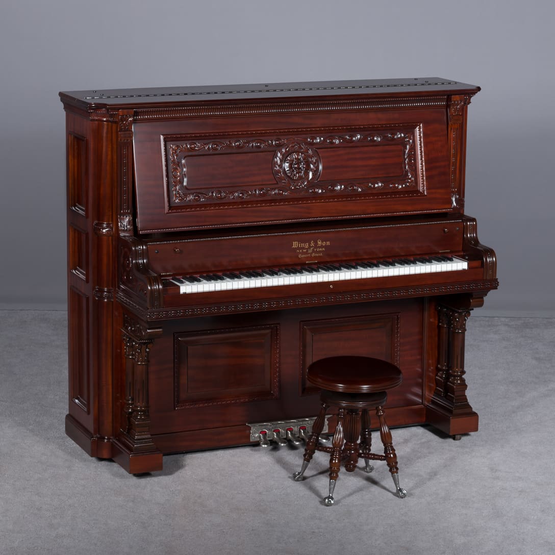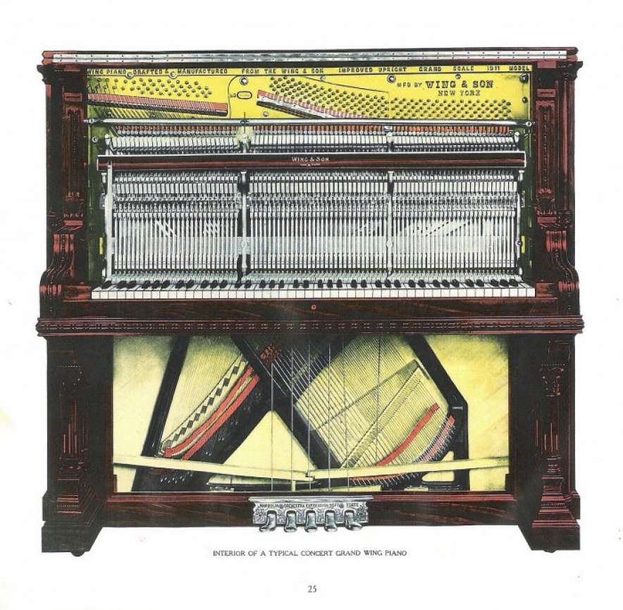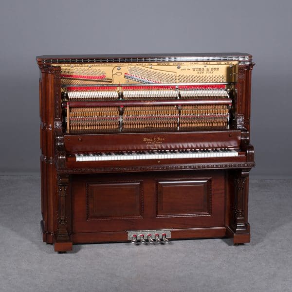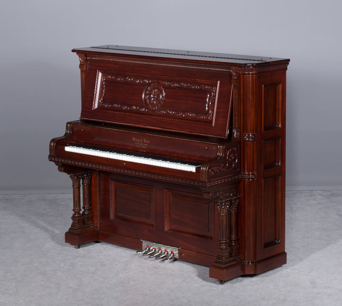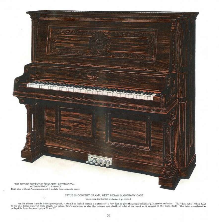 The Wing & Son Piano Company had a reputation for building only high quality pianos and sold them exclusively from lavish mail order catalogs. They were most popular for their 5-pedal “Orchestral Attachments” which mimicked harp, zither & mandolin