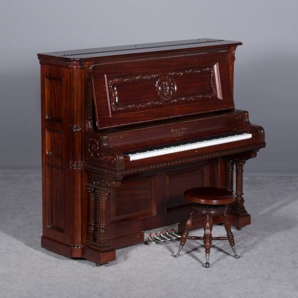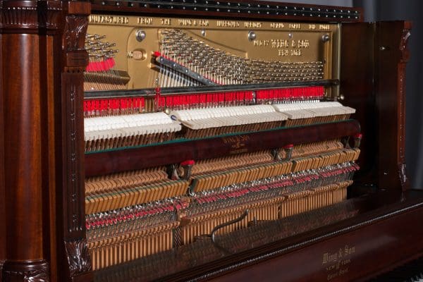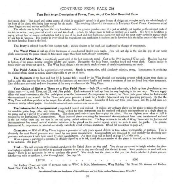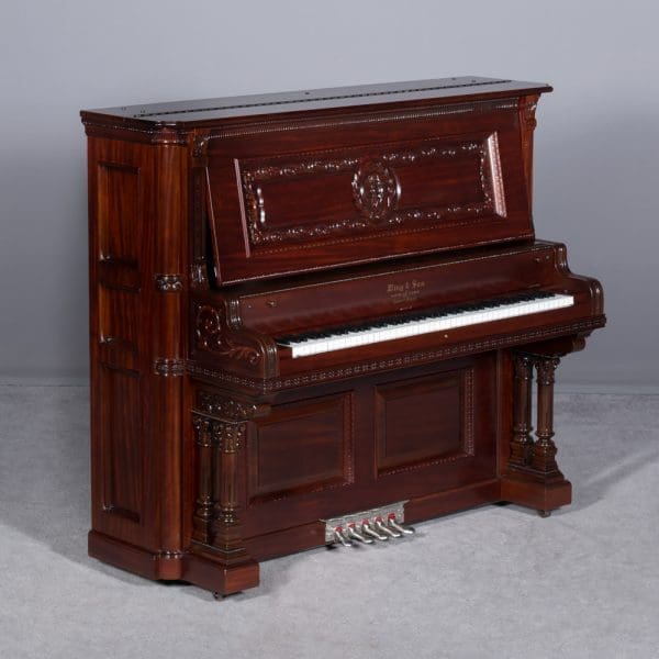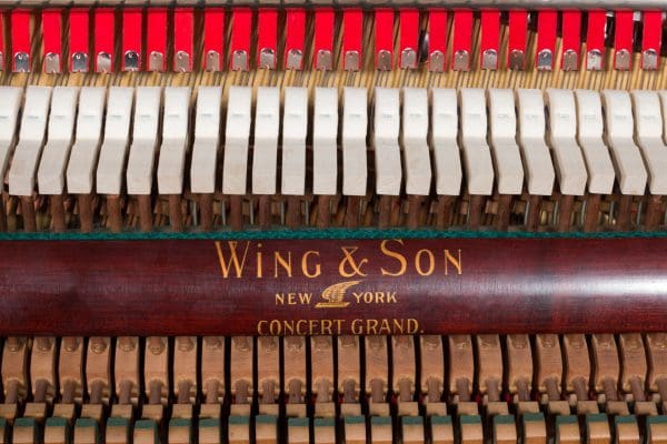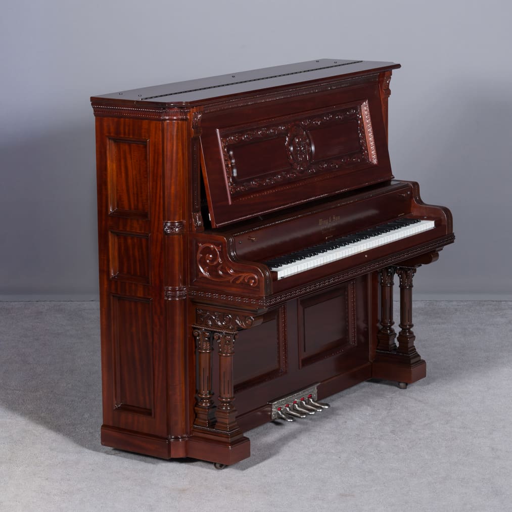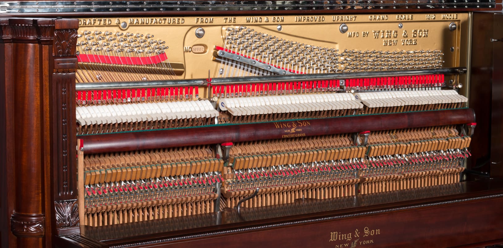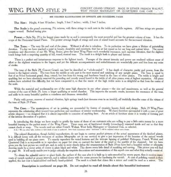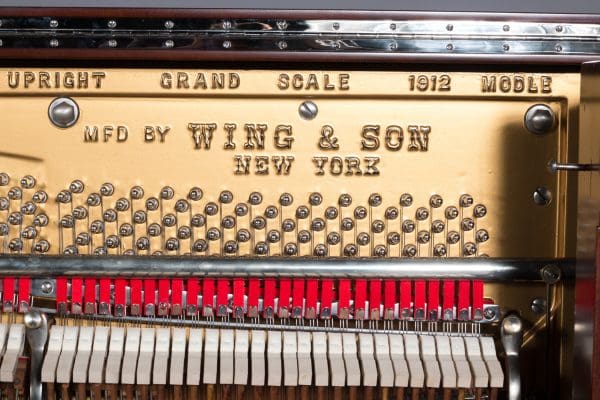 The Wing & Son Piano Company had a reputation for building only high quality pianos and sold them exclusively from lavish mail order catalogs. They were most popular for their 5-pedal “Orchestral Attachments” which mimicked harp, zither & mandolin