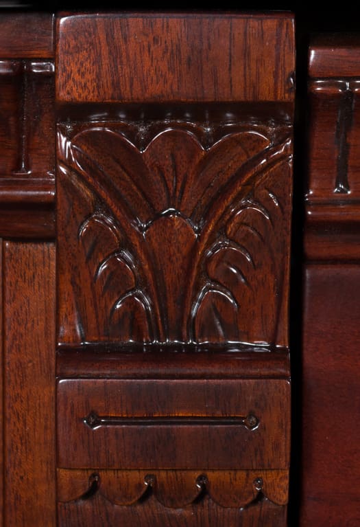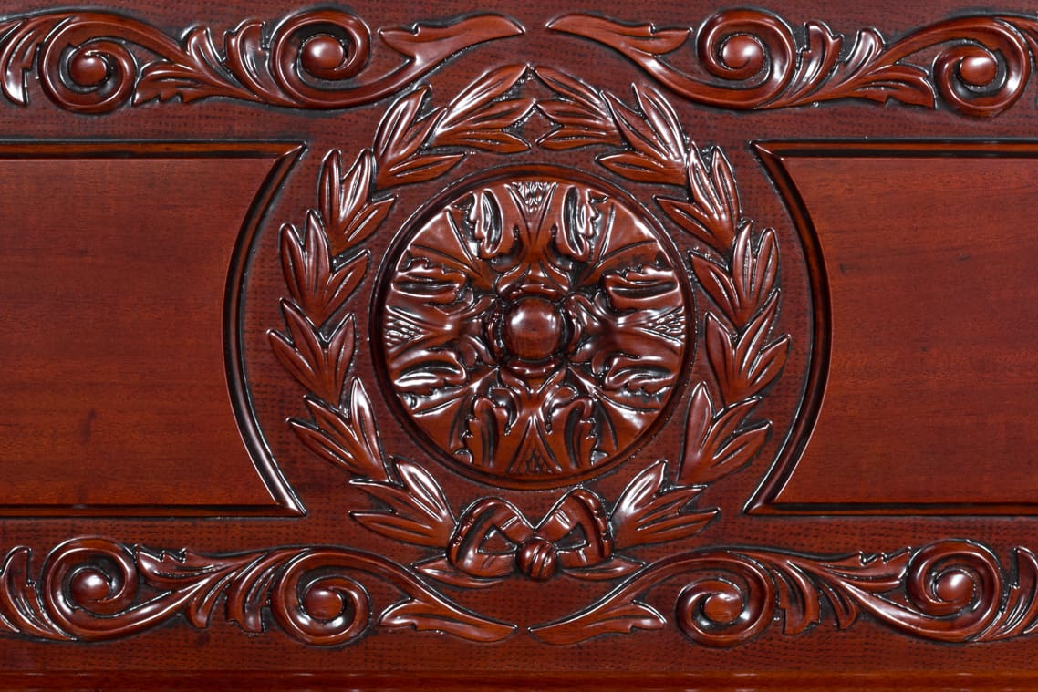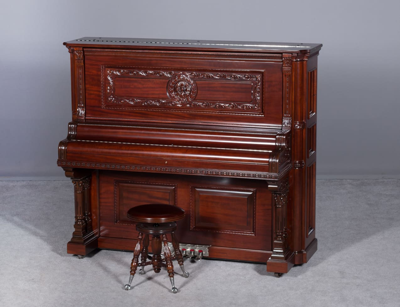 This is a very rare Wing & Son 5 pedal orchestral upright grand piano in beautiful mahogany wood. It has beautifully carved panels, richly detailed moldings, and elegant paneled sides. The Wing & Son Piano Company had a reputation for building only high quality pianos and sold them exclusively from their lavish mail order catalogs. This particular piano was sold as the Style 29 Concert Grand according to its original sales catalog (see photos). Some of these pianos were equipped with 5 pedals, which mimic sounds of the mandolin, banjo, harp, and zither. One cannot imagine how delightful it is to listen to one of these pianos when properly restored, and this piano is generally a favorite among our guests. When not engaged, the piano plays normally without any interference from these pedal attachments. The sound and touch of these Wing pianos is unmatched, as they are truly magnificent, rare, and wonderful instruments. This piano can be fitted with computerized player mechanisms if desired.