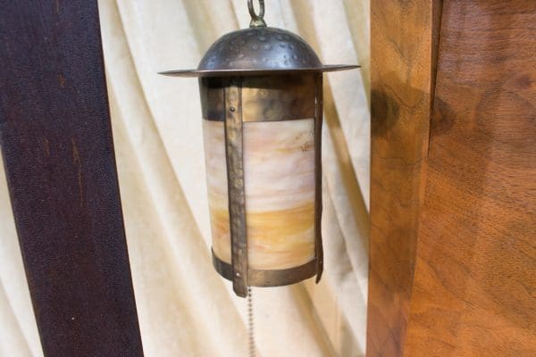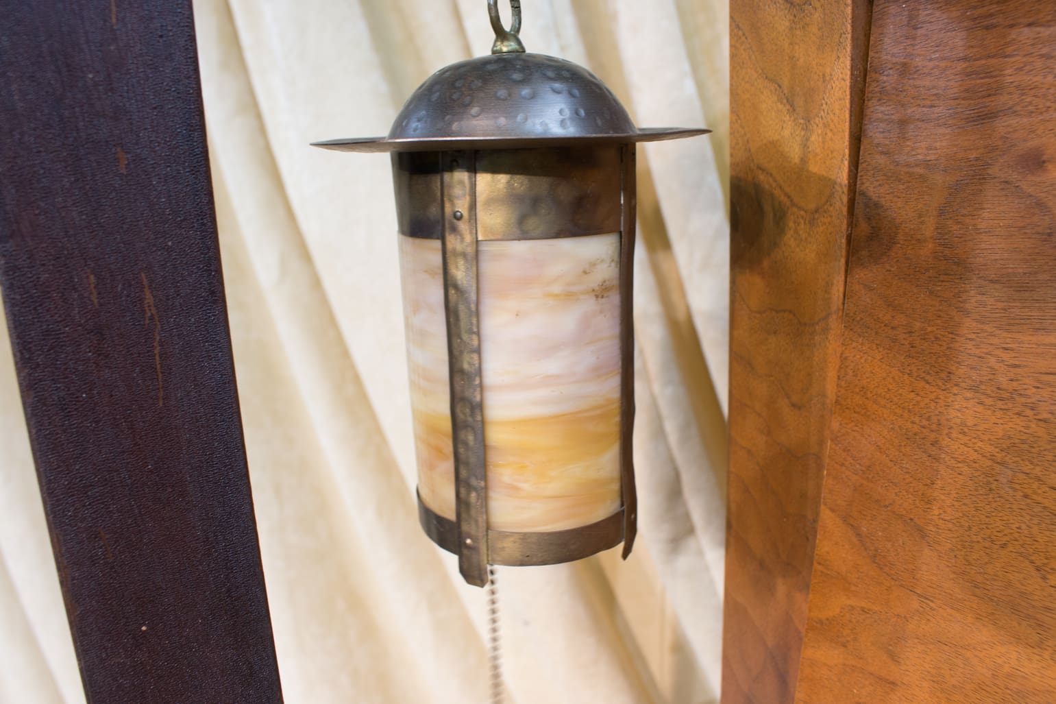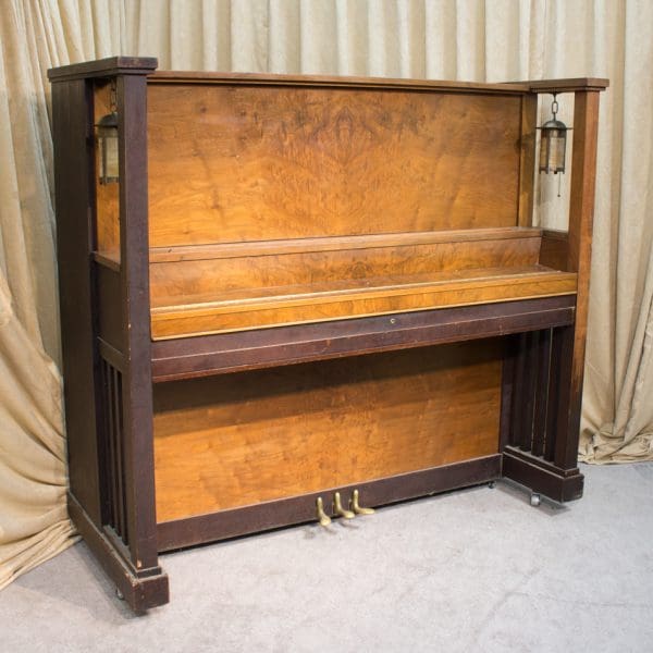 This piano is one of the most authentic Craftsman style pianos ever built. Inspired by the designs of Gustav Stickley, this piano gives a sense of overall functionality, simplicity, and beauty. The instrument is made of beautiful French Walnut wood and features unusual full-length frontal posts and original antique copper w/ amber glass electric lamps. These original electric lamps are wired into the frame of the instrument with each lamp having its own pull-chain on/off switch. The warm glow of the beautiful amber glass against the rich French Walnut wood and antique ivory keys is absolutely breathtaking.