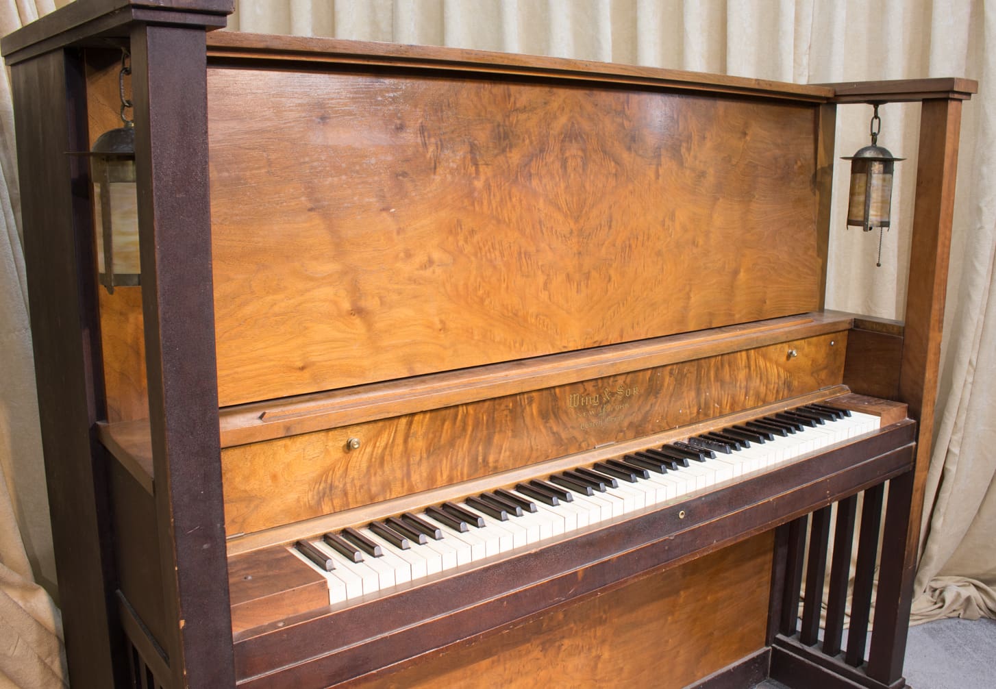 Rare Wing & Son “ART-CRAFT” Craftsman/Mission Style Upright Piano With Original Amber Glass Lamps