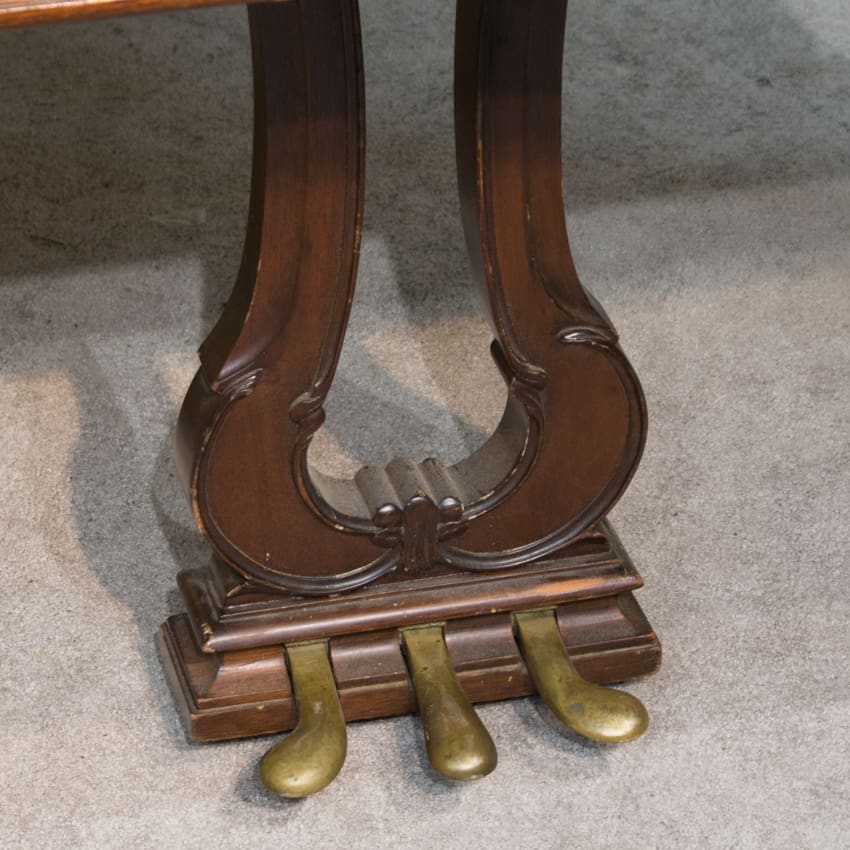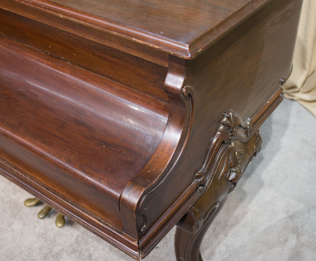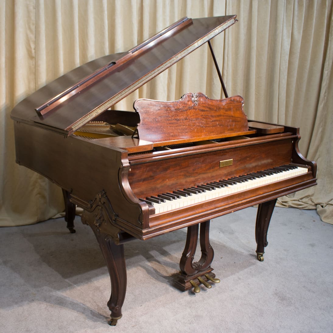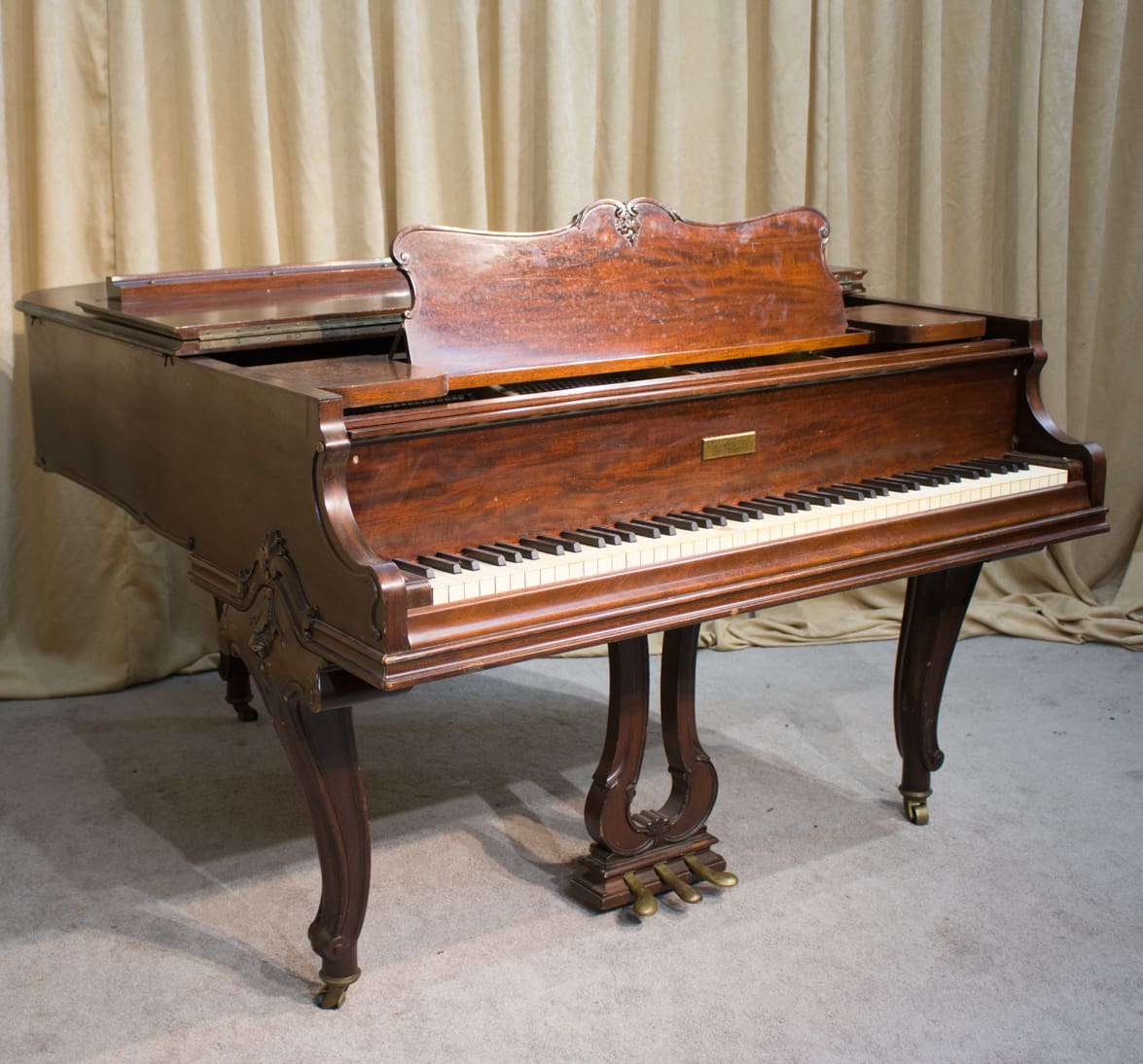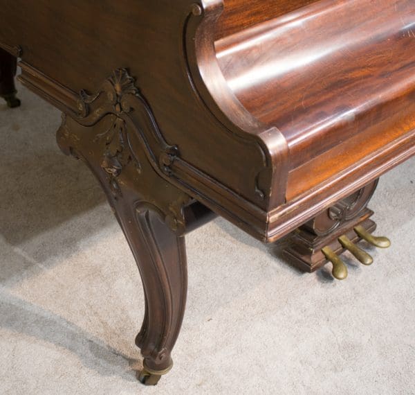 This piano is made of richly figured Honduran Mahogany wood and is of the Louis XV carved style. During the early 20thCentury, historic period styles became very popular in furniture and interior design. The French inspired Louis XV style was one of the most popular 20thCentury revival styles. Note the elegantly carved legs, music rack and pedal lyre. These carved art-case pianos were more expensive than traditional models, and they were built in small numbers.