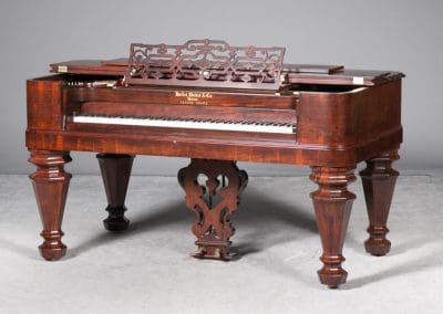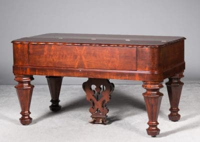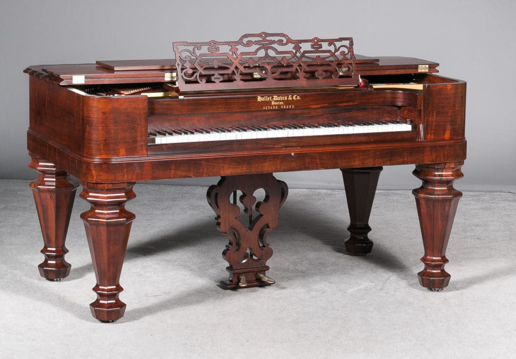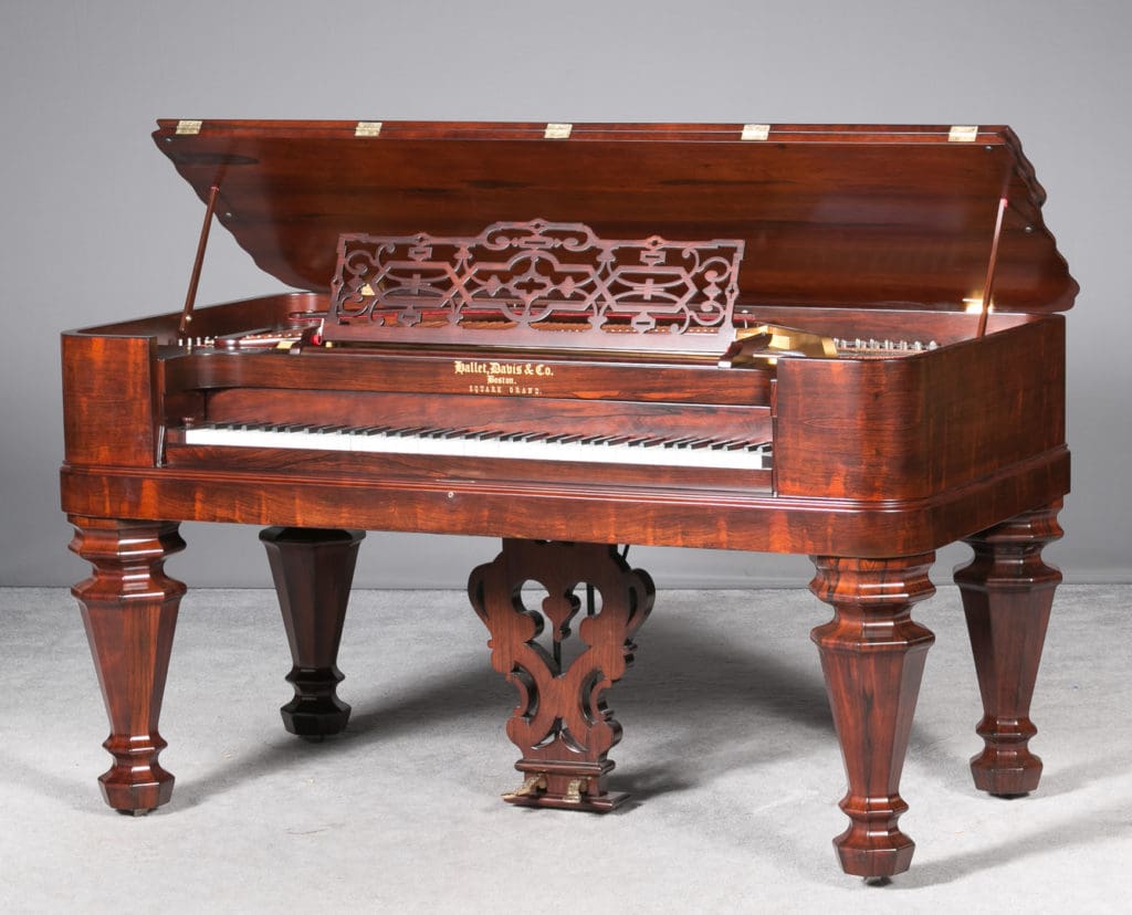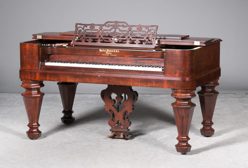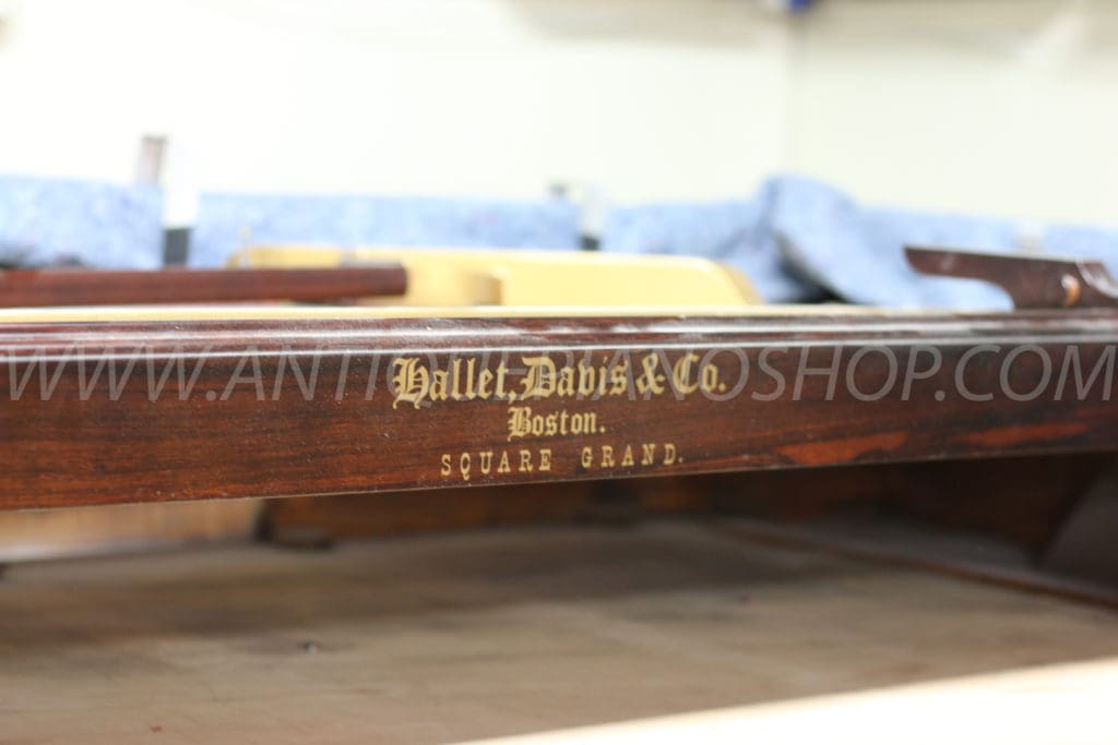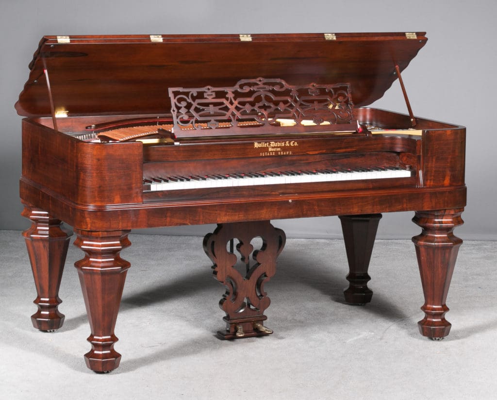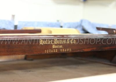 About this piano: This beautiful Hallet & Davis square grand piano was built in 1867, shortly after the end of the Civil War. This was a time when more square grand pianos were being built in America than both upright and grand pianos combined! This piano is made of Brazilian Rosewood, now an endangered species, and is of the carved Empire Revival Victorian style.