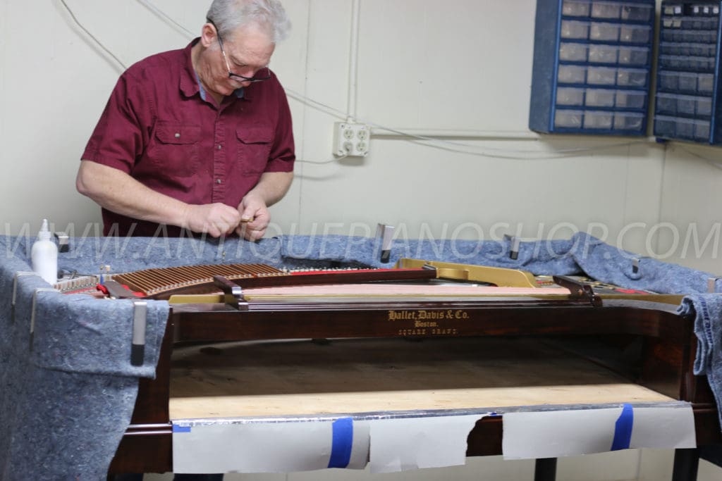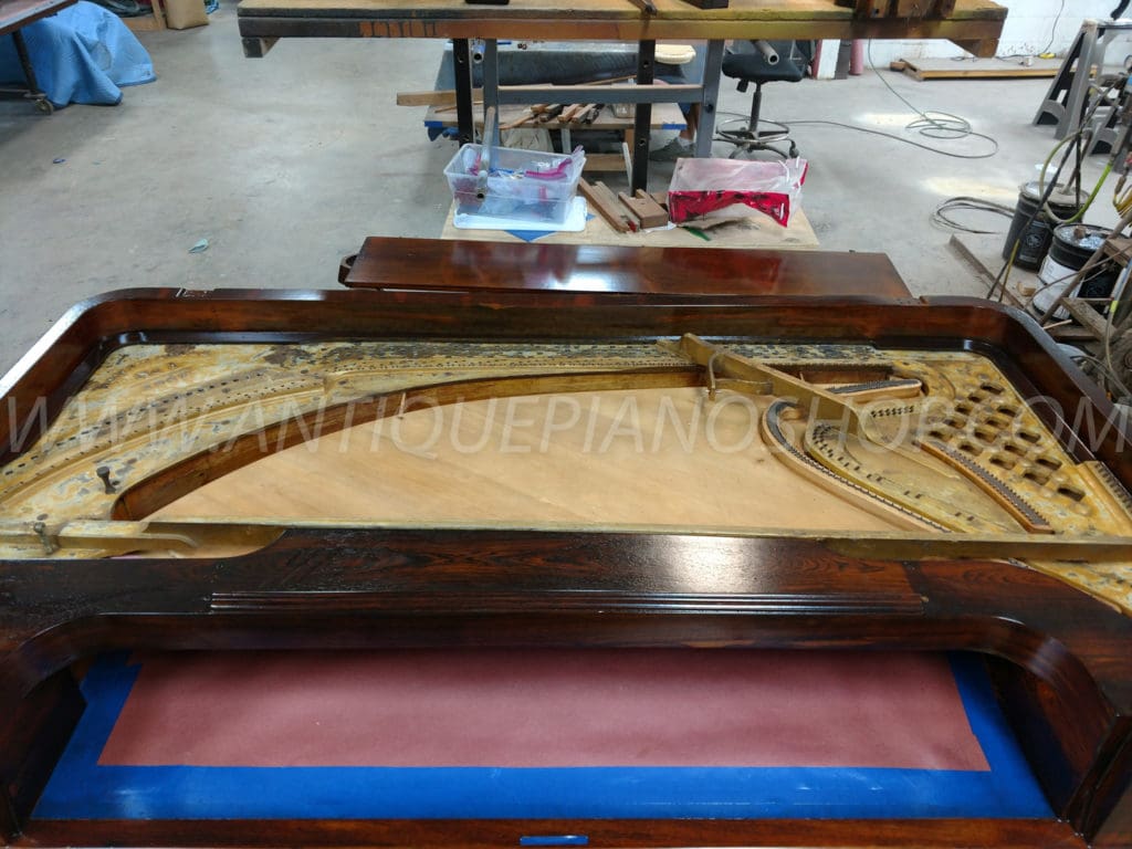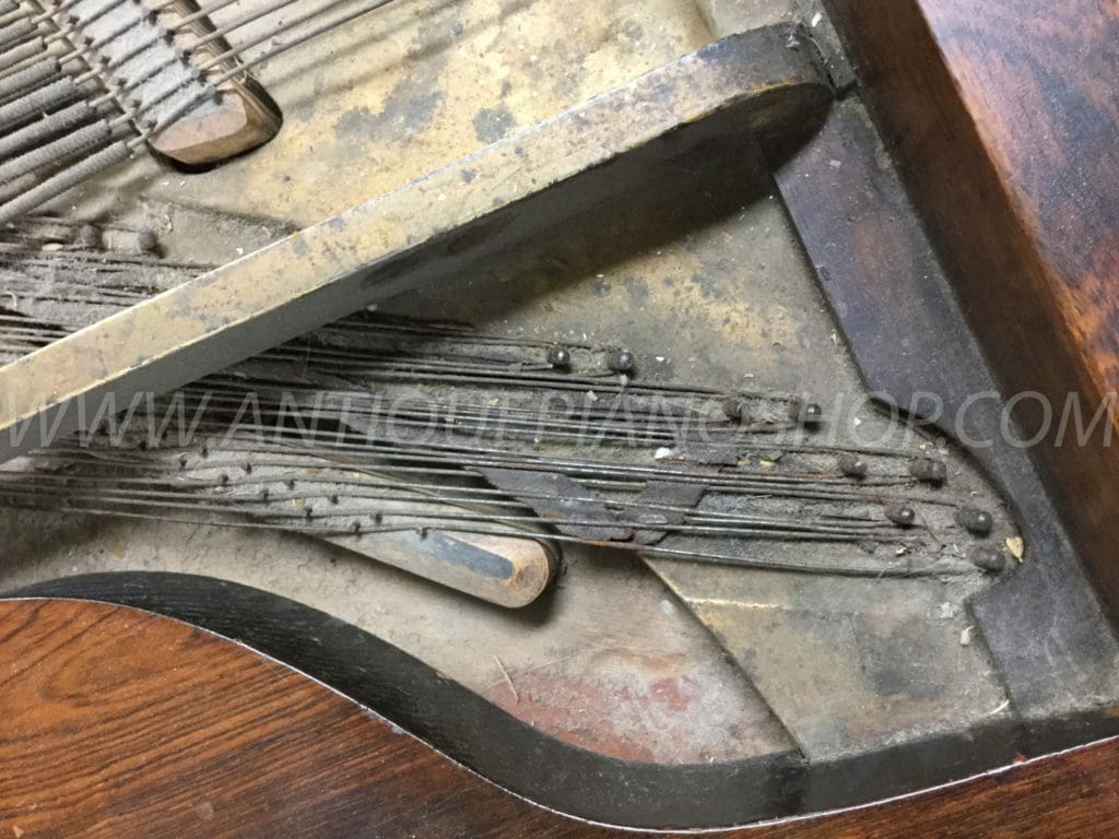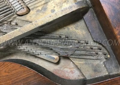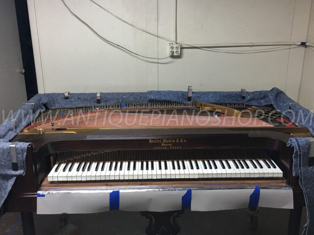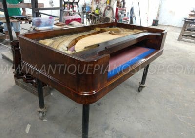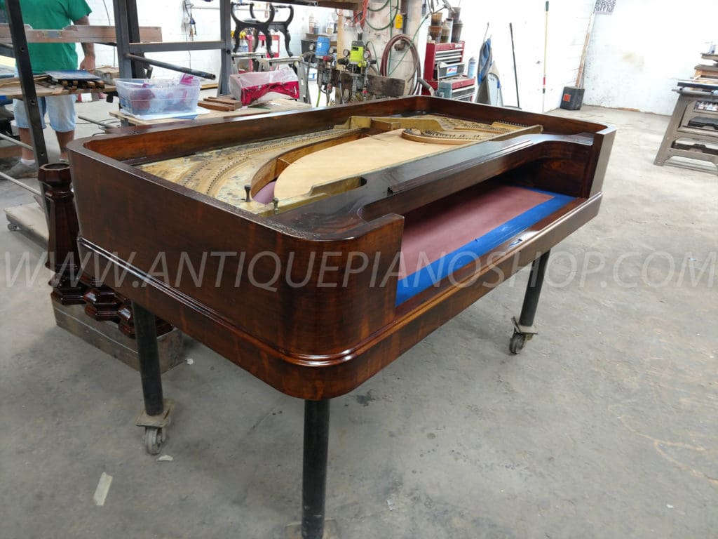 It is important to understand that the interior mechanisms of square pianos are very different from baby grand and upright pianos. Parts are not readily available for them through common piano supply companies, and many less experienced piano tuners may discourage their restoration and preservation. Here at The Antique Piano Shop, we are set up to manufacture all of the obscure parts for square grand pianos on a case-by-case basis, giving us the ability to do a complete and historically correct restoration on square pianos like this one.