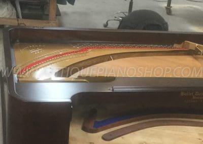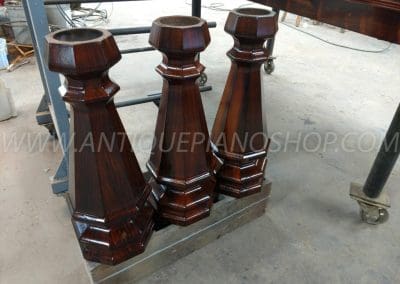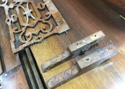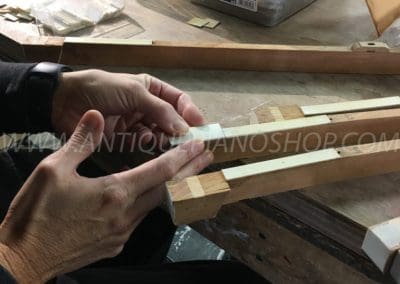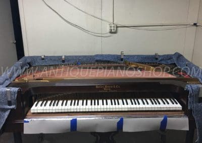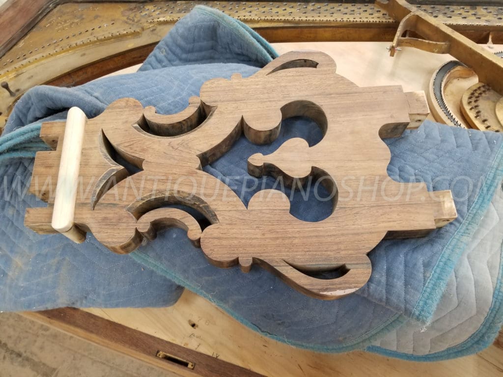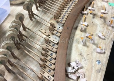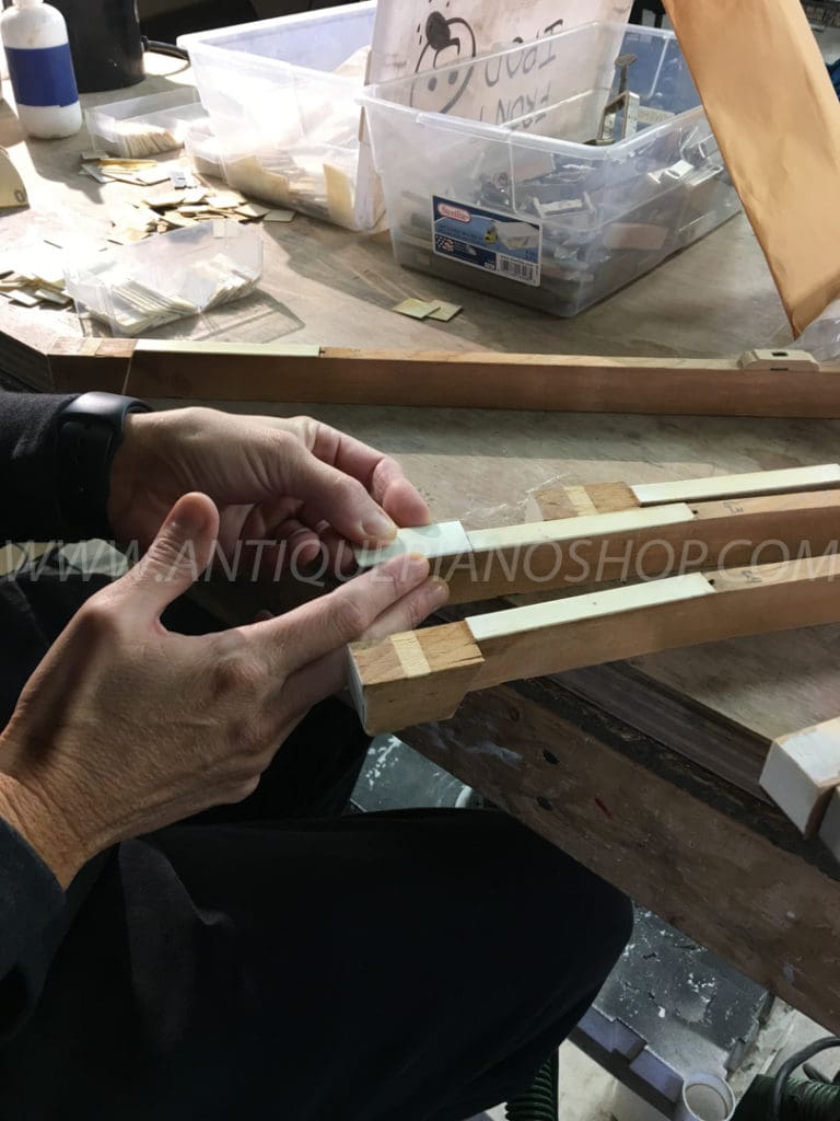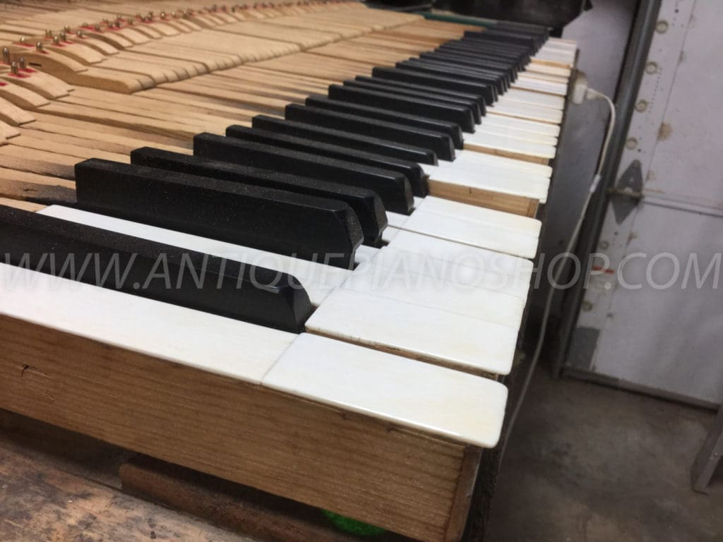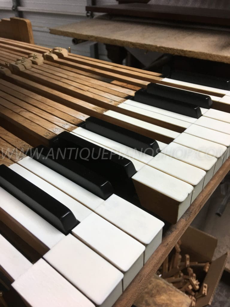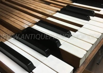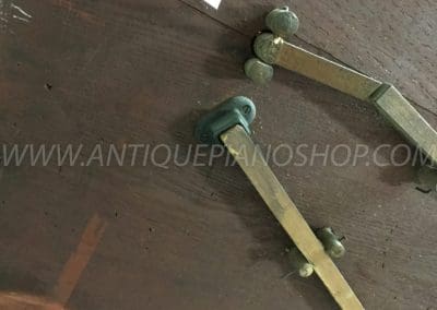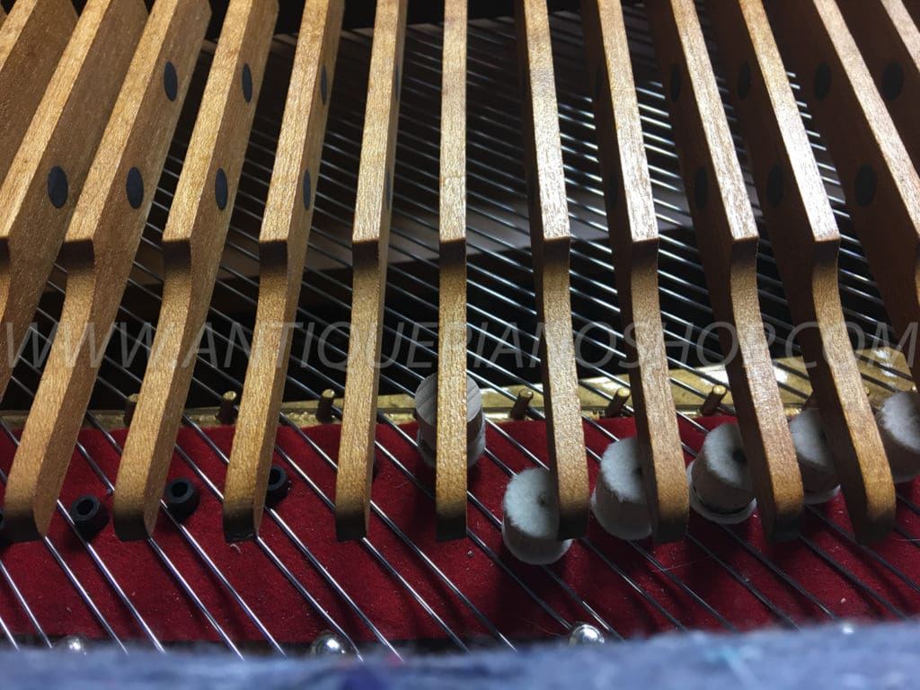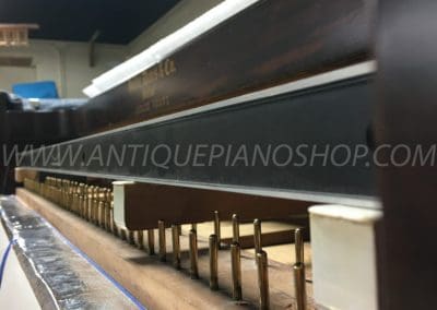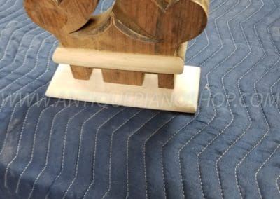 The original ivory and ebony keys are reasonably well-preserved and are restored. The ivory is cleaned and treated with UV light while chips and cracks are repaired. The ebony sharps are re-stained and buffed. The mechanical action of the piano was virtually destroyed by a poor-quality attempt at restoration many years ago where the wrong parts were used in restoration. Because the parts for this instrument are obscure and not readily available, we specialize in making all of our parts “in house” on a case-by-case basis. Our amazing action team was able to duplicate every last part of this delicate piano action both by hand and with the help of a CNC machine. This piano received a new custom-made action including new custom made hammers, butts, shanks and flanges.