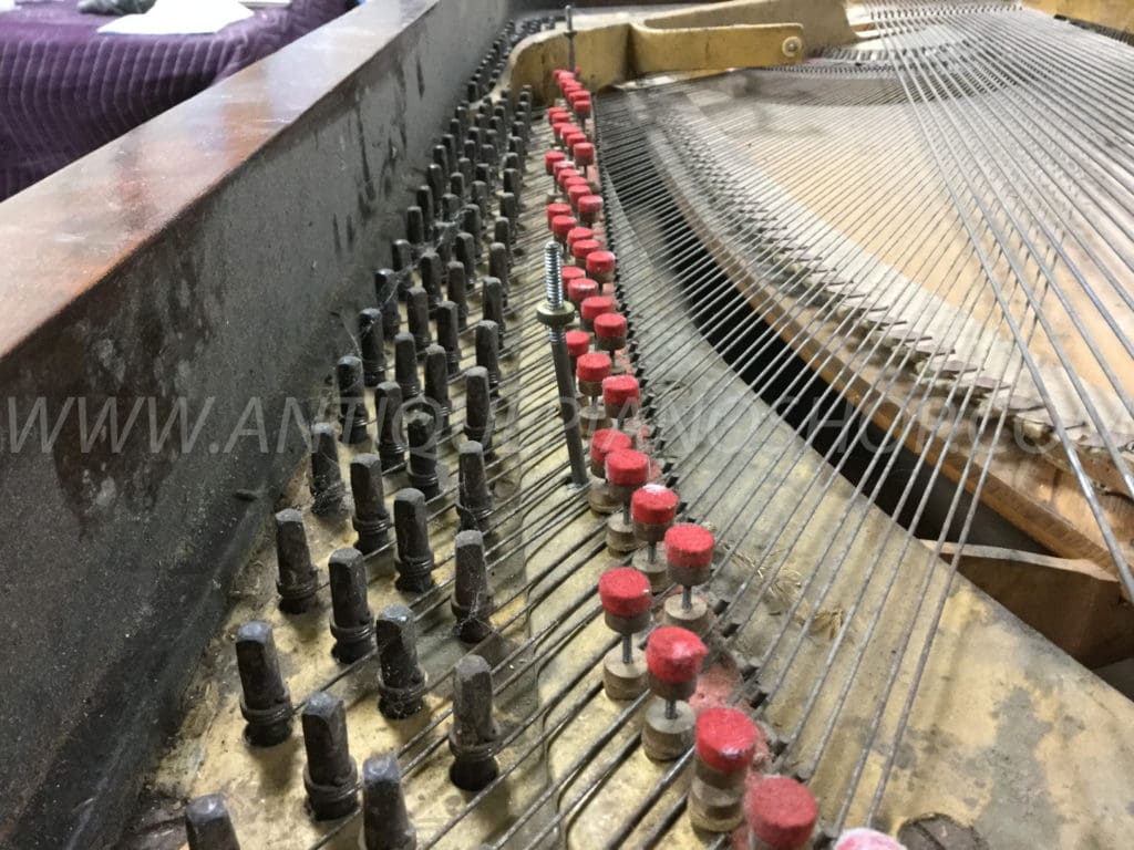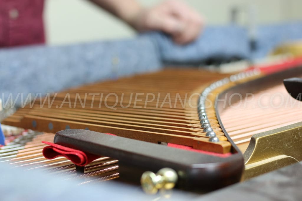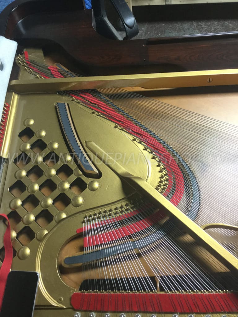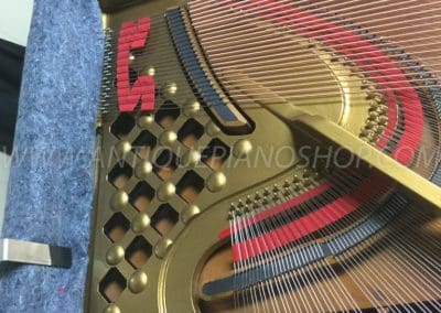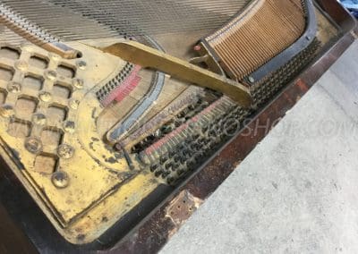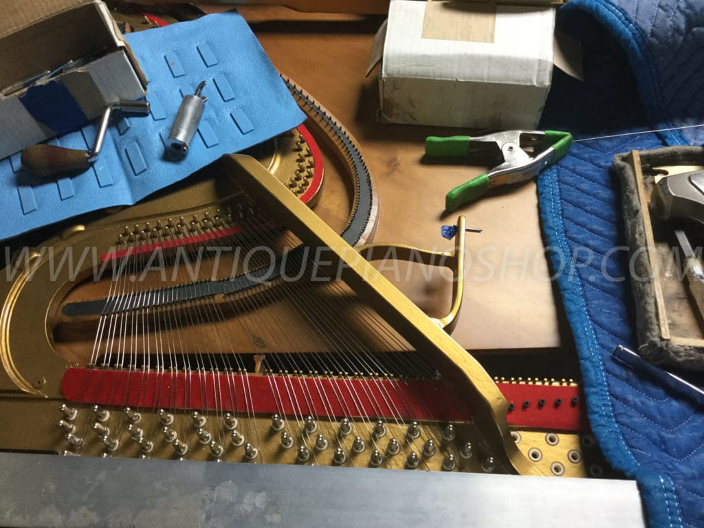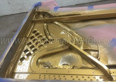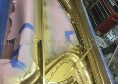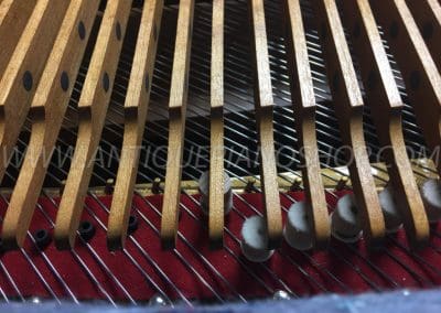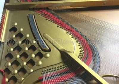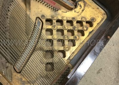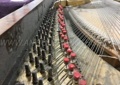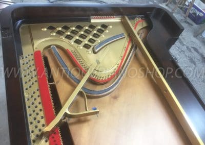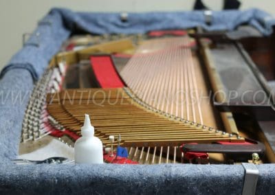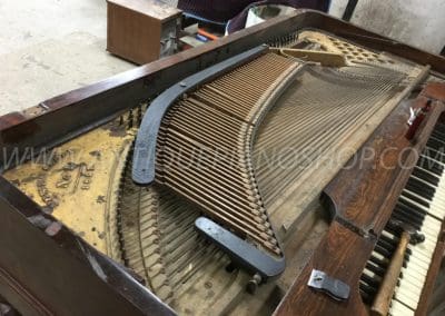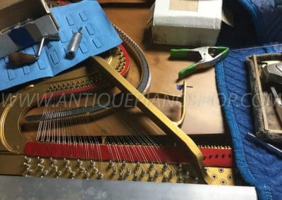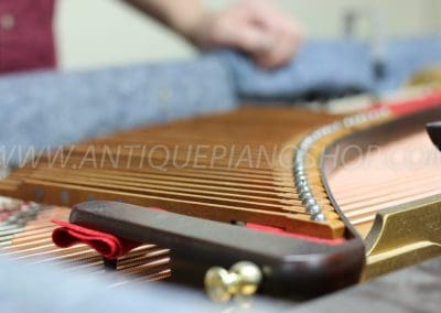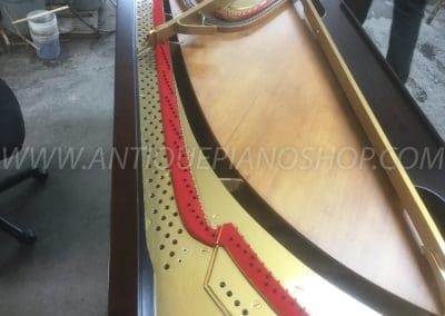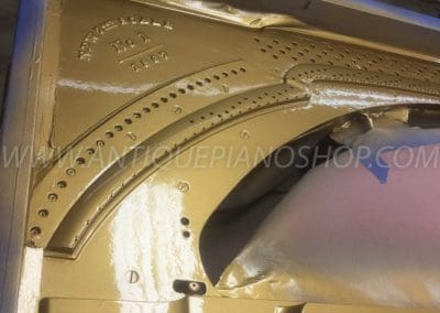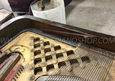 The old brittle strings are removed from the piano and each individual string is measured for diameter and size. Decades of dirt and debris are caked on the soundboard and bridges. The harp is removed from the piano and is carefully cleaned and re-gilded with brilliant gold lacquer. The old-growth wood soundboard and bridges are restored. The harp is reinstalled in the piano, and new strings are carefully installed.