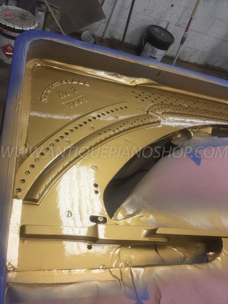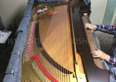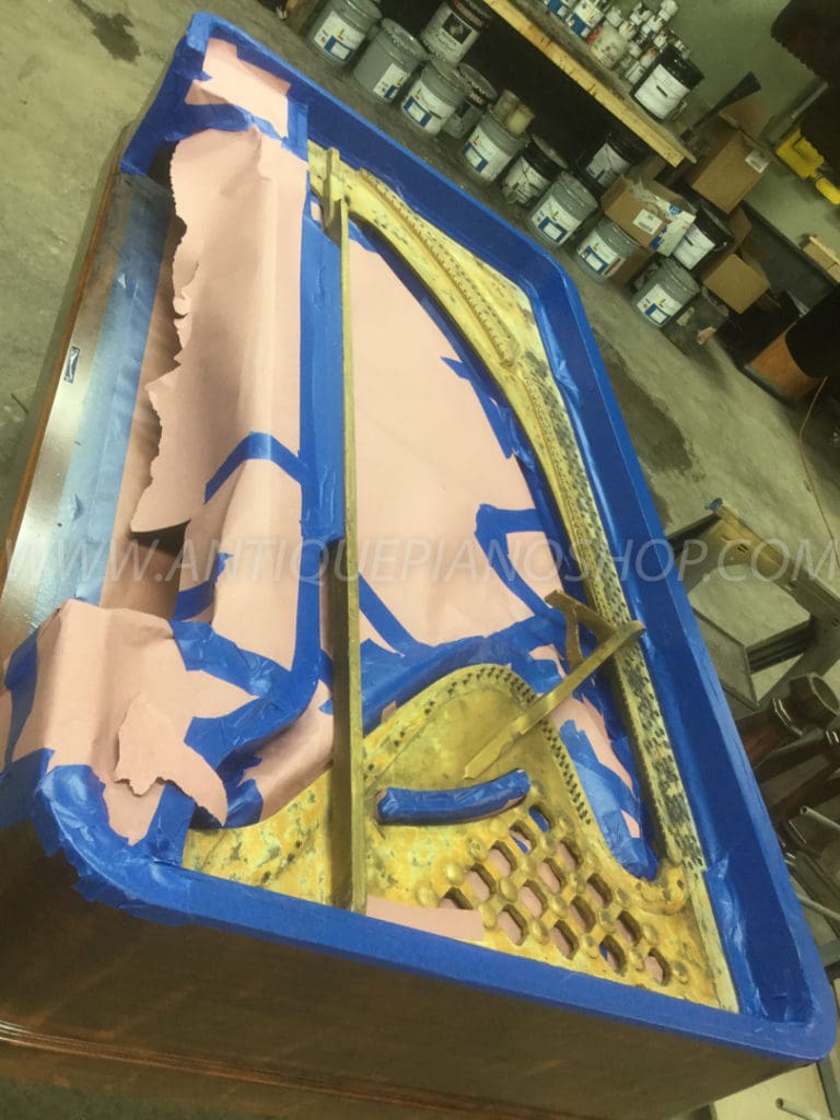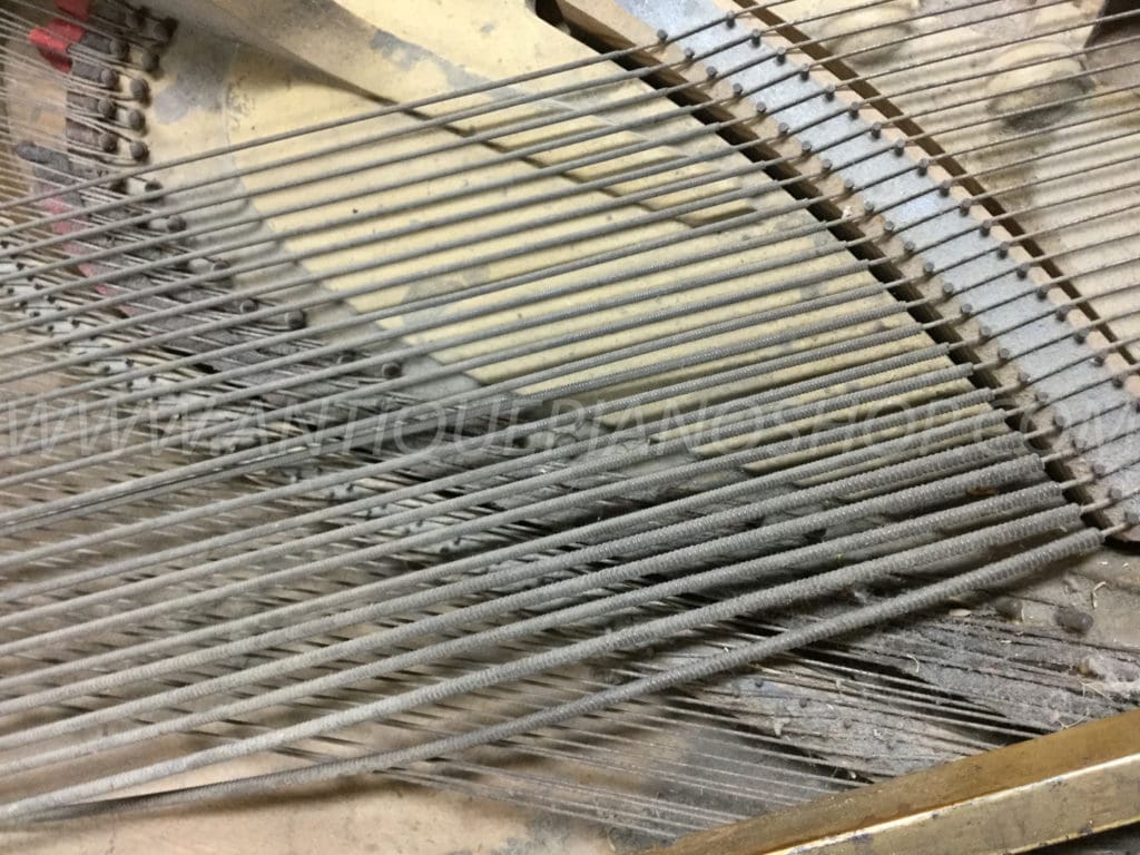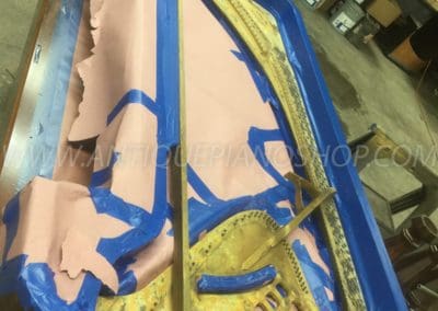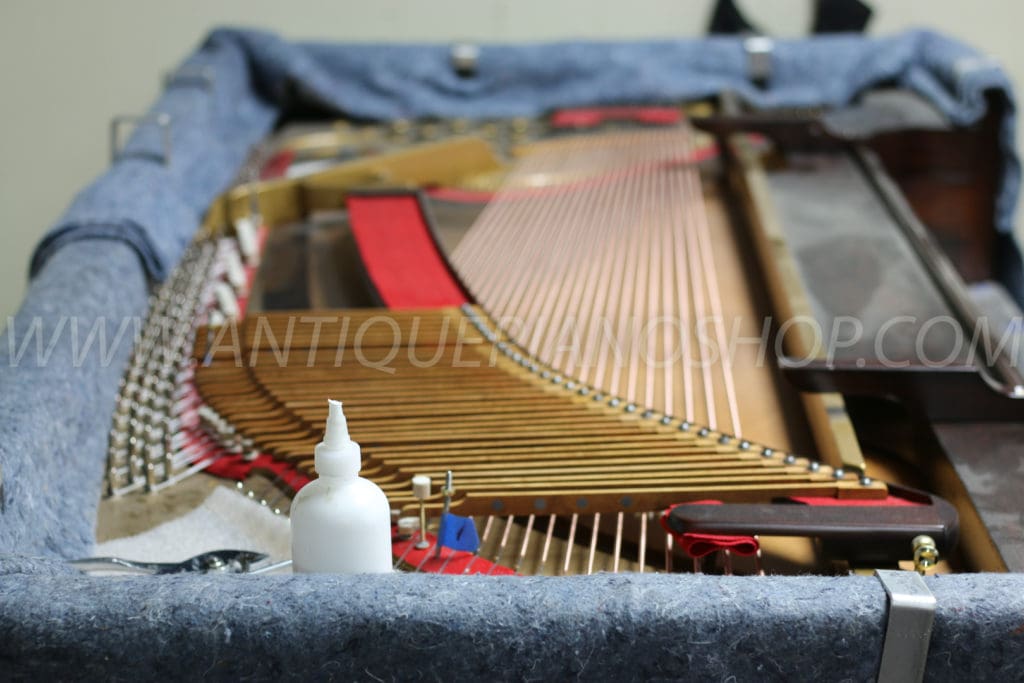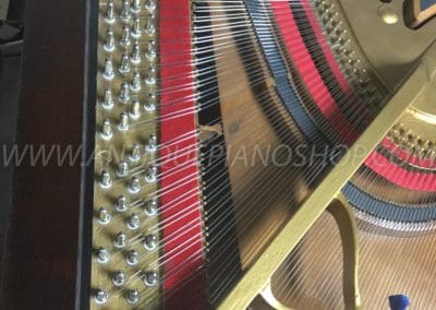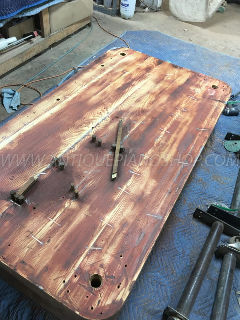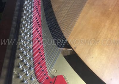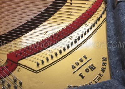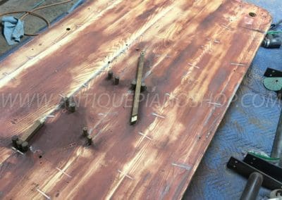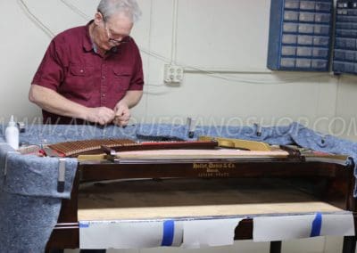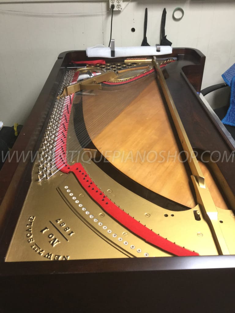 The old brittle strings are removed from the piano and each individual string is measured for diameter and size. Decades of dirt and debris are caked on the soundboard and bridges. The harp is removed from the piano and is carefully cleaned and re-gilded with brilliant gold lacquer. The old-growth wood soundboard and bridges are restored. The harp is reinstalled in the piano, and new strings are carefully installed.