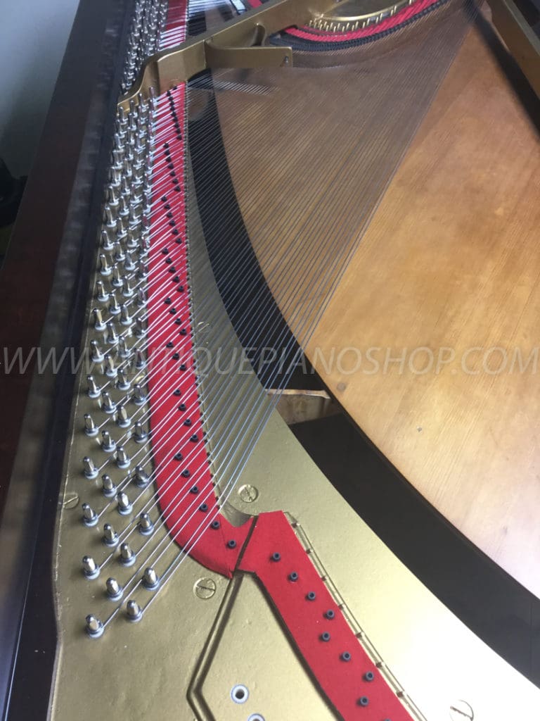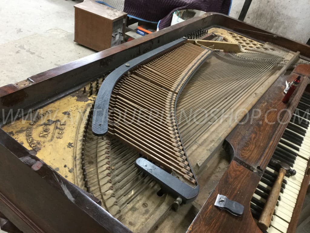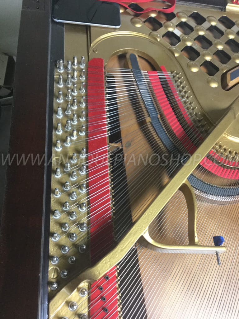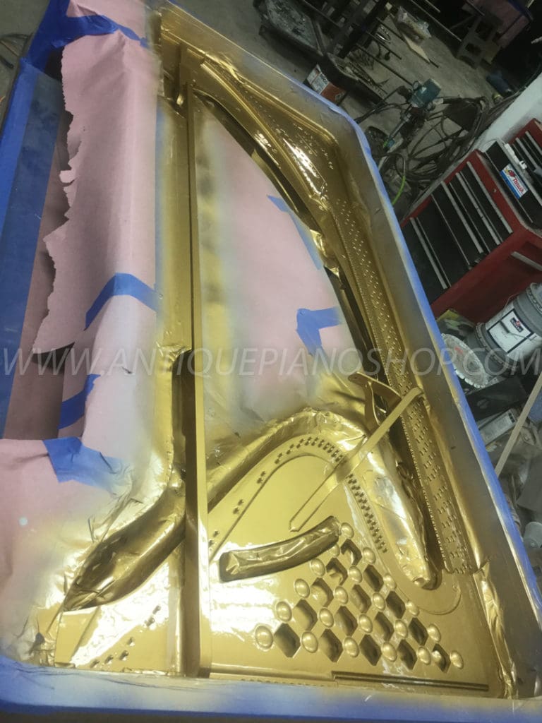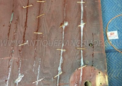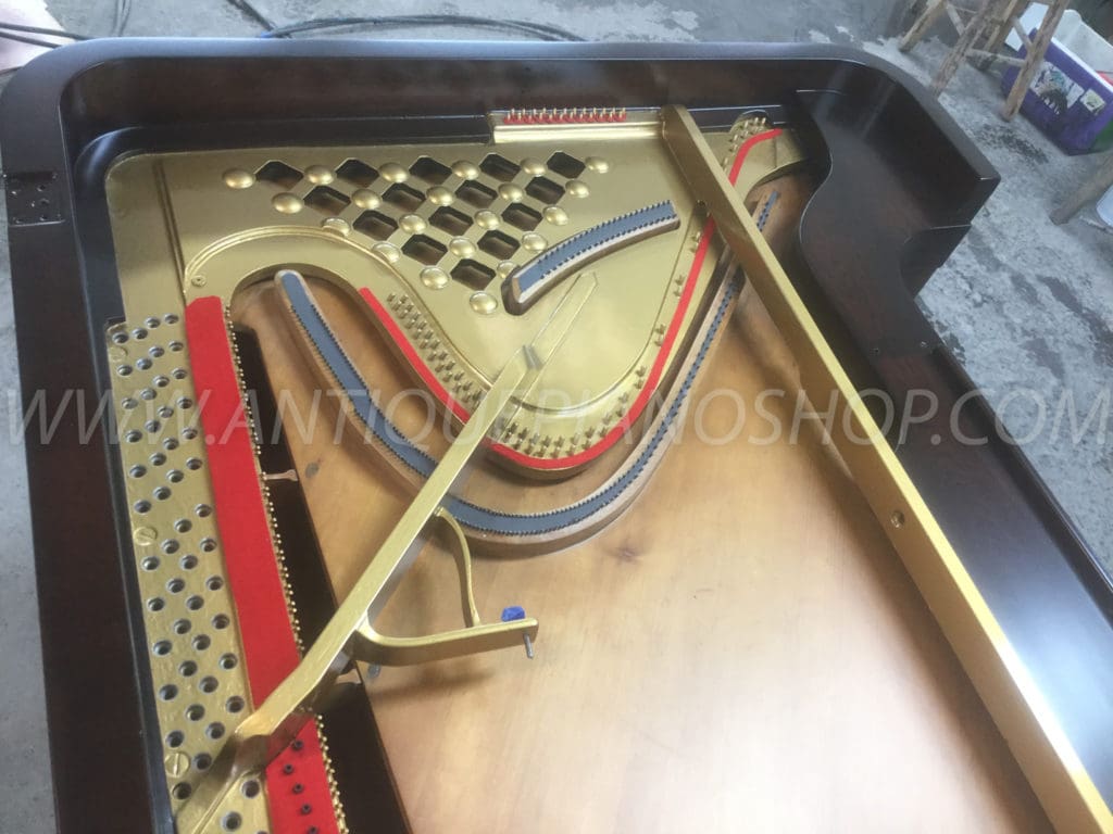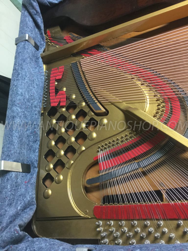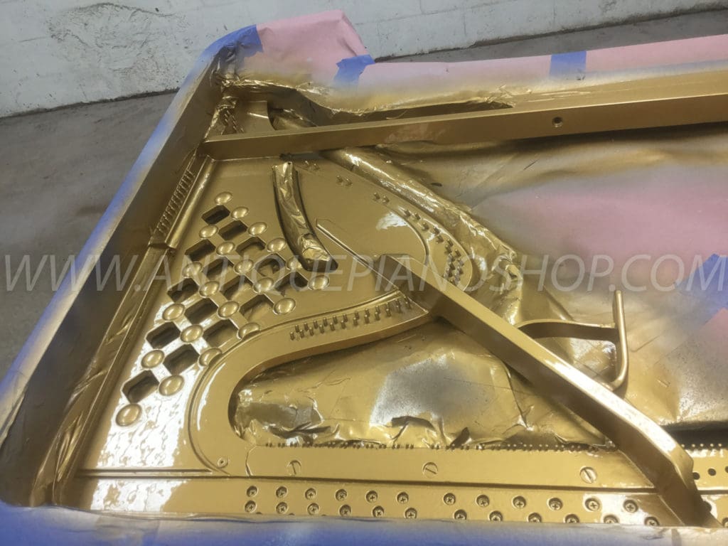 The old brittle strings are removed from the piano and each individual string is measured for diameter and size. Decades of dirt and debris are caked on the soundboard and bridges. The harp is removed from the piano and is carefully cleaned and re-gilded with brilliant gold lacquer. The old-growth wood soundboard and bridges are restored. The harp is reinstalled in the piano, and new strings are carefully installed.