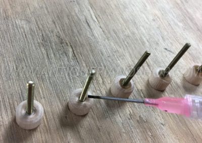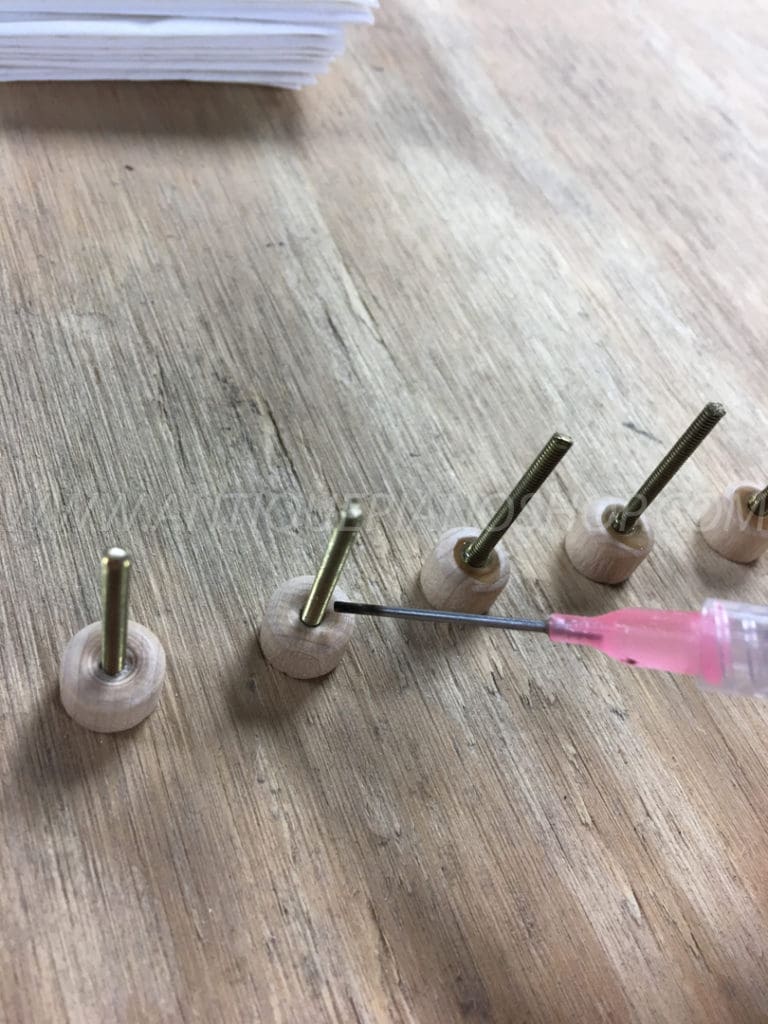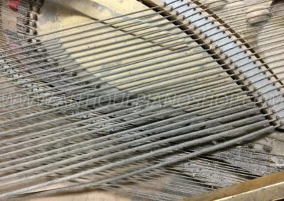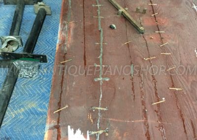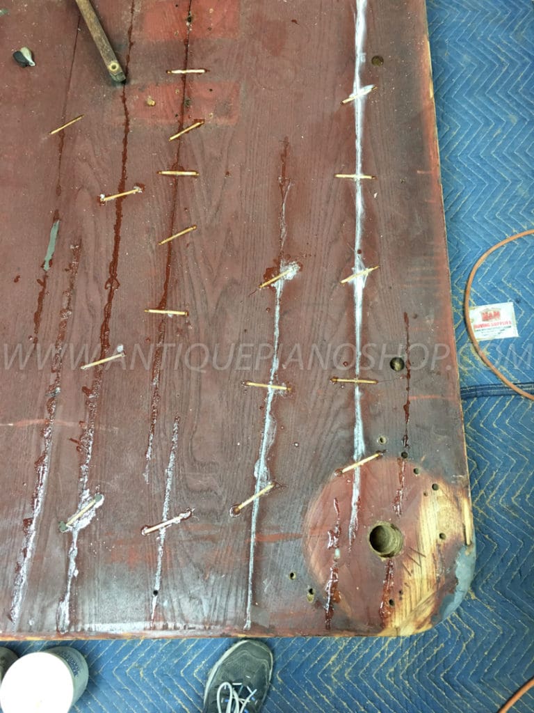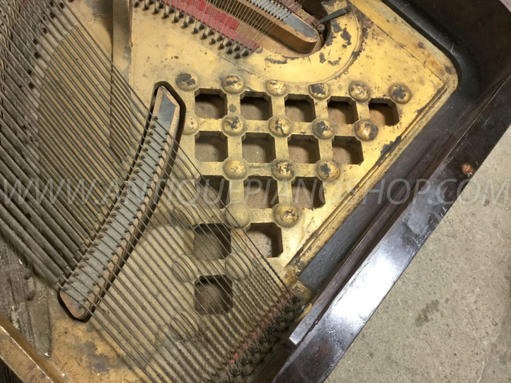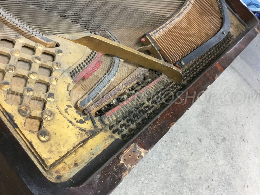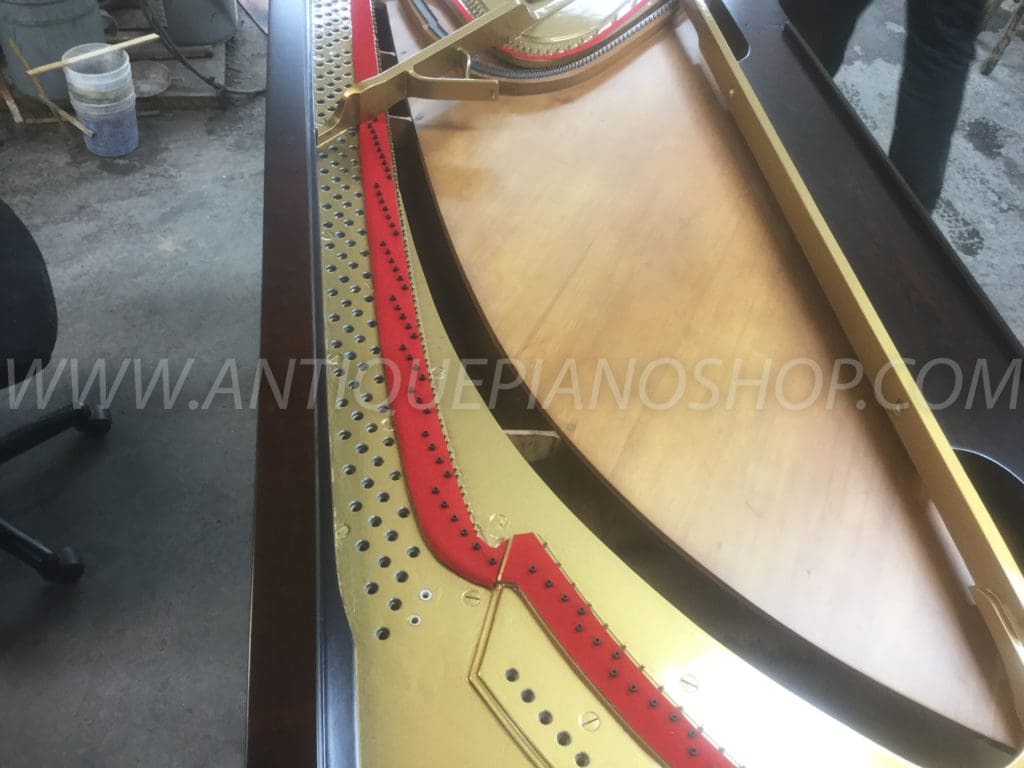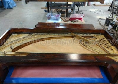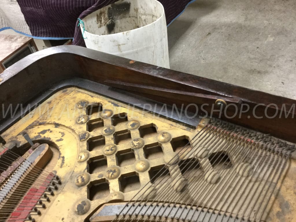 The old brittle strings are removed from the piano and each individual string is measured for diameter and size. Decades of dirt and debris are caked on the soundboard and bridges. The harp is removed from the piano and is carefully cleaned and re-gilded with brilliant gold lacquer. The old-growth wood soundboard and bridges are restored. The harp is reinstalled in the piano, and new strings are carefully installed.