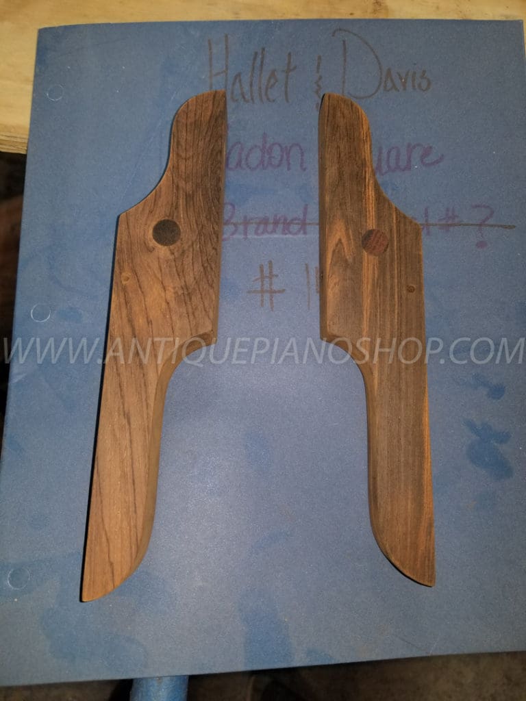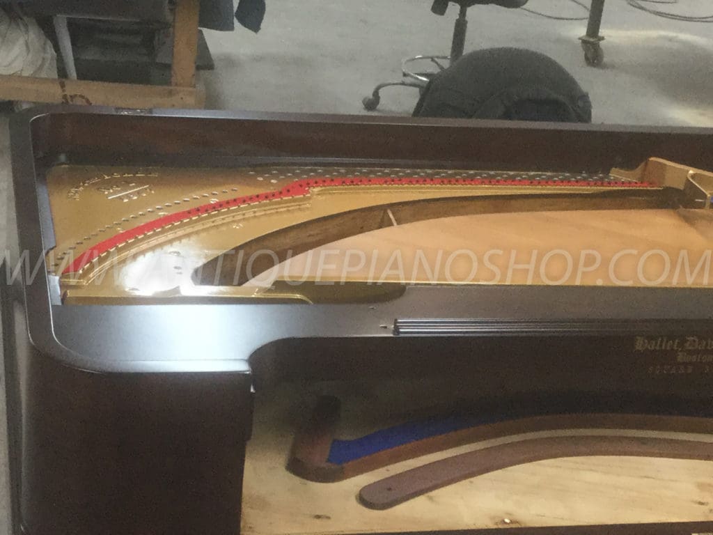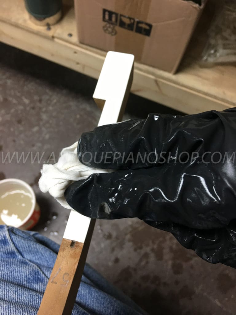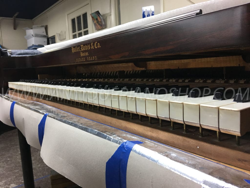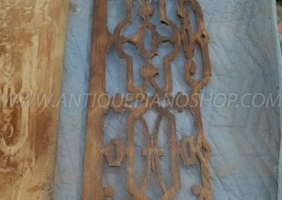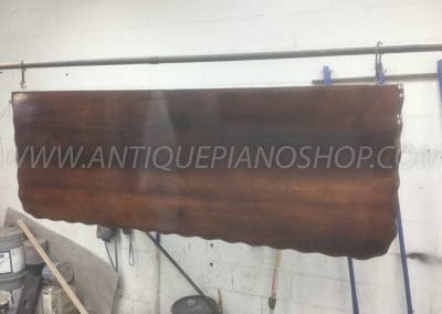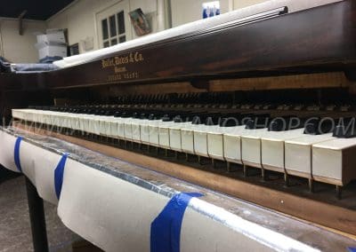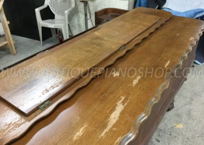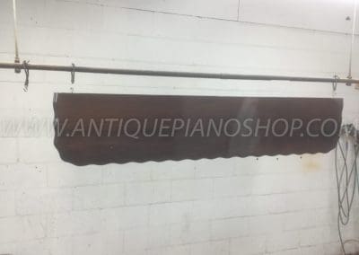 The old faded finish is carefully removed and the bare wood is repaired, re-glued and carefully sanded. Broken and missing pieces of the cabinet are repaired and replaced. Multiple coats of stain, sealer and lacquer are applied to the case, each coat painstakingly sanded smooth for lusture and clarity. The previous poor-quality restoration attempt removed the original “HALLET, DAVIS & CO., BOSTON” brand label above the keyboard but the proper label is replaced with historical accuracy during the refinishing process.