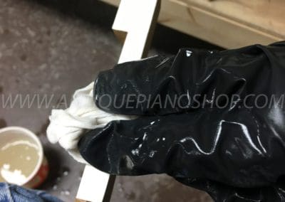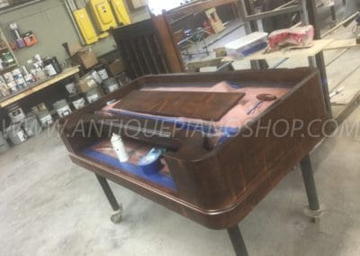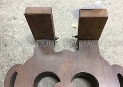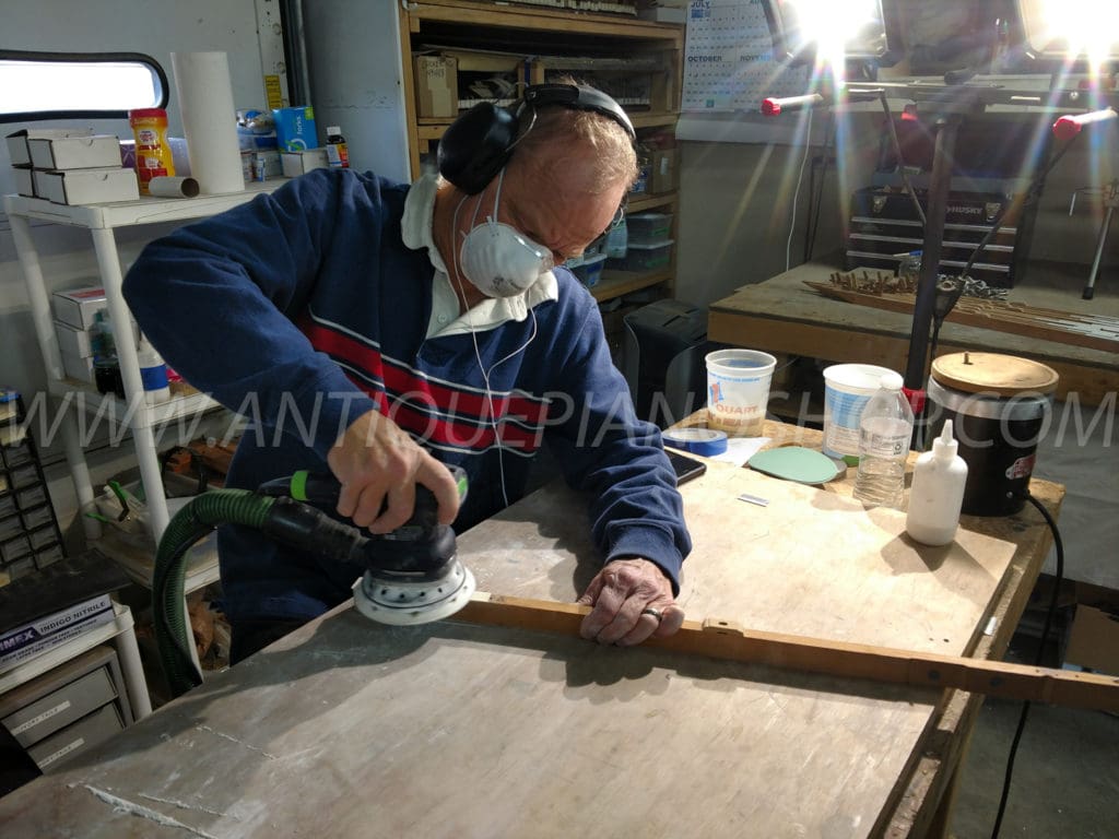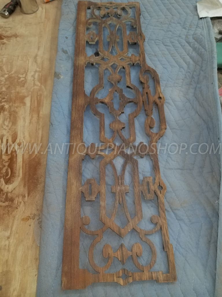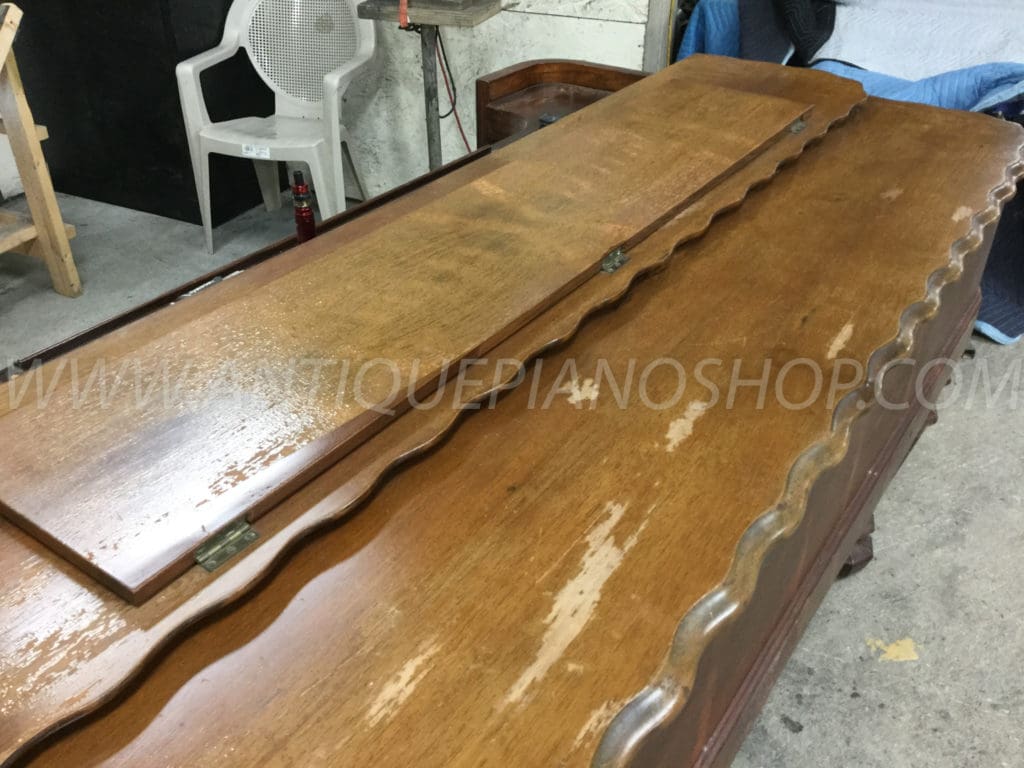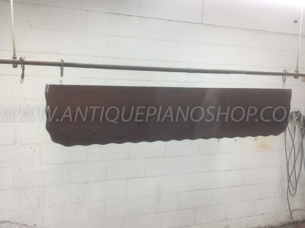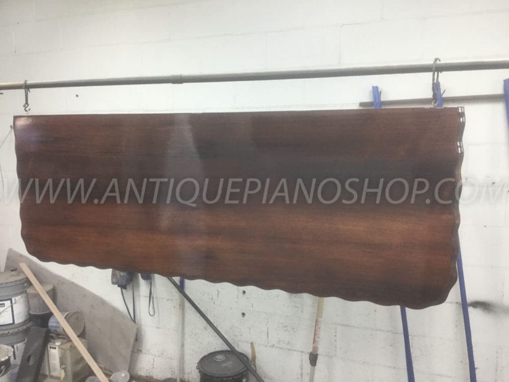 The old faded finish is carefully removed and the bare wood is repaired, re-glued and carefully sanded. Broken and missing pieces of the cabinet are repaired and replaced. Multiple coats of stain, sealer and lacquer are applied to the case, each coat painstakingly sanded smooth for lusture and clarity. The previous poor-quality restoration attempt removed the original “HALLET, DAVIS & CO., BOSTON” brand label above the keyboard but the proper label is replaced with historical accuracy during the refinishing process.