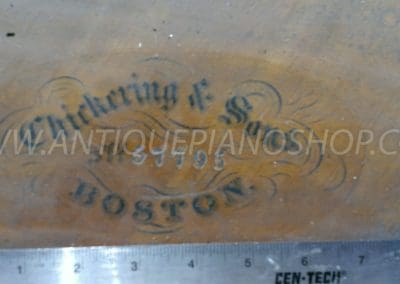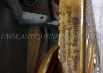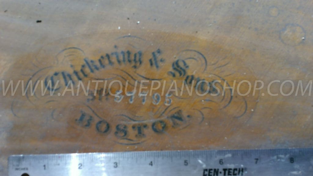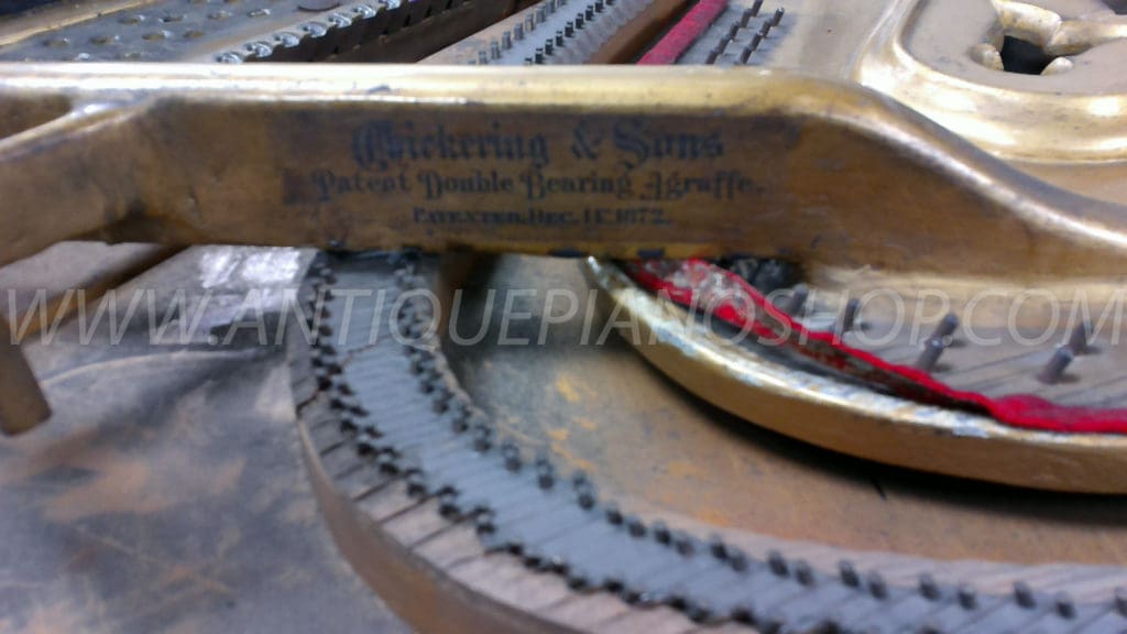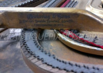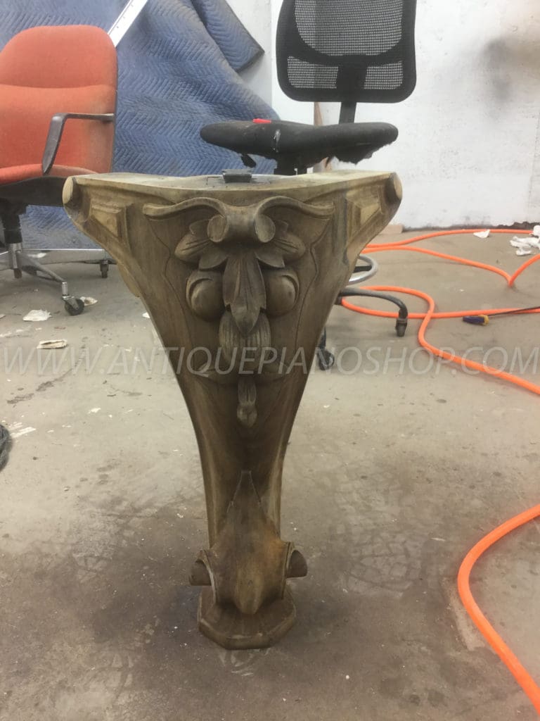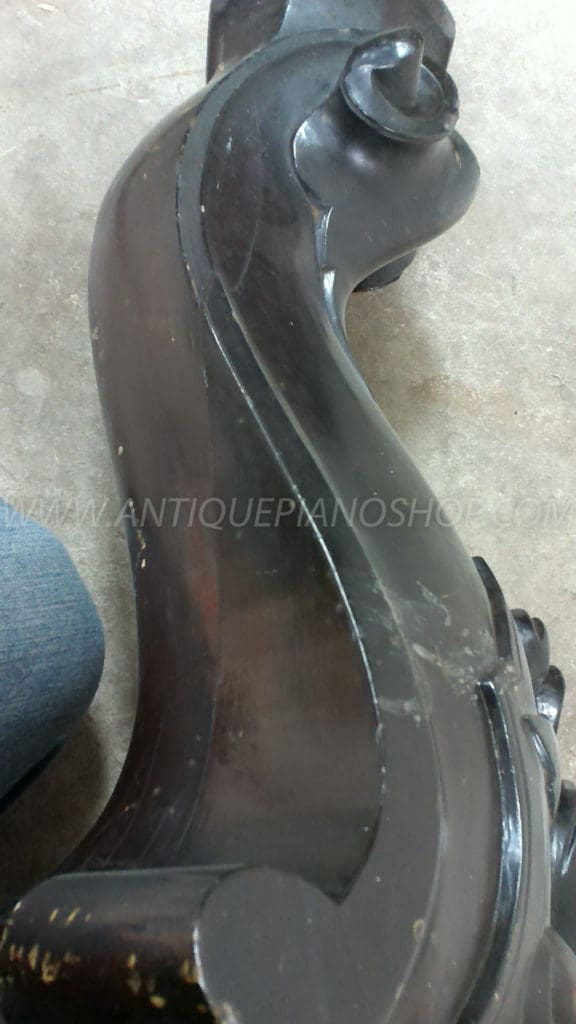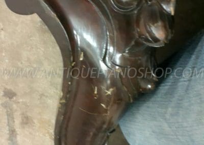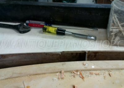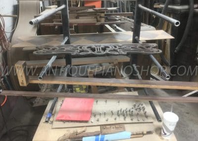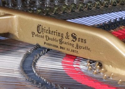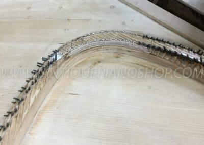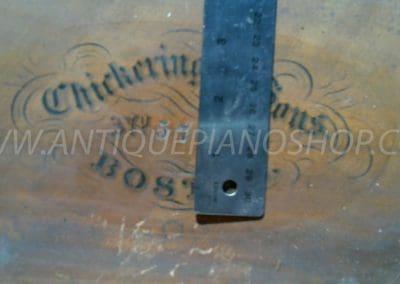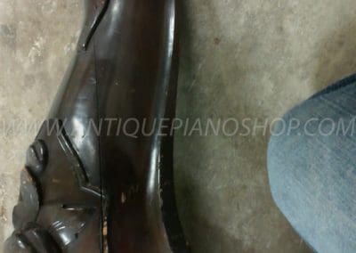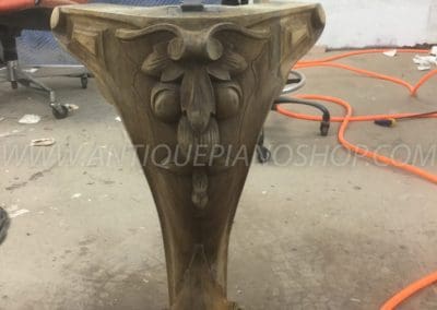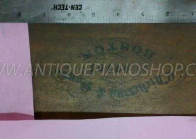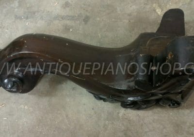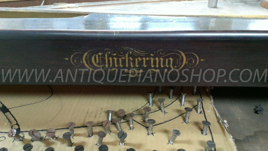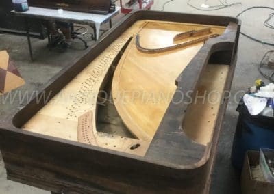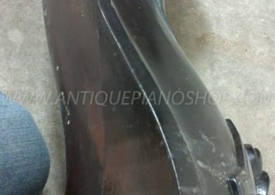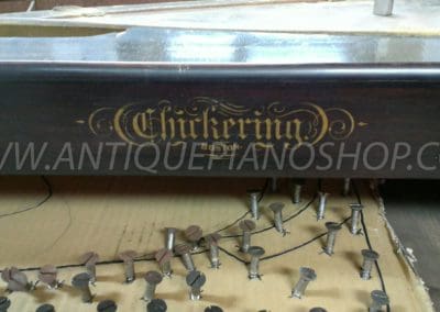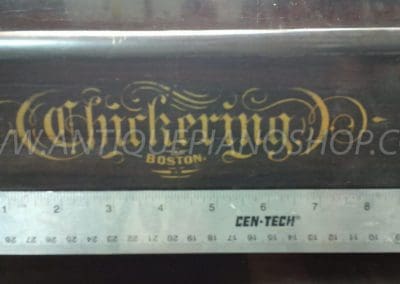 Prior to restoration, the piano was in dirty, unusable condition resulting from years of neglect. The massive rosewood legs are weak and brittle, requiring reinforcement to make them strong enough to hold the weight of the instrument. The piano is disassembled and each individual piece is carefully removed, labeled and recorded. The beautiful gold script CHICKERING BOSTON decals are copied and recorded so that exact duplicates can be made and applied with historical accuracy. The instrument is assessed for obscure and unusual parts which are not readily available from common suppliers and must be fabricated in our shop.