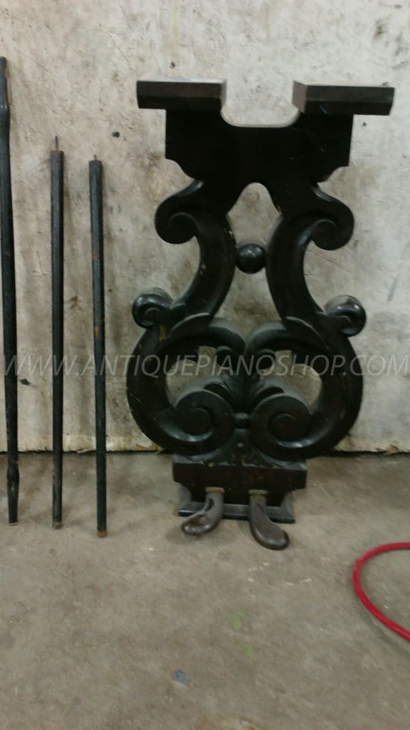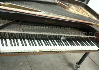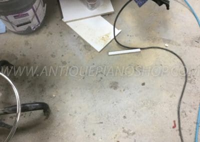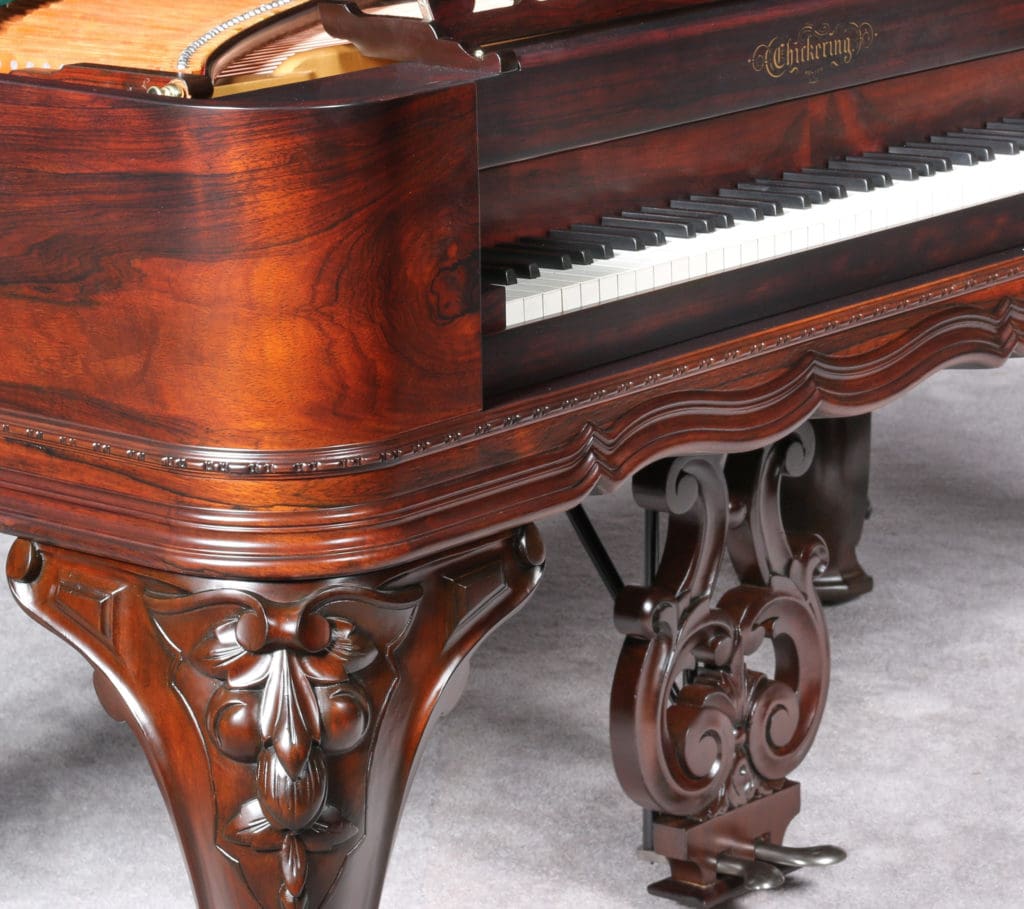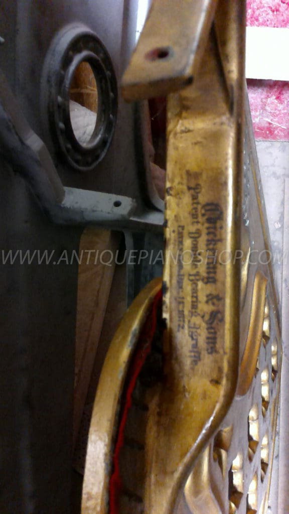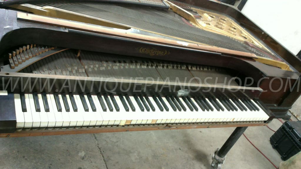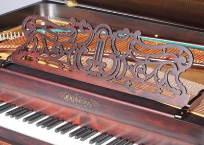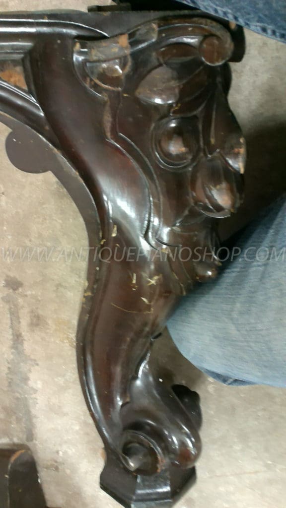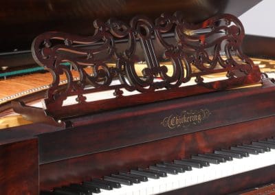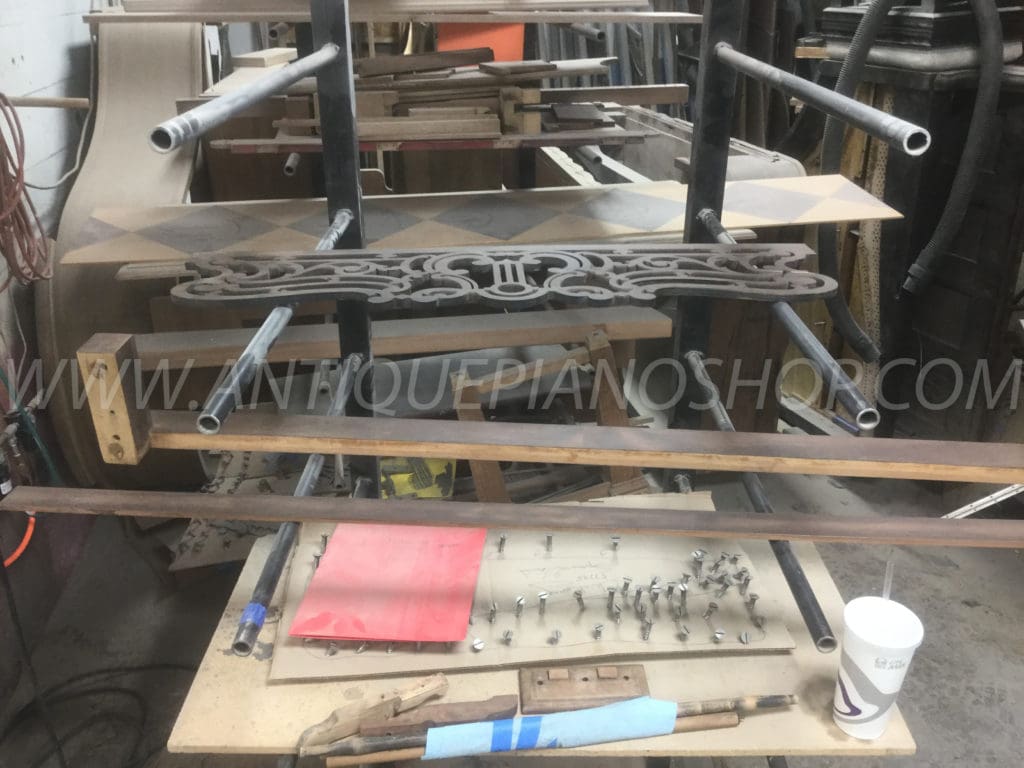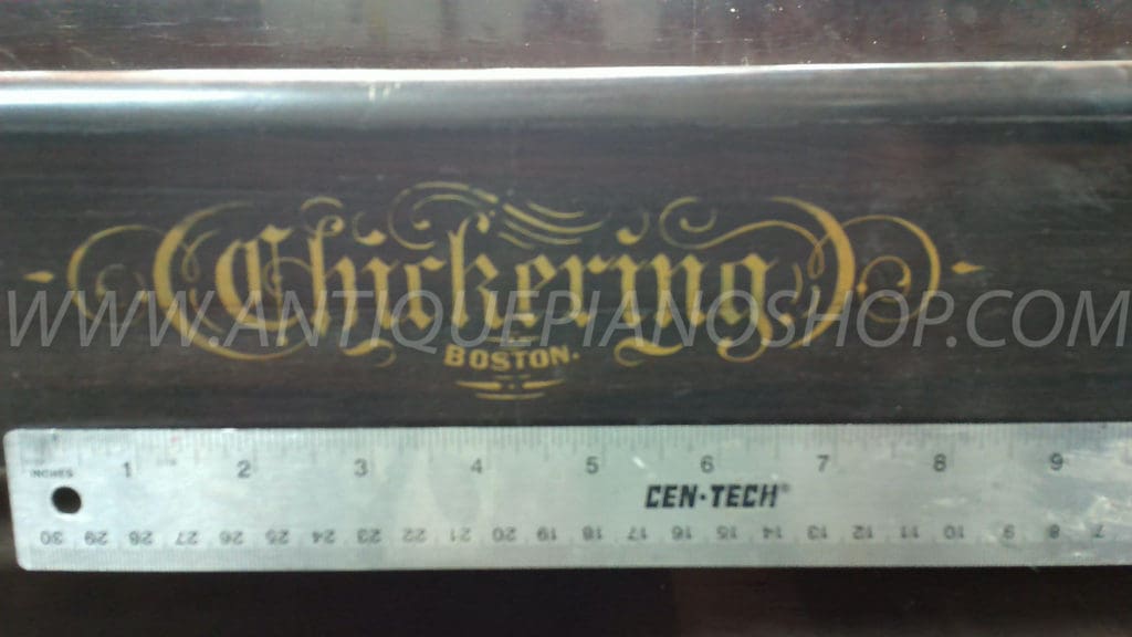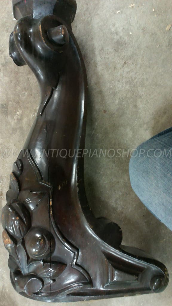 Prior to restoration, the piano was in dirty, unusable condition resulting from years of neglect. The massive rosewood legs are weak and brittle, requiring reinforcement to make them strong enough to hold the weight of the instrument. The piano is disassembled and each individual piece is carefully removed, labeled and recorded. The beautiful gold script CHICKERING BOSTON decals are copied and recorded so that exact duplicates can be made and applied with historical accuracy. The instrument is assessed for obscure and unusual parts which are not readily available from common suppliers and must be fabricated in our shop.