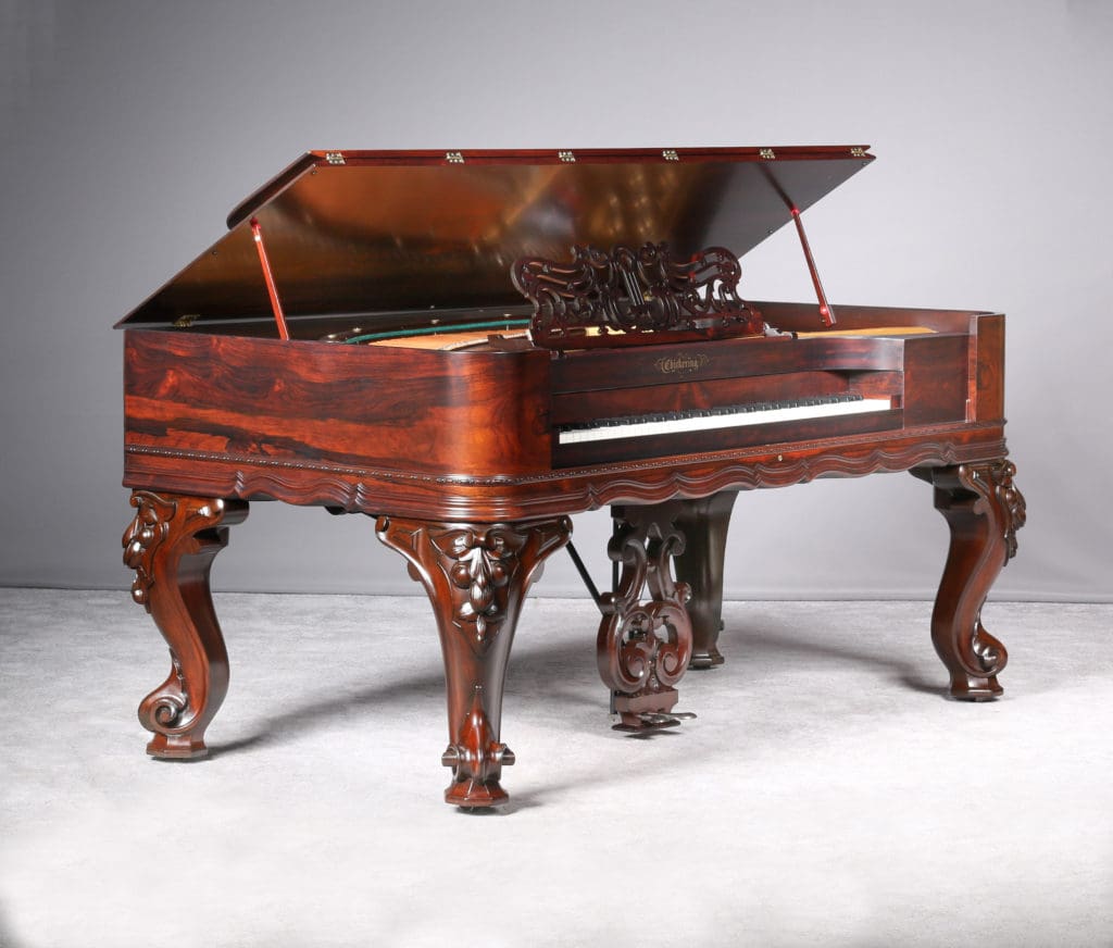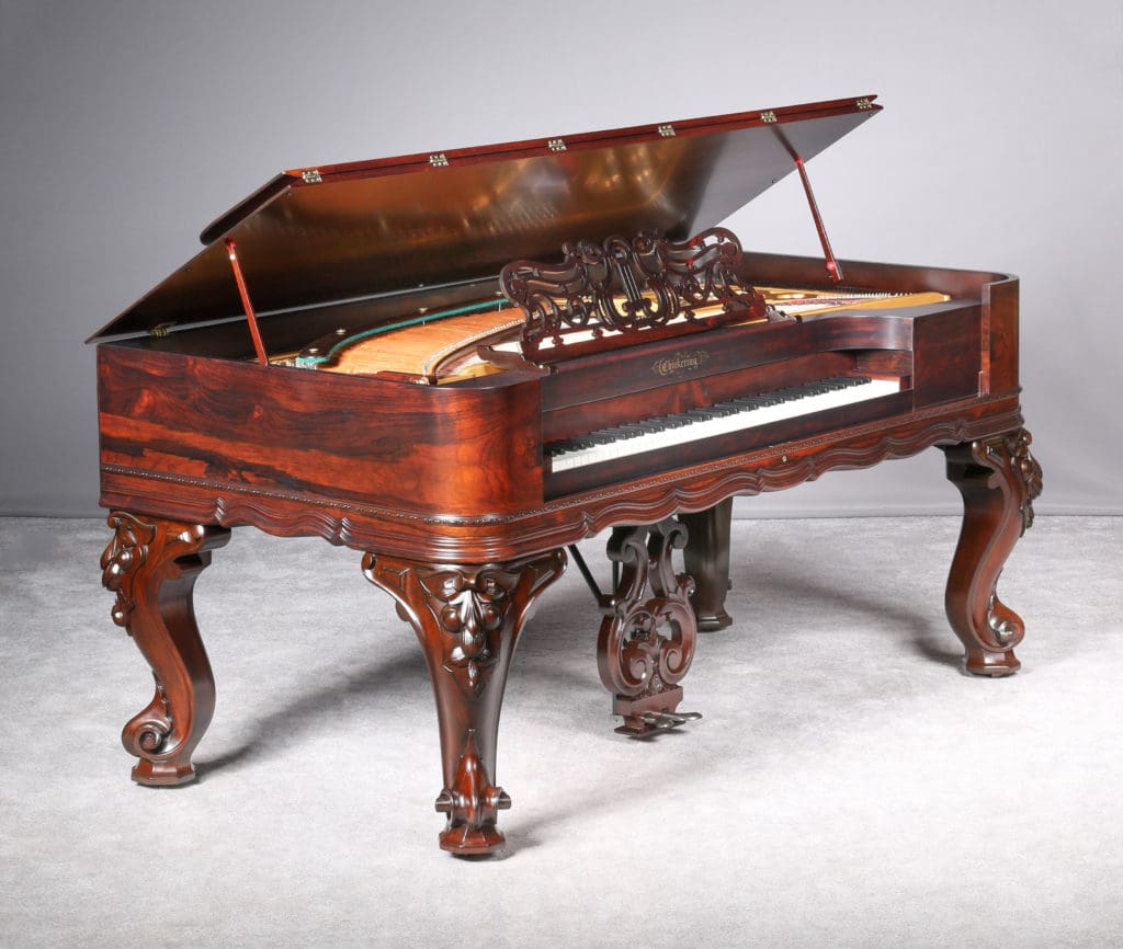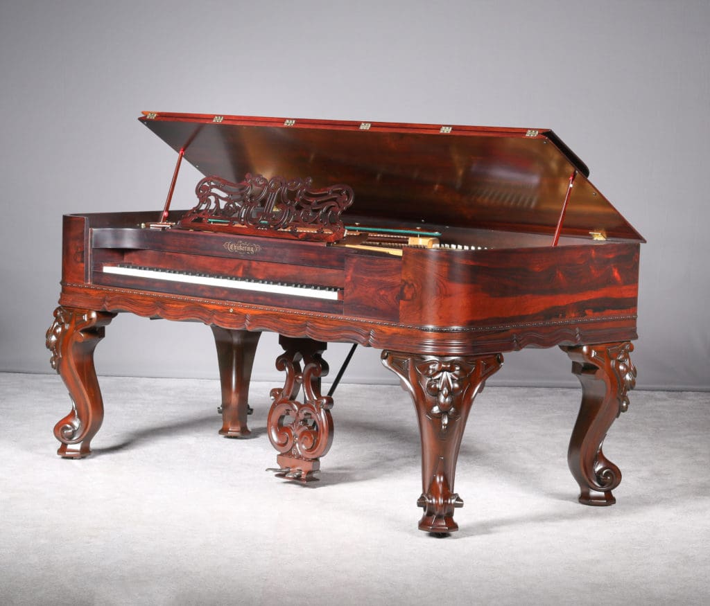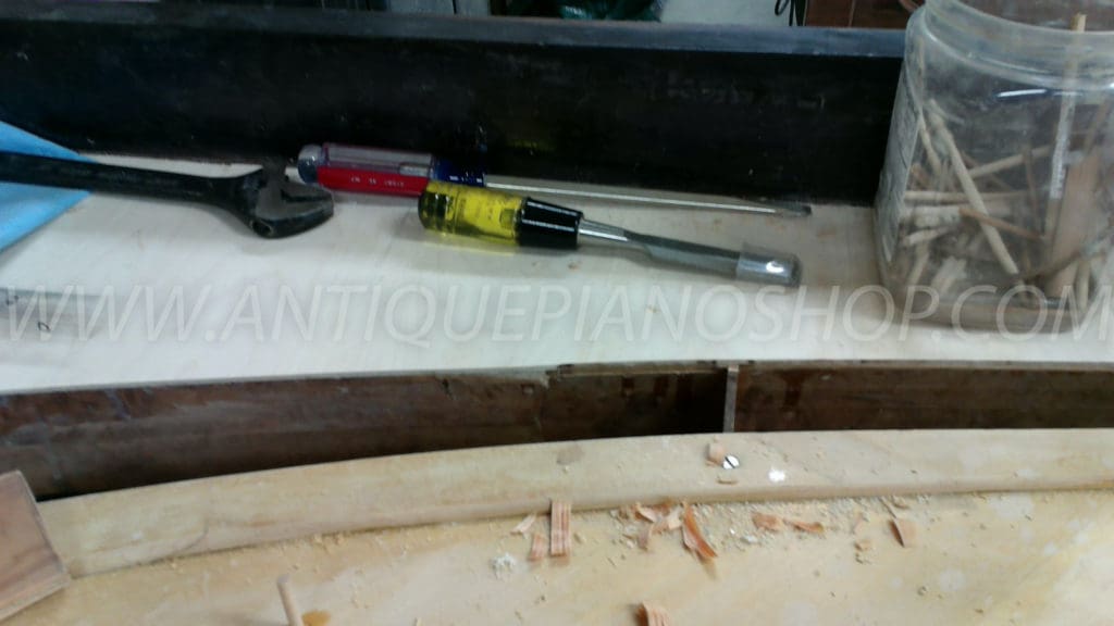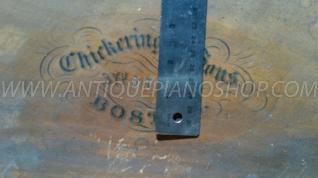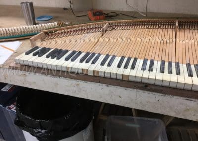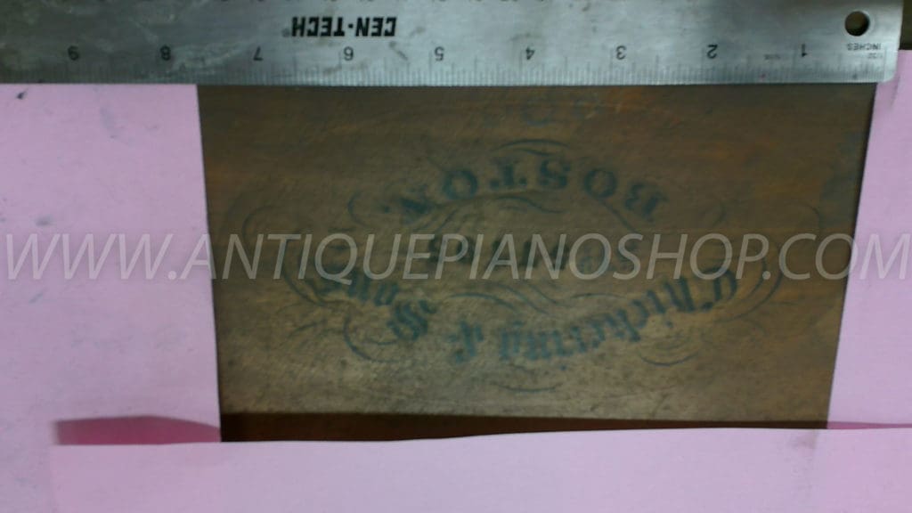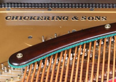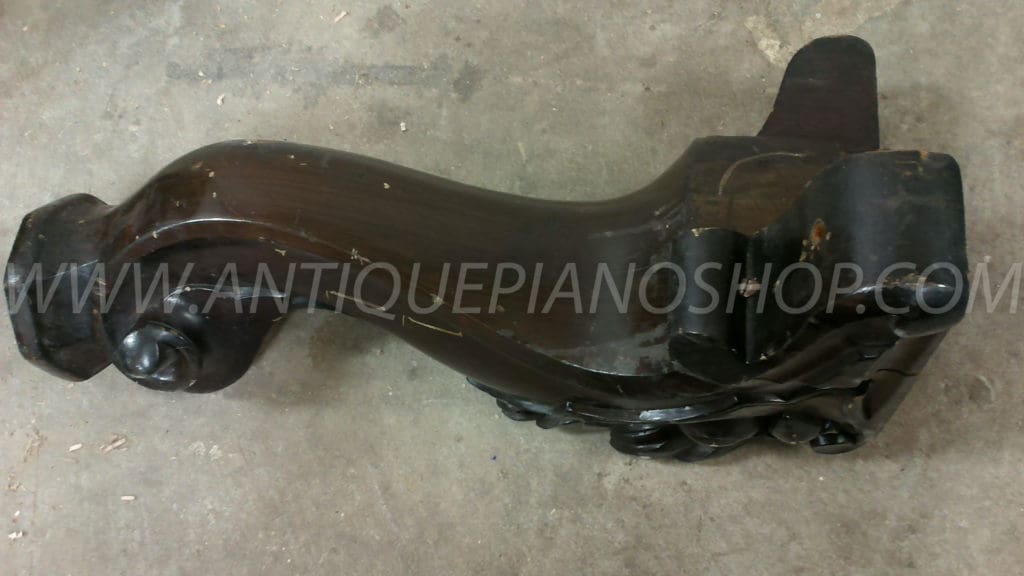 Prior to restoration, the piano was in dirty, unusable condition resulting from years of neglect. The massive rosewood legs are weak and brittle, requiring reinforcement to make them strong enough to hold the weight of the instrument. The piano is disassembled and each individual piece is carefully removed, labeled and recorded. The beautiful gold script CHICKERING BOSTON decals are copied and recorded so that exact duplicates can be made and applied with historical accuracy. The instrument is assessed for obscure and unusual parts which are not readily available from common suppliers and must be fabricated in our shop.