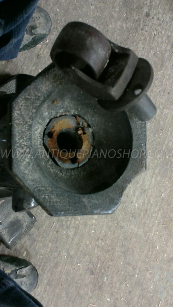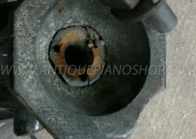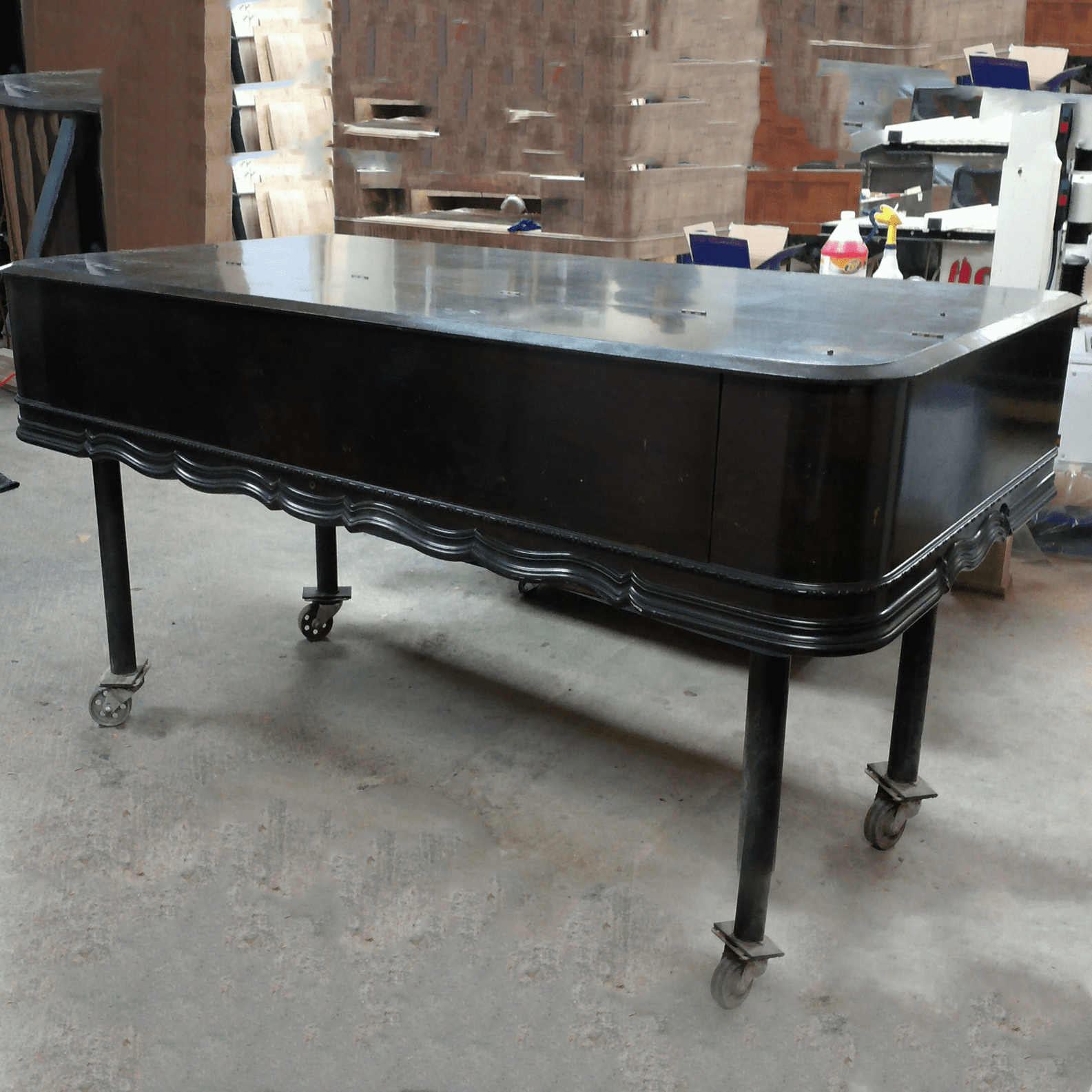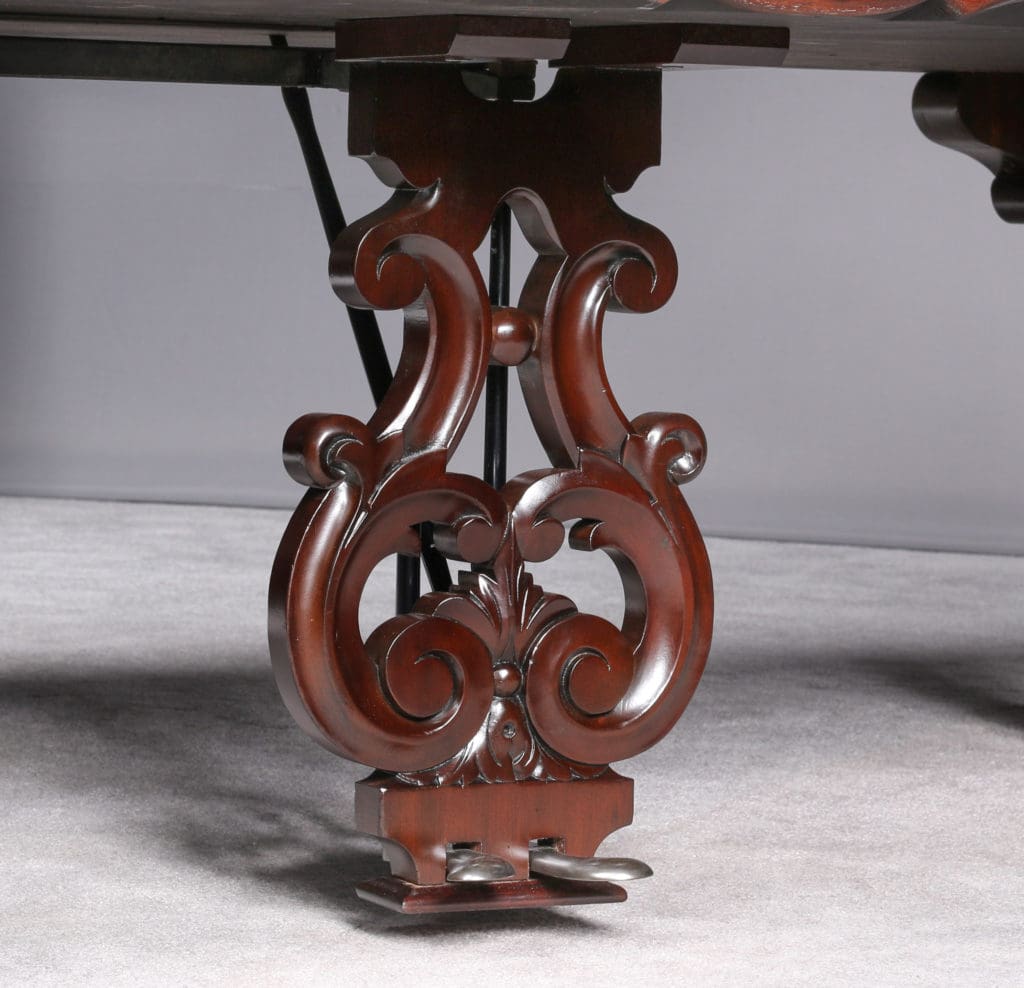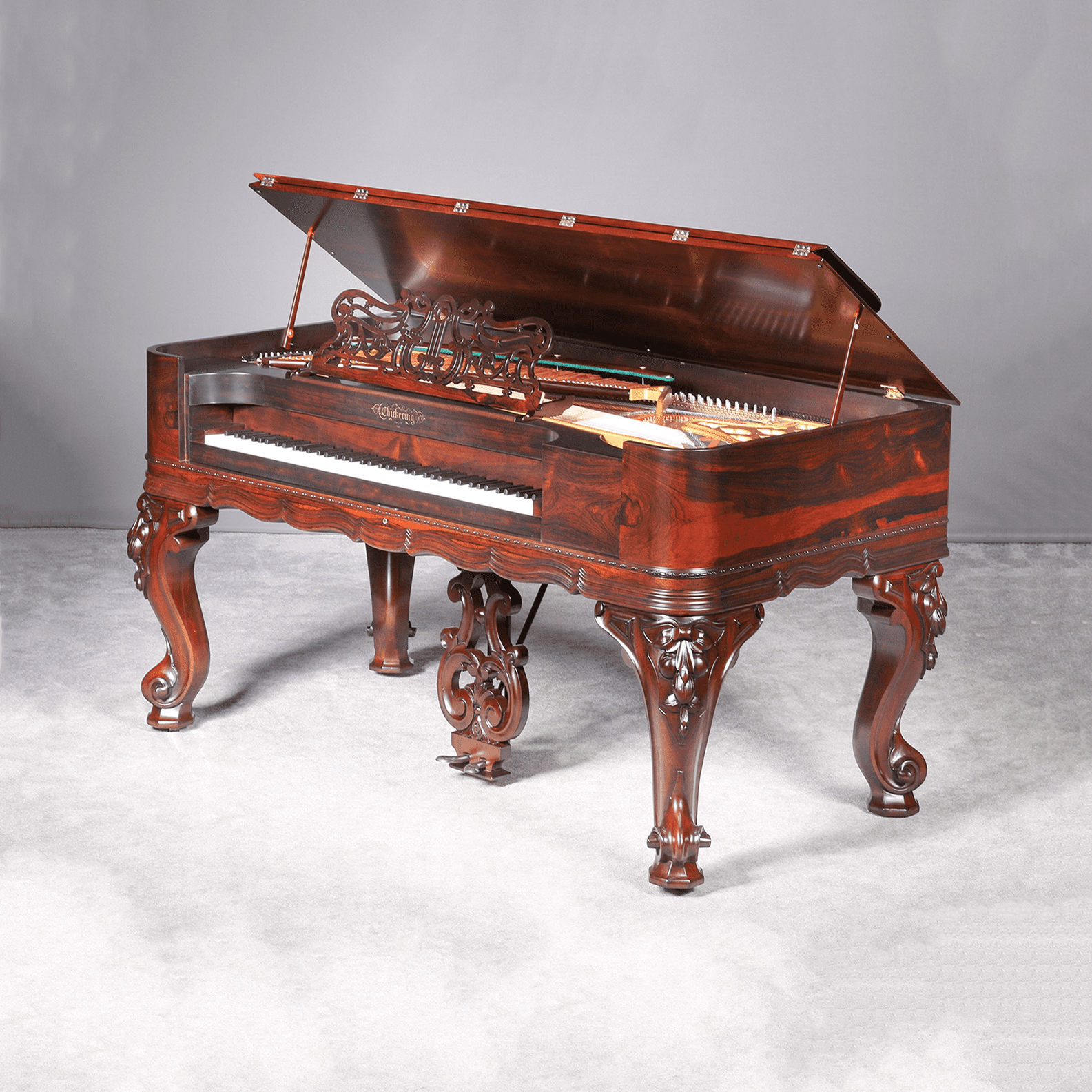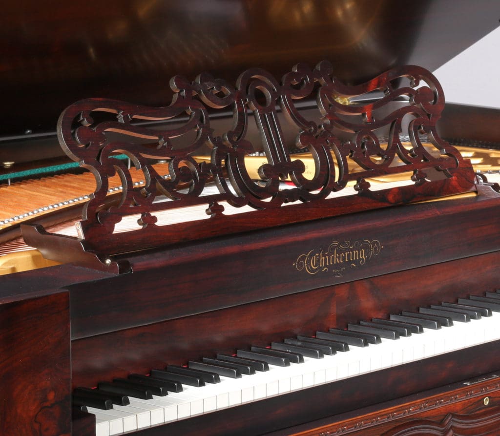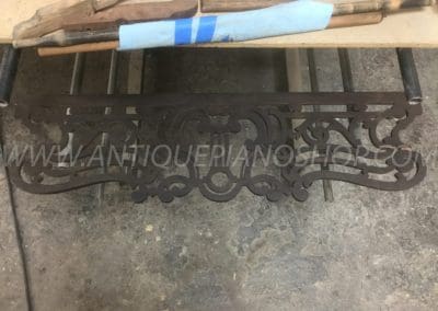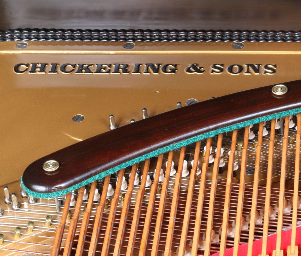 Prior to restoration, the piano was in dirty, unusable condition resulting from years of neglect. The massive rosewood legs are weak and brittle, requiring reinforcement to make them strong enough to hold the weight of the instrument. The piano is disassembled and each individual piece is carefully removed, labeled and recorded. The beautiful gold script CHICKERING BOSTON decals are copied and recorded so that exact duplicates can be made and applied with historical accuracy. The instrument is assessed for obscure and unusual parts which are not readily available from common suppliers and must be fabricated in our shop.