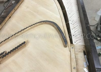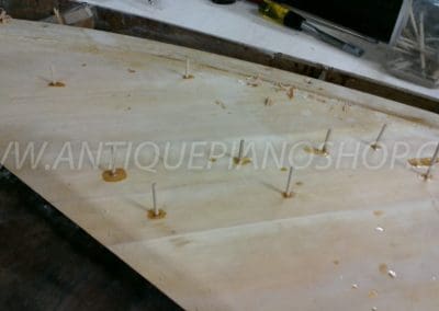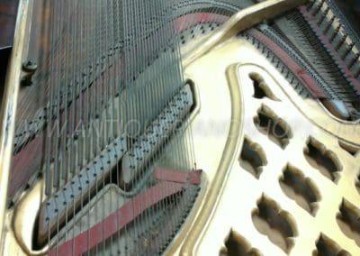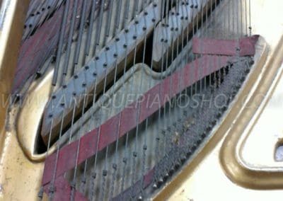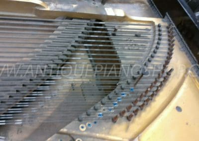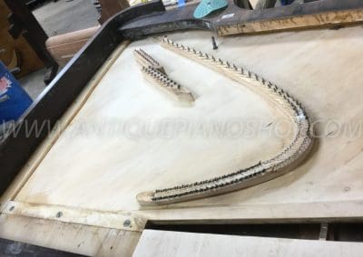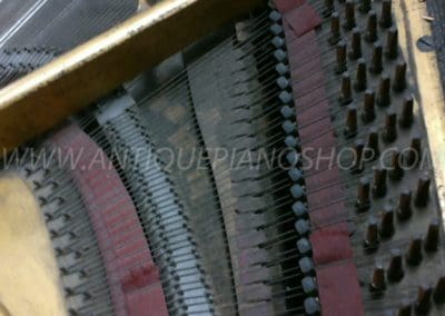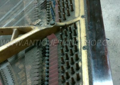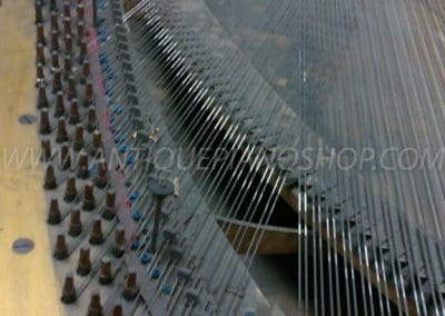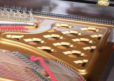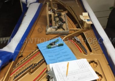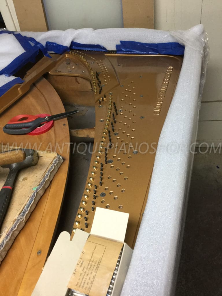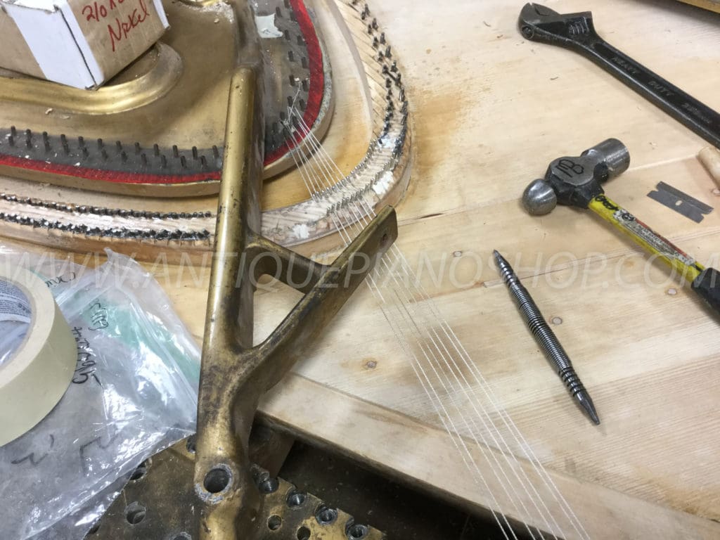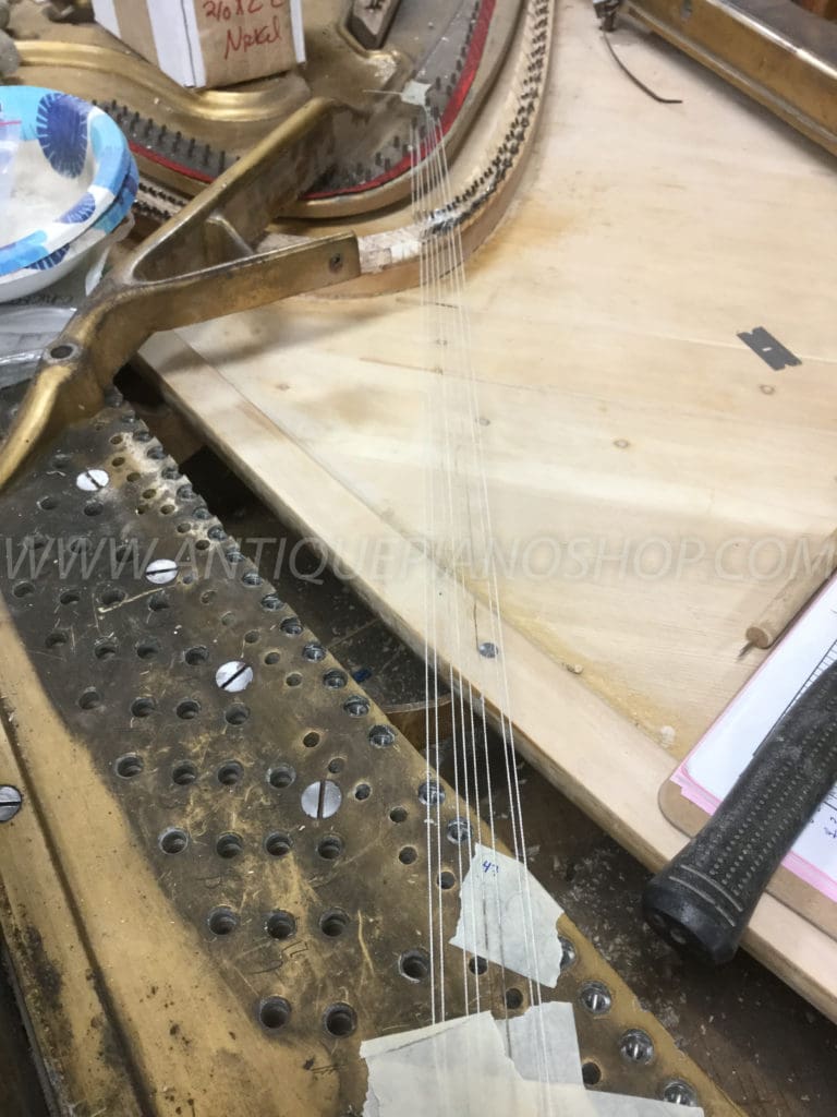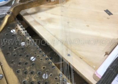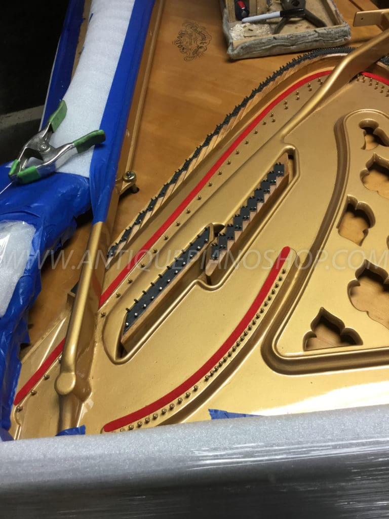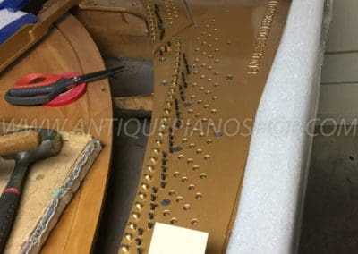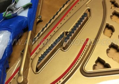 The soundboard is then stained and finished back to its original golden spruce color. The cast iron harp is stripped, sanded, and re-gilded with brilliant gold lacquer. All patent decals and serial numbers are replaced with historical accuracy. A new pin block is custom made for long-term tuning stability. Finally, the new strings are installed in the piano.