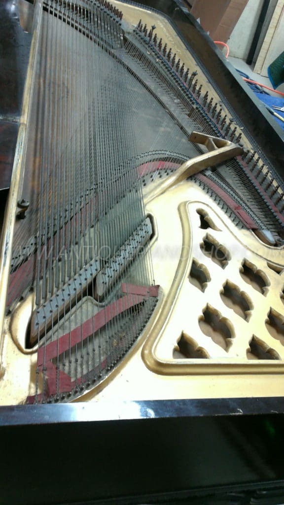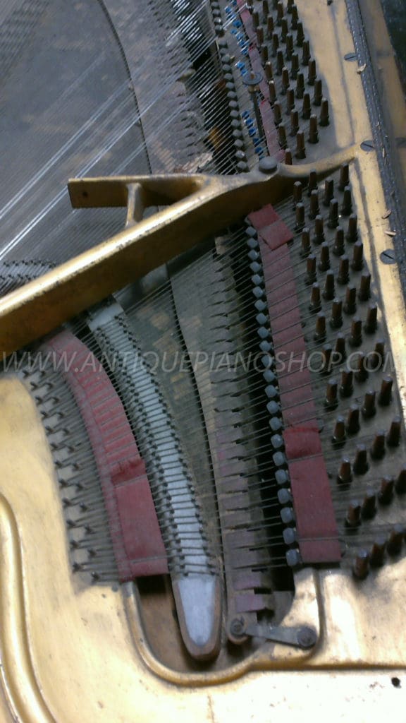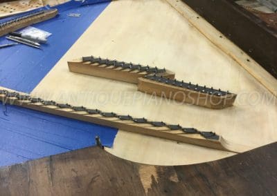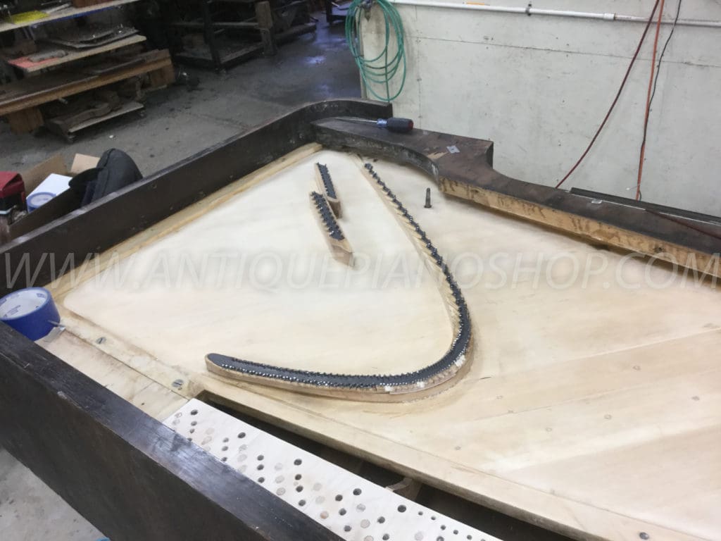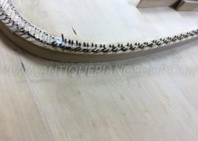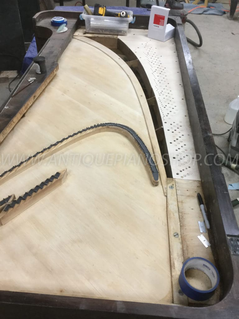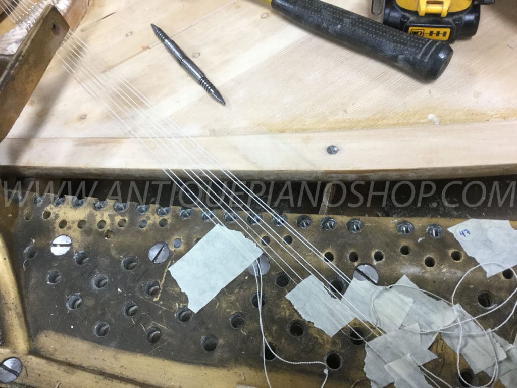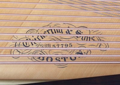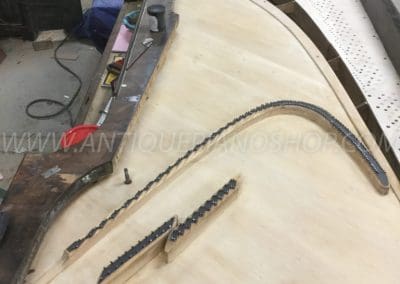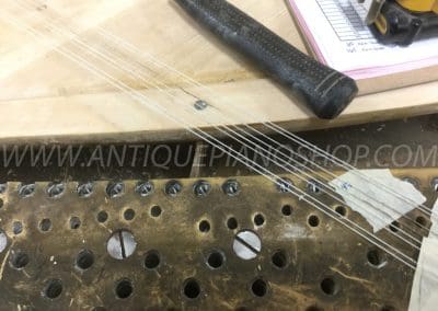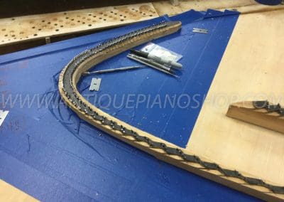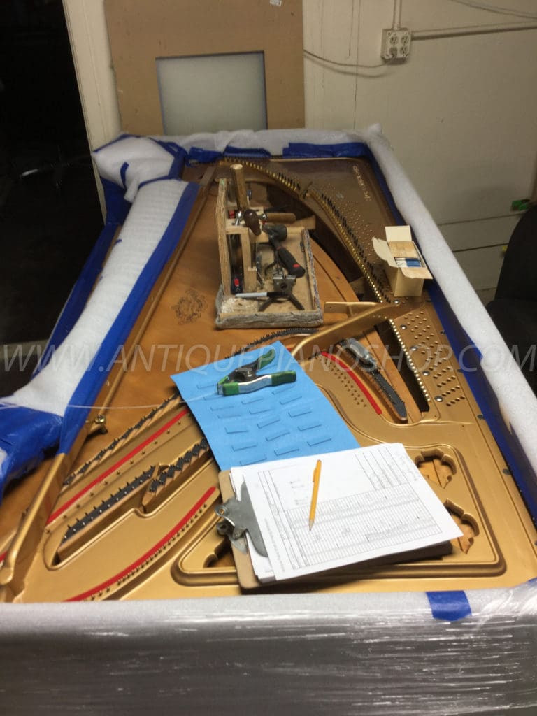 The soundboard is then stained and finished back to its original golden spruce color. The cast iron harp is stripped, sanded, and re-gilded with brilliant gold lacquer. All patent decals and serial numbers are replaced with historical accuracy. A new pin block is custom made for long-term tuning stability. Finally, the new strings are installed in the piano.
