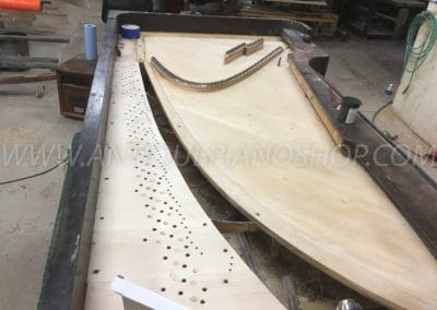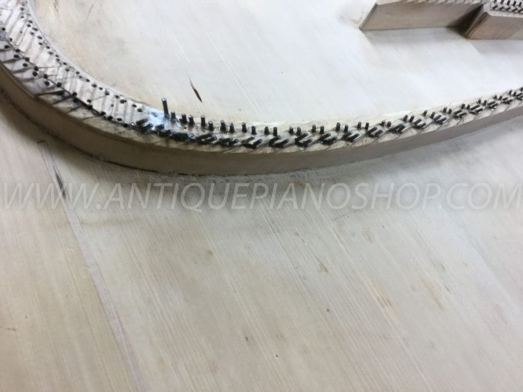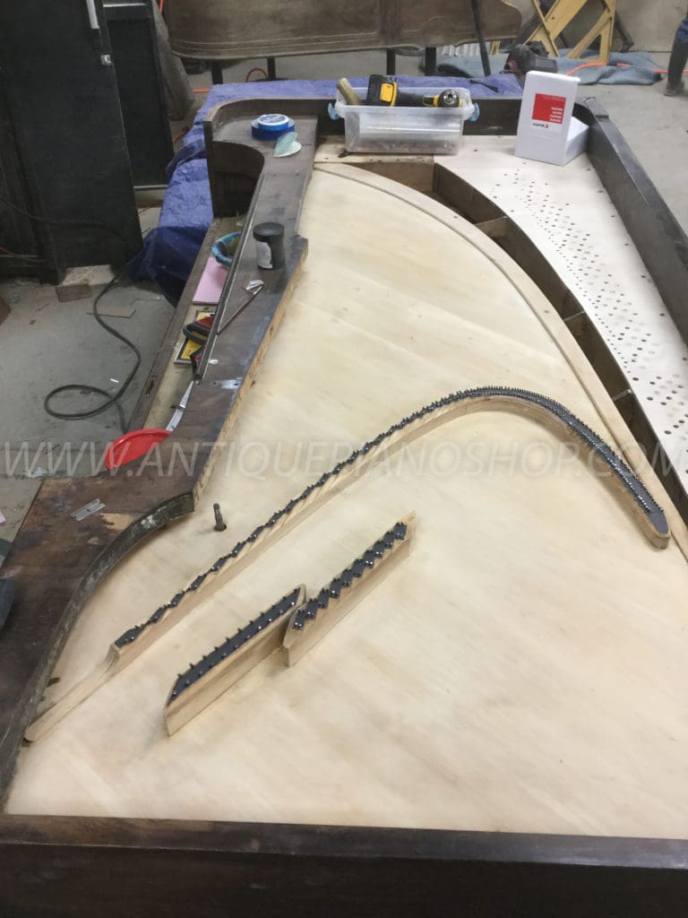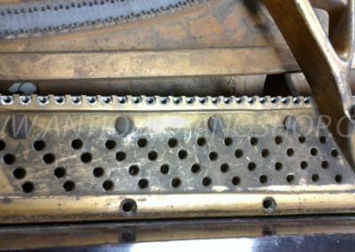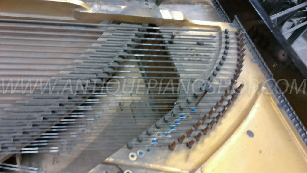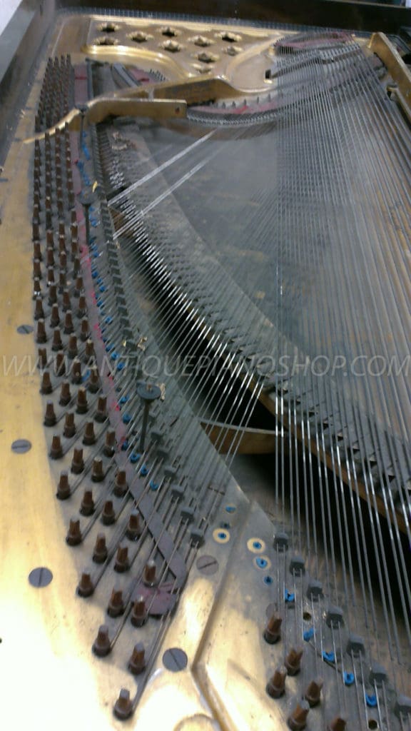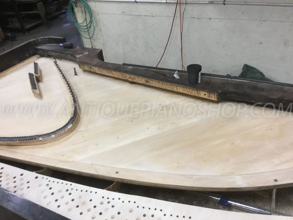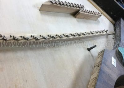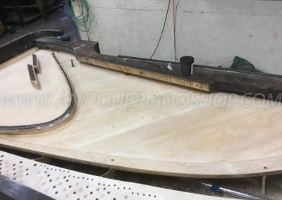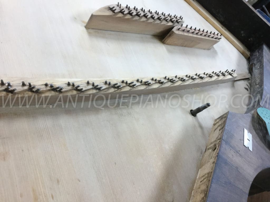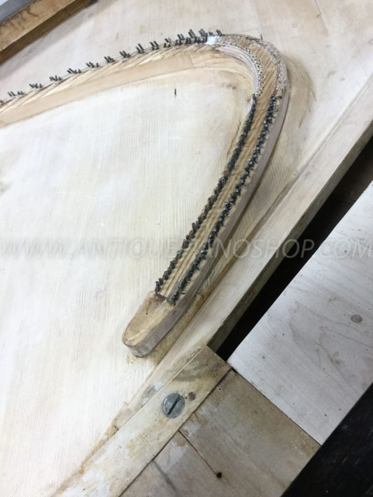 The soundboard is then stained and finished back to its original golden spruce color. The cast iron harp is stripped, sanded, and re-gilded with brilliant gold lacquer. All patent decals and serial numbers are replaced with historical accuracy. A new pin block is custom made for long-term tuning stability. Finally, the new strings are installed in the piano.