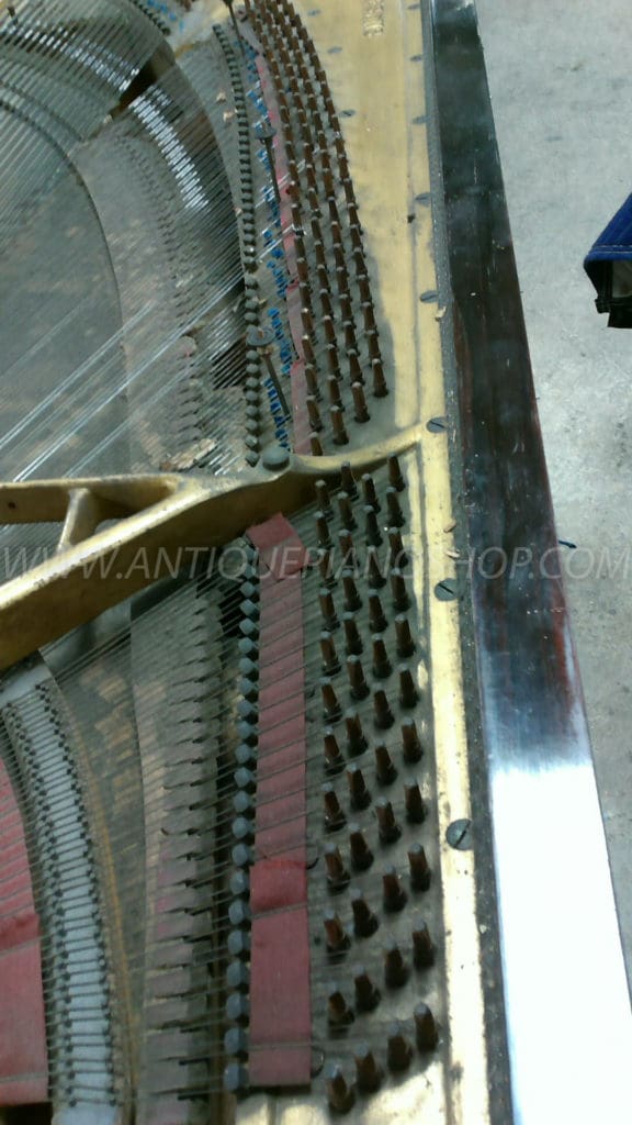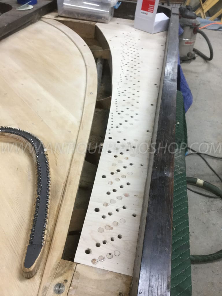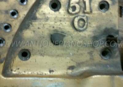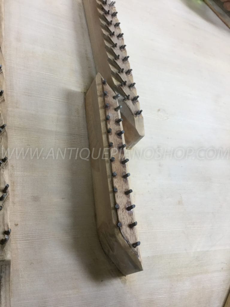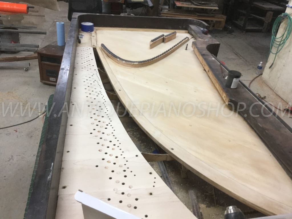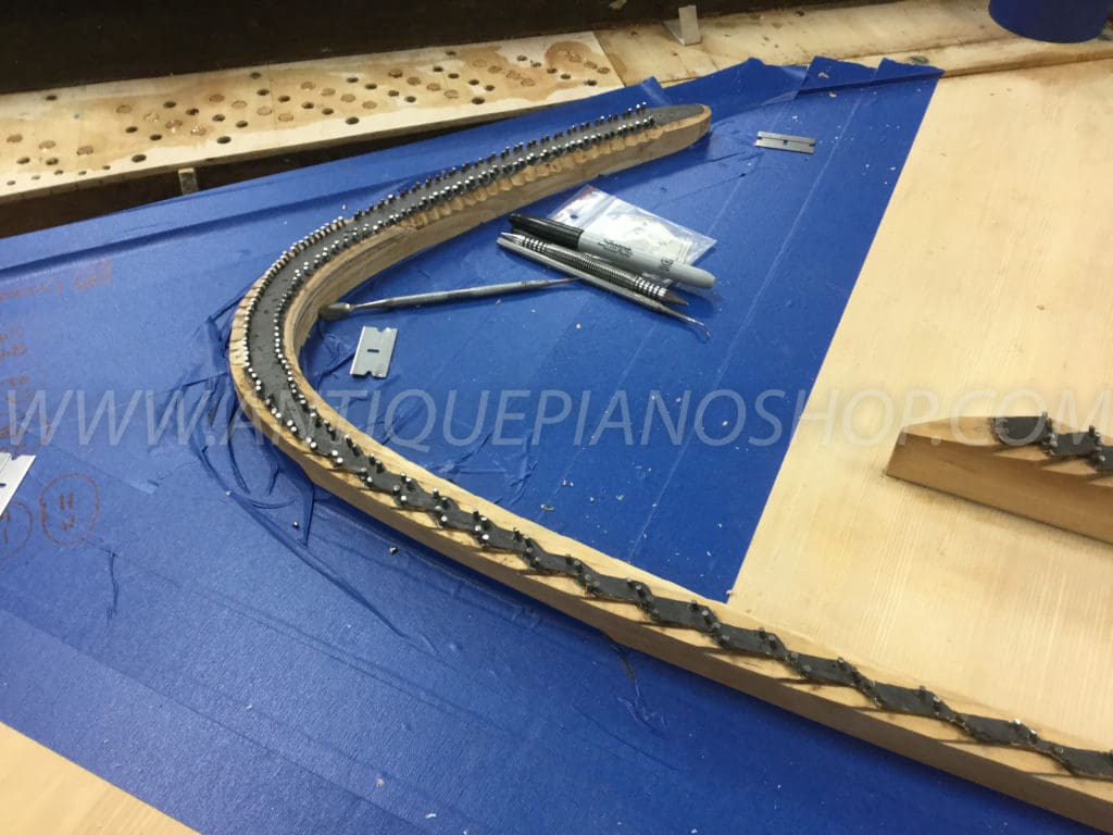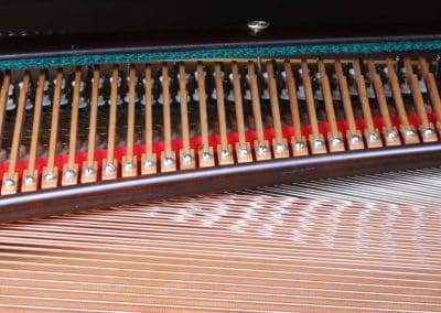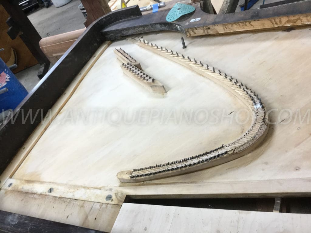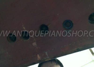 The soundboard is then stained and finished back to its original golden spruce color. The cast iron harp is stripped, sanded, and re-gilded with brilliant gold lacquer. All patent decals and serial numbers are replaced with historical accuracy. A new pin block is custom made for long-term tuning stability. Finally, the new strings are installed in the piano.
