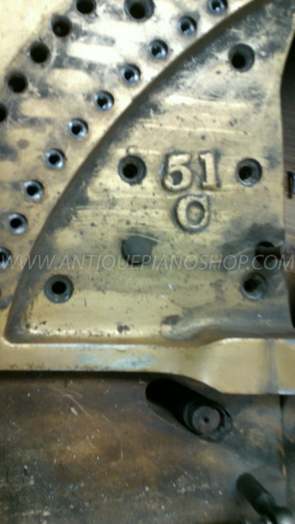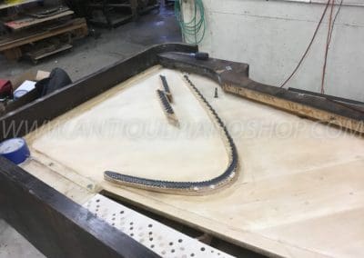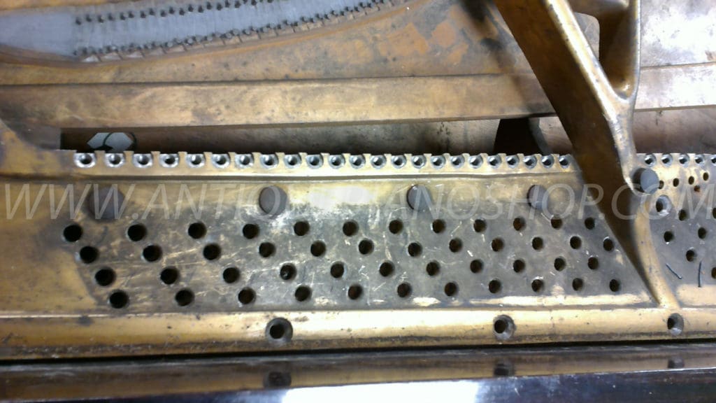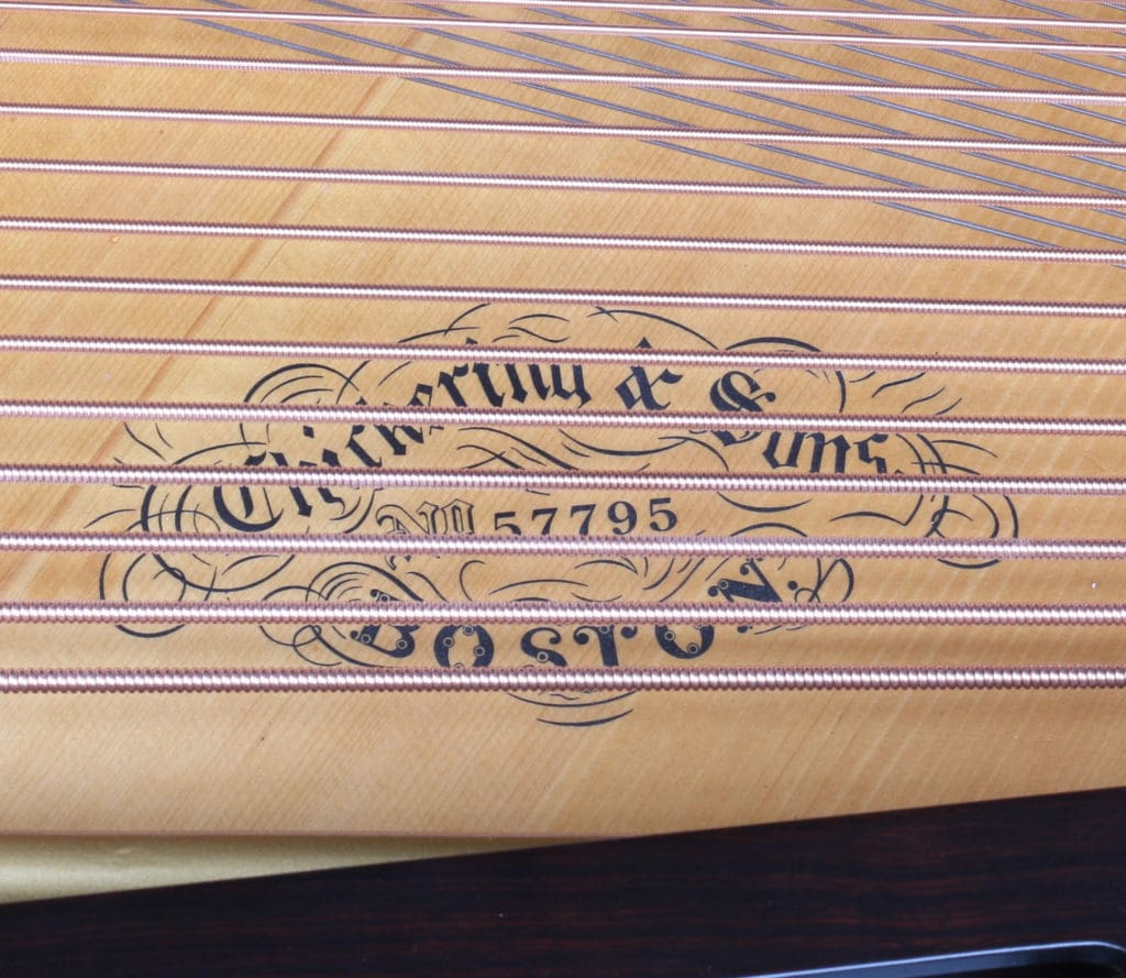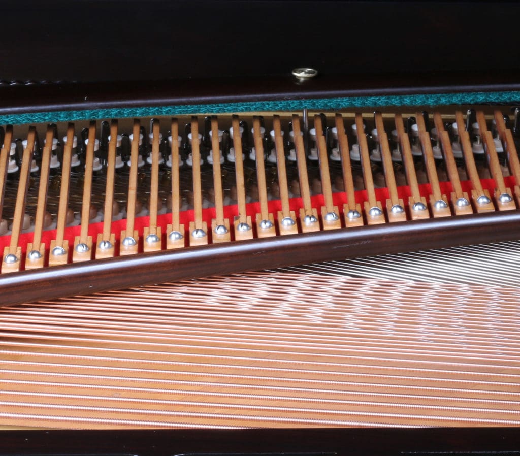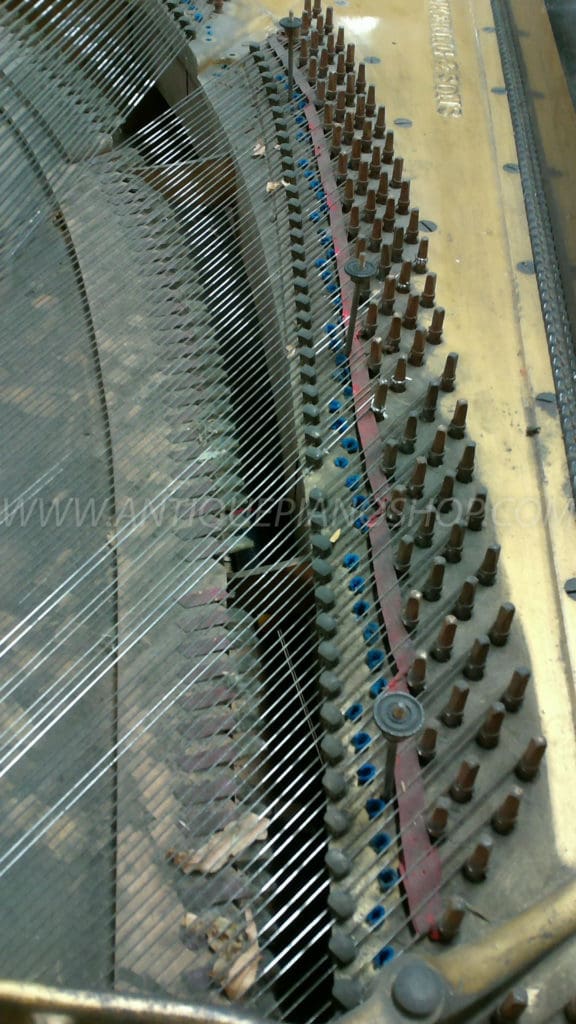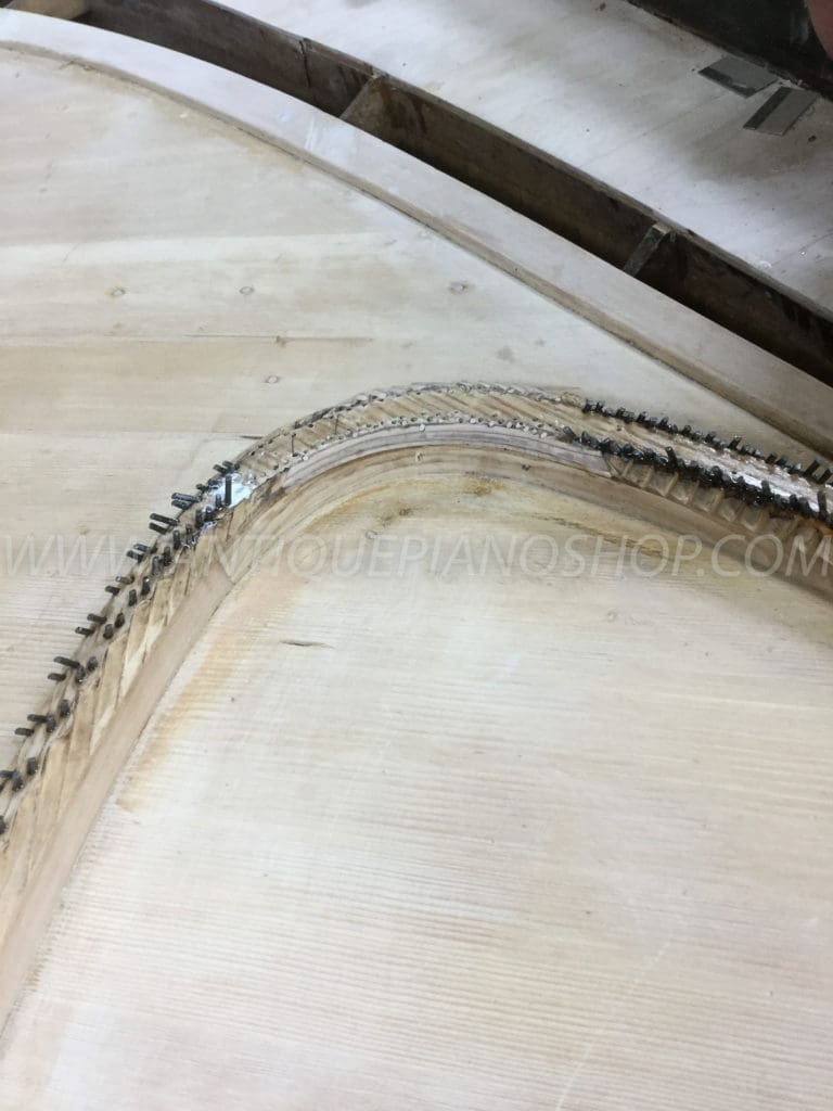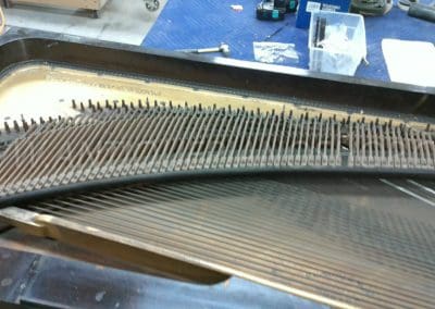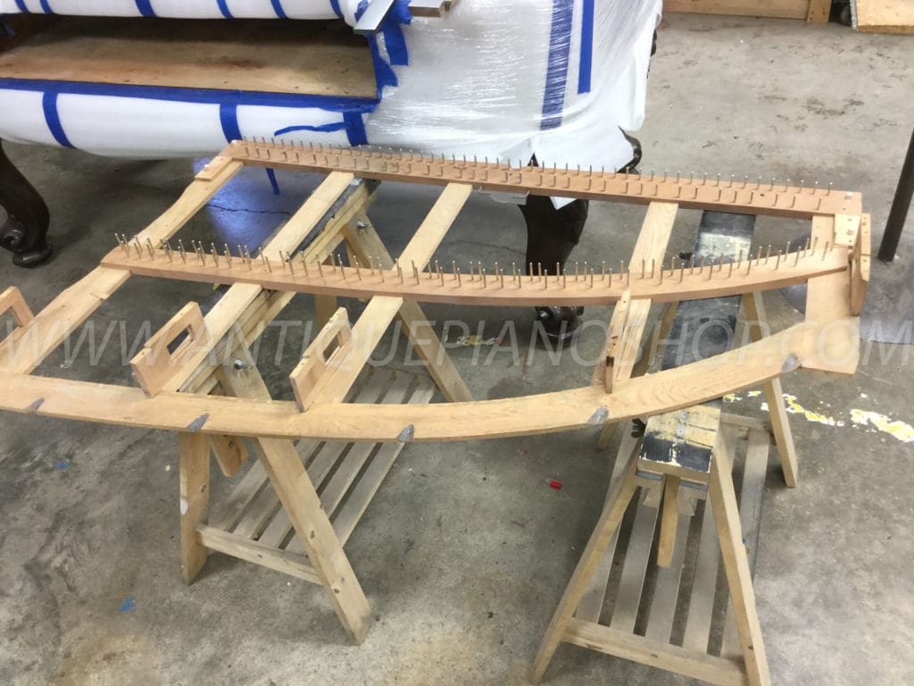 The soundboard is then stained and finished back to its original golden spruce color. The cast iron harp is stripped, sanded, and re-gilded with brilliant gold lacquer. All patent decals and serial numbers are replaced with historical accuracy. A new pin block is custom made for long-term tuning stability. Finally, the new strings are installed in the piano.