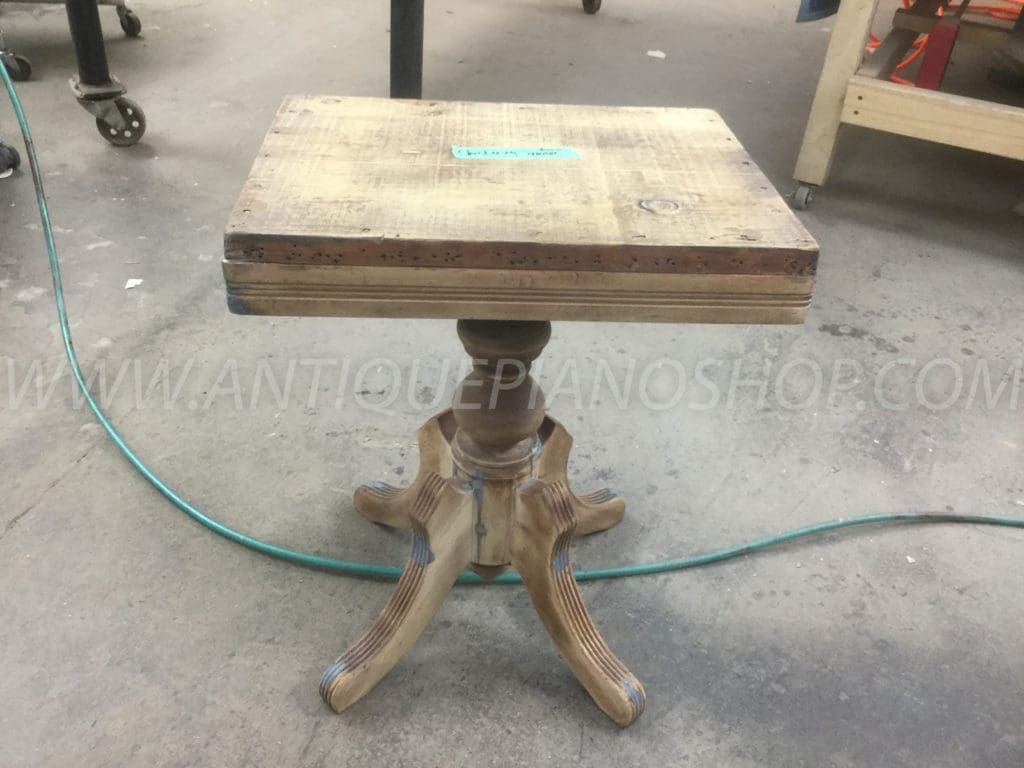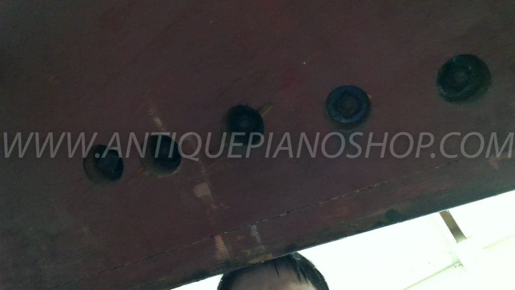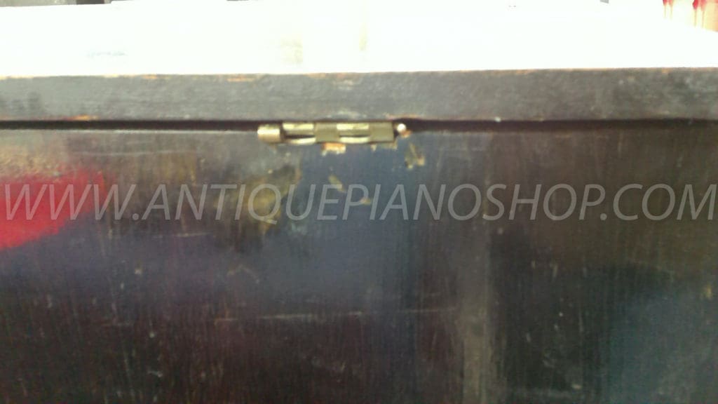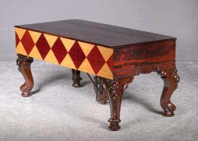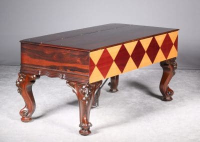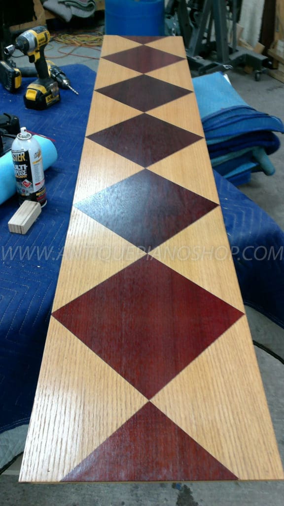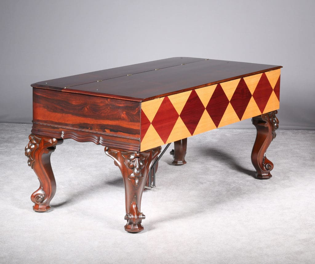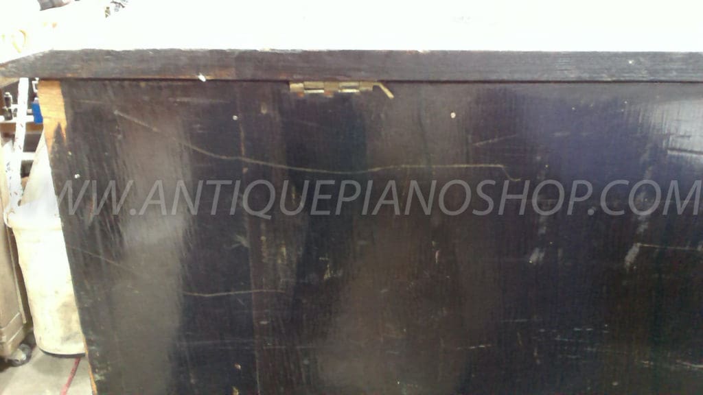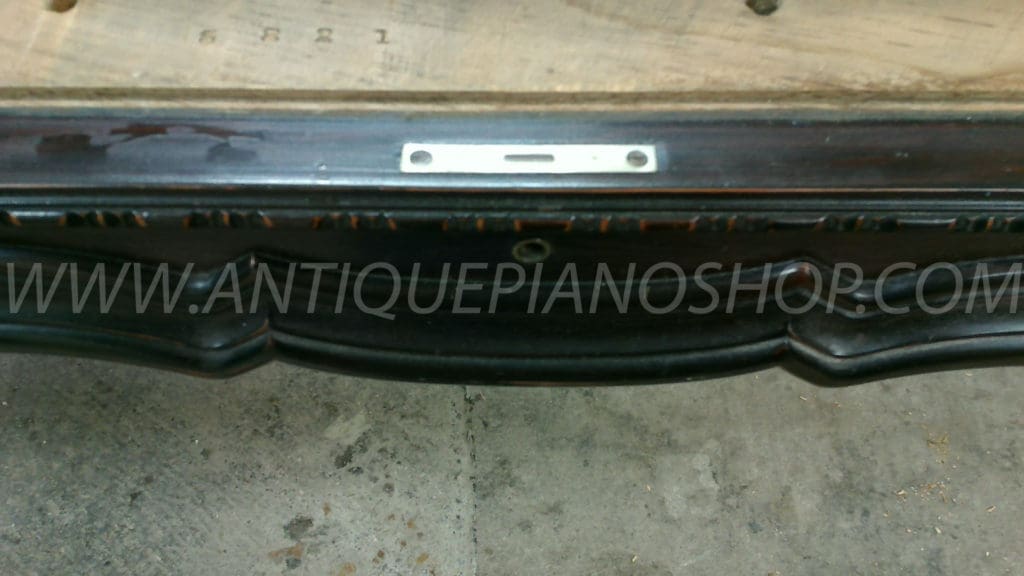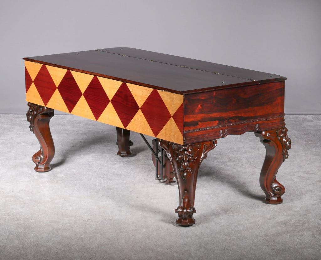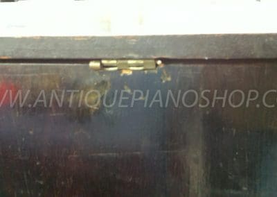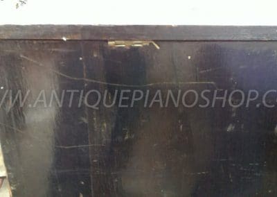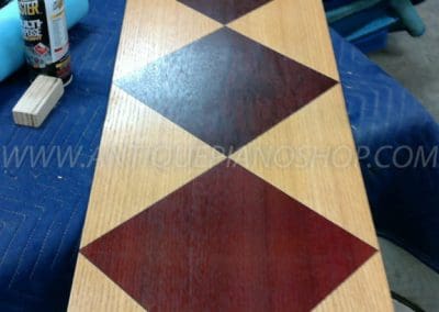 The owner of this piano decided to have his heirloom square piano restored in conjunction with a home renovation, having the piano removed from him house while the renovations took place. For decades, the instrument had sat unused and neglected as a piece of furniture, but the importance of the piece to the family’s history kept the instrument from being destroyed with hopes of having it restored one day. The old finish was never meant to look so black, and the owner was stunned to see what beautiful wood was hidden underneath decades of dirt and deterioration! Note the owner had the back of the piano custom finished to match the parquet pattern on his hardwood floors, as the back of this piano was facing the front entrance to his home.