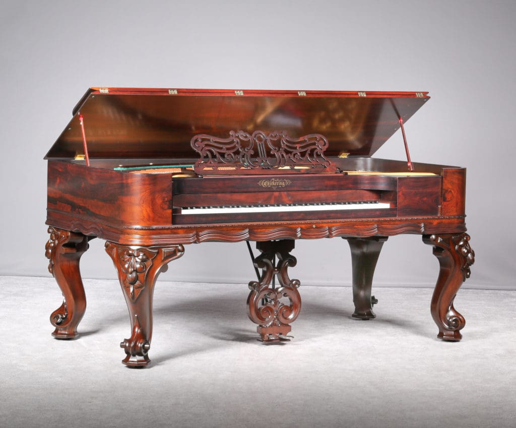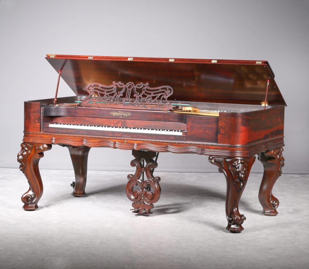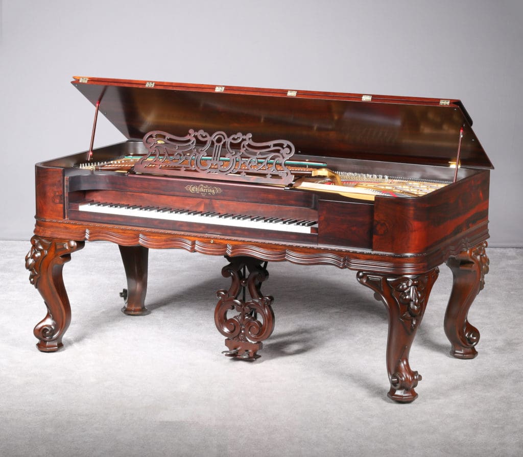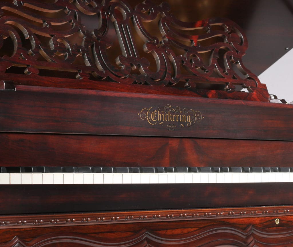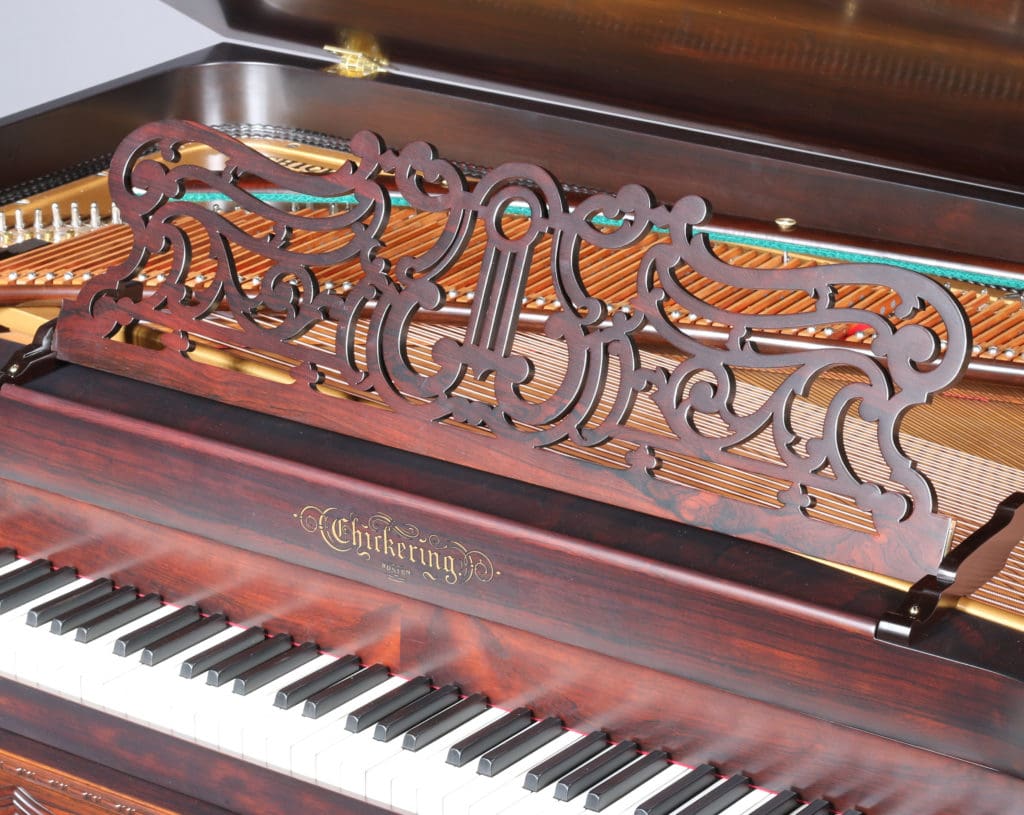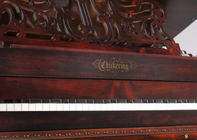About this piano: This beautiful Chickering square grand piano was built in Boston in 1884, a time when more square grand pianos were being built in America than both upright and grand pianos combined! This piano is made of Brazilian Rosewood, now an endangered species, and is of the carved Rococo Victorian style. It is fascinating to think that with the endangered rosewood and the endangered ivory keys, this piano could not be built today!