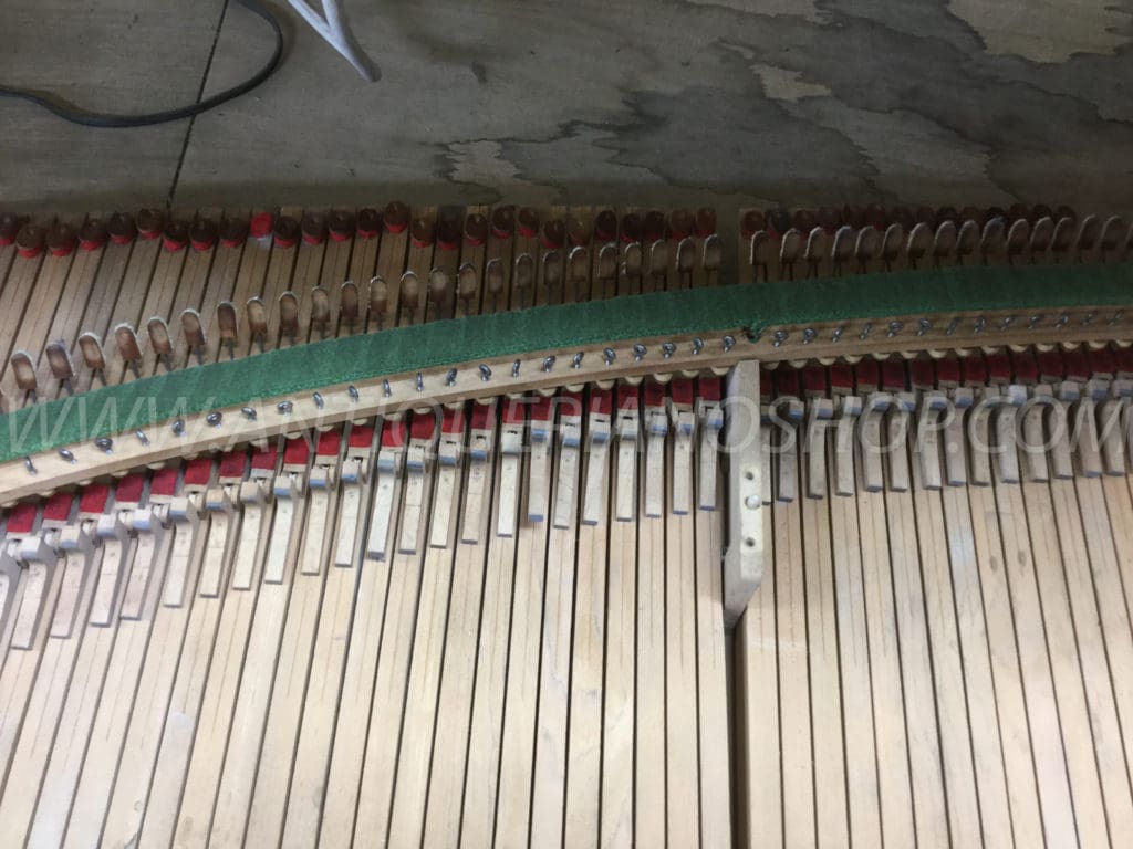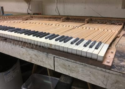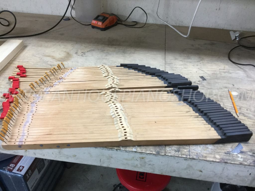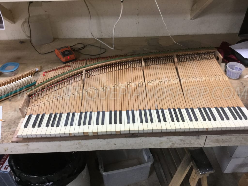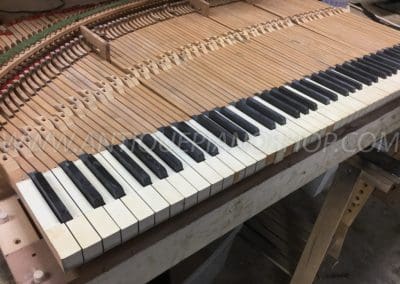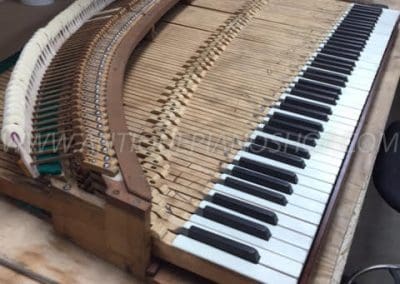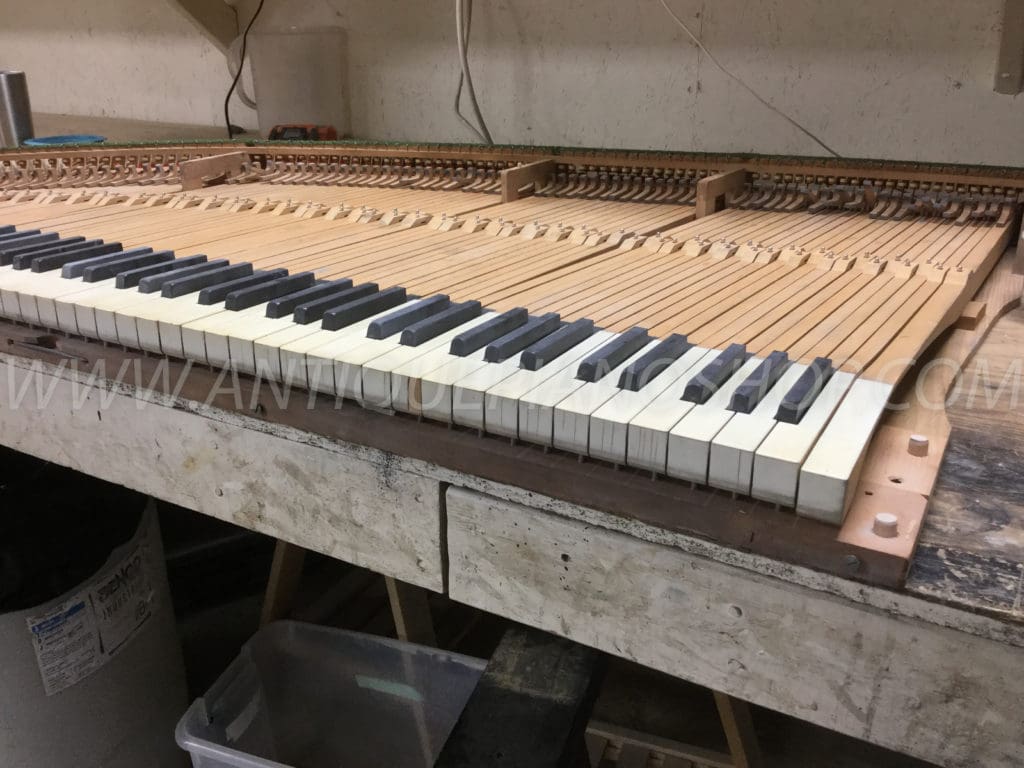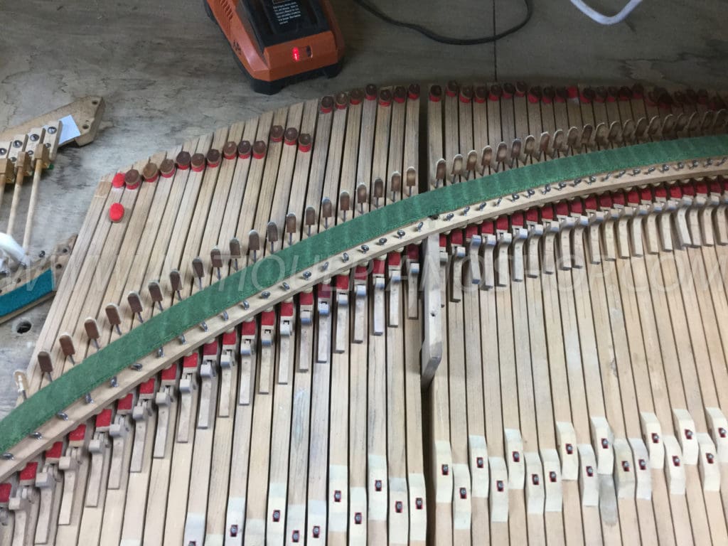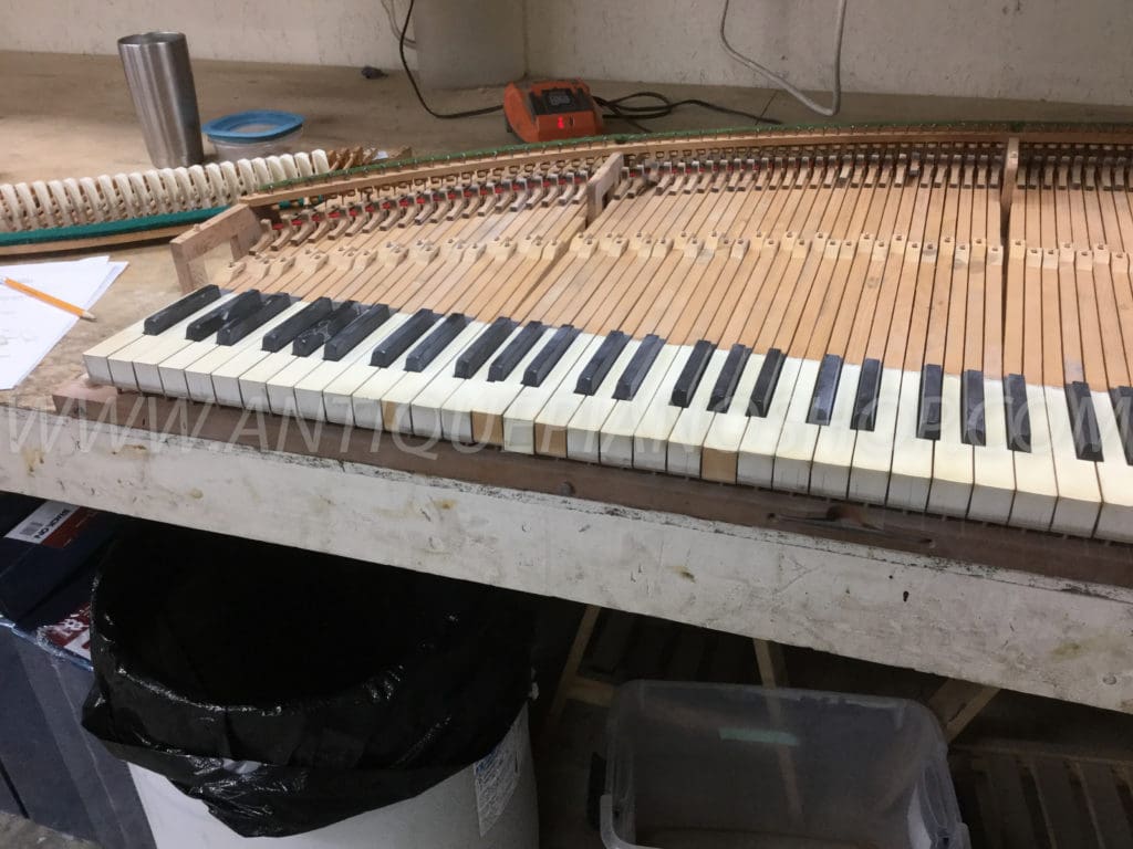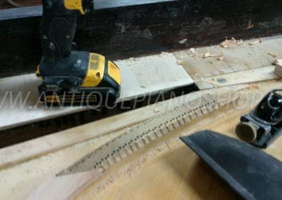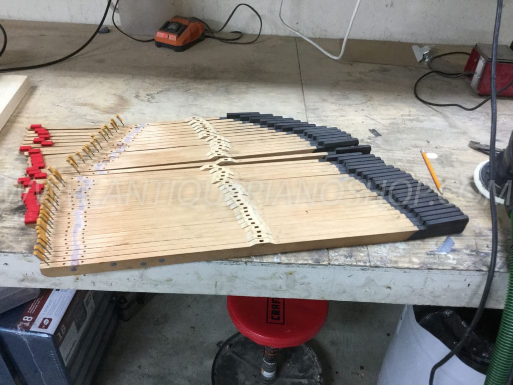 The original ivory and ebony keys are very restorable and turn out very nice. Chips in the ivory are filled, then the ivory is treated with peroxide and UV light then polished. The mechanical action of the piano is moth eaten and dry-rotted which will present a challenge to restore. Because the parts for this instrument are obscure and not readily available, we specialize in making all of our parts “in house” on a case-by-case basis. Our amazing action team was able to duplicate every last part of this square grand piano action both by hand and with the help of CNC machines.