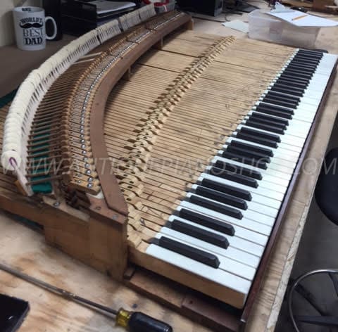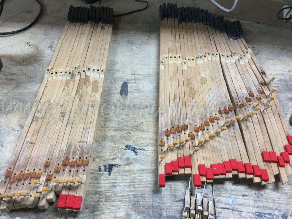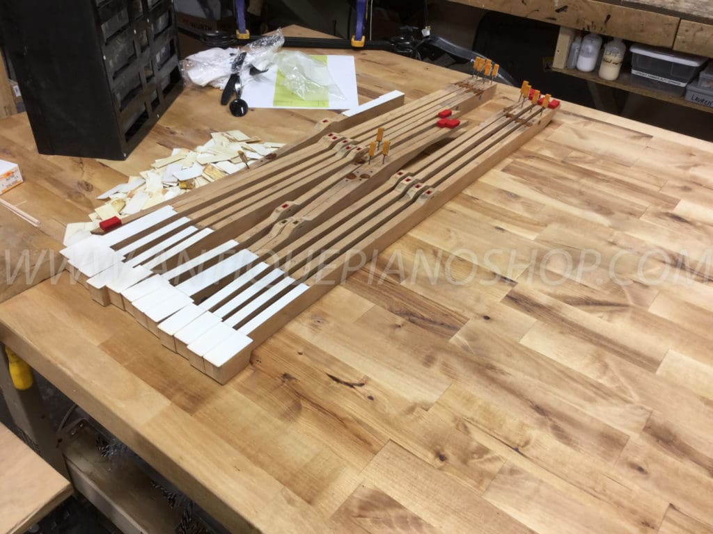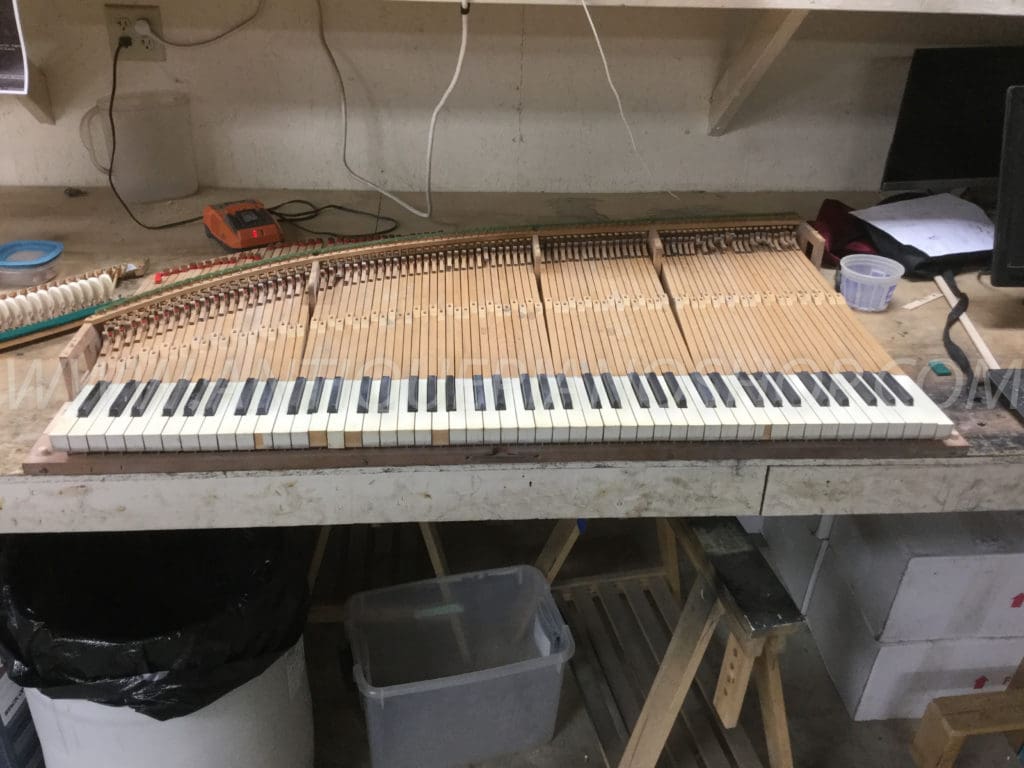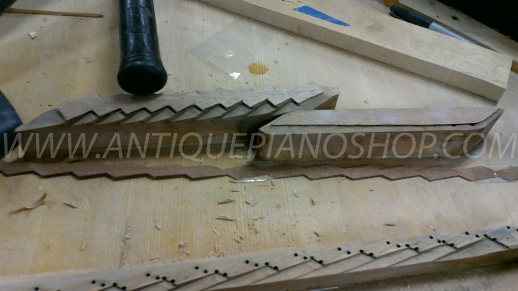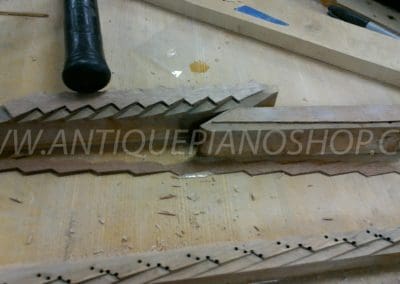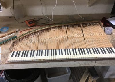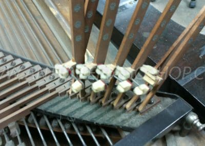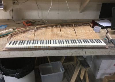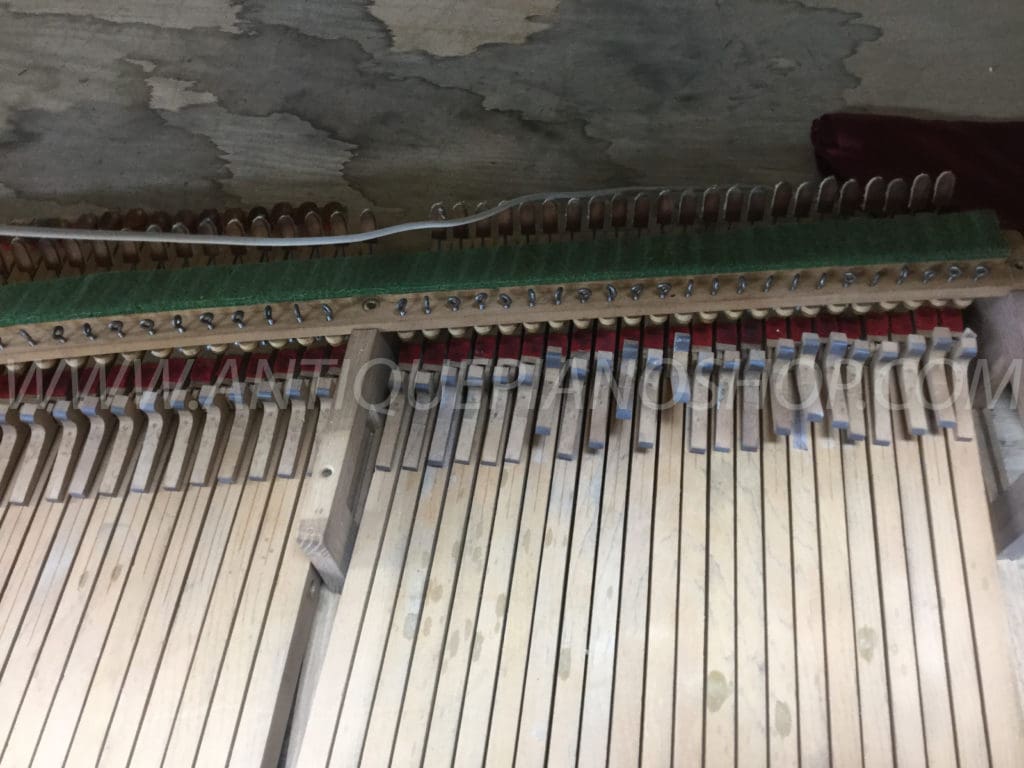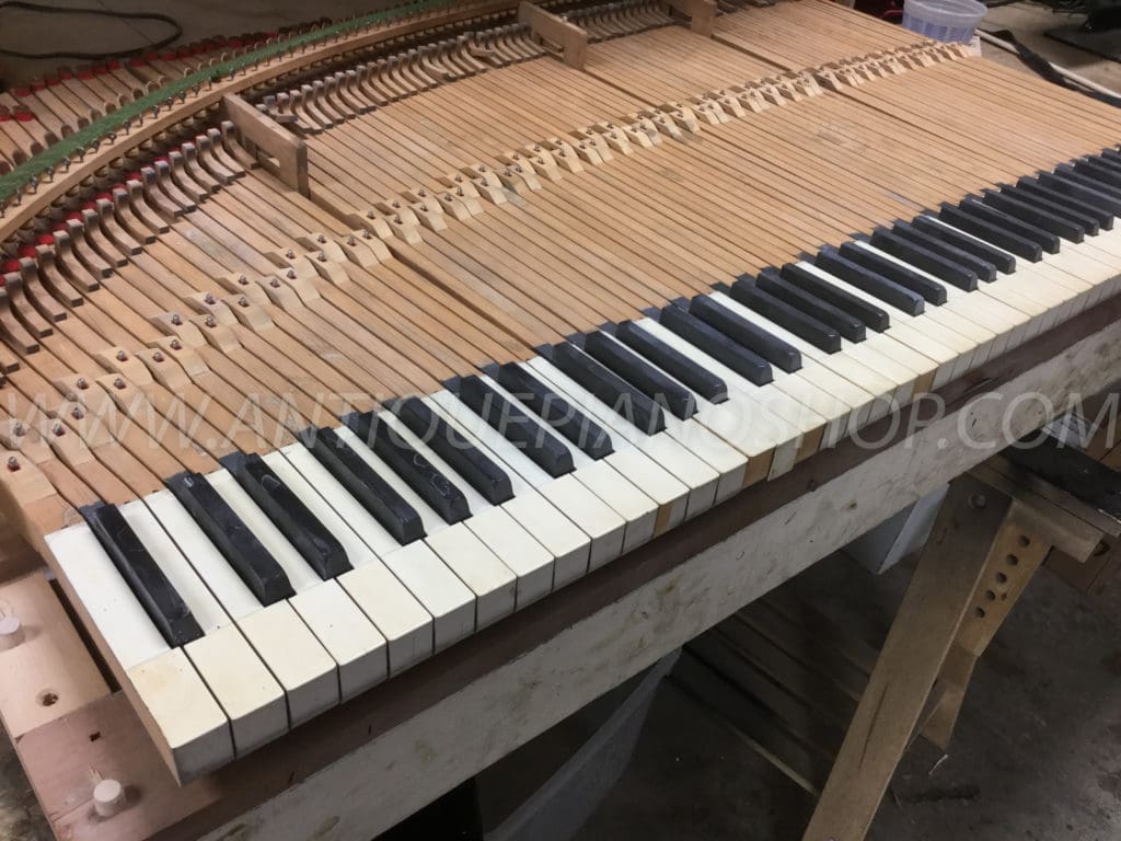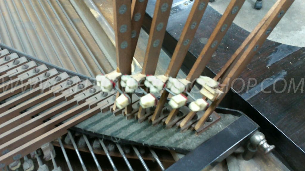 The original ivory and ebony keys are very restorable and turn out very nice. Chips in the ivory are filled, then the ivory is treated with peroxide and UV light then polished. The mechanical action of the piano is moth eaten and dry-rotted which will present a challenge to restore. Because the parts for this instrument are obscure and not readily available, we specialize in making all of our parts “in house” on a case-by-case basis. Our amazing action team was able to duplicate every last part of this square grand piano action both by hand and with the help of CNC machines.