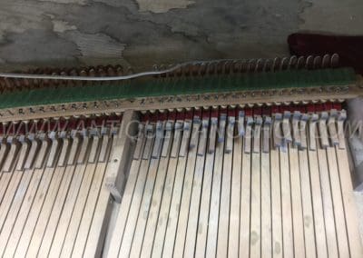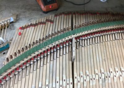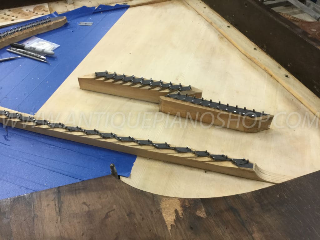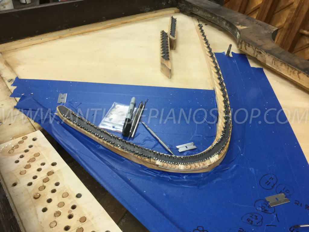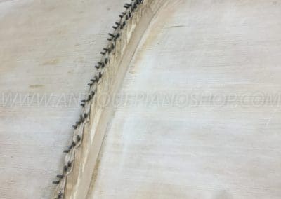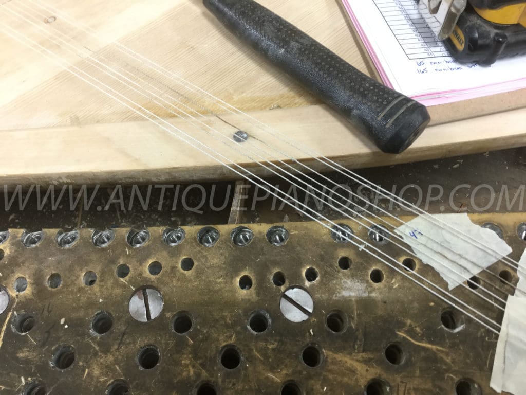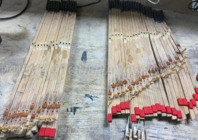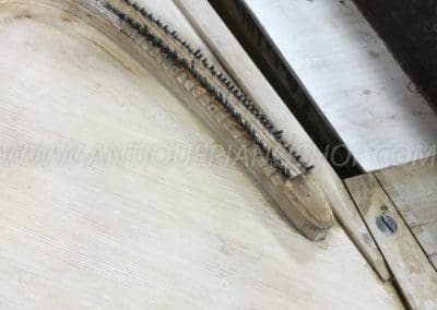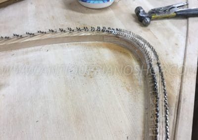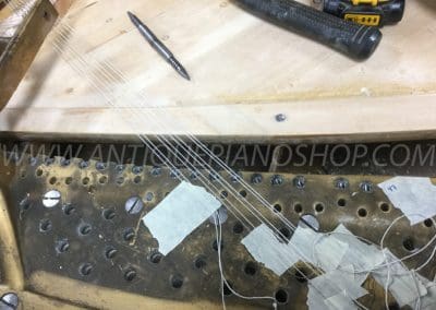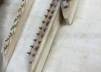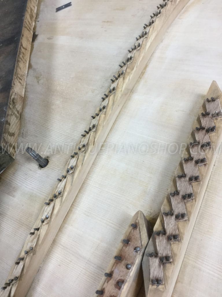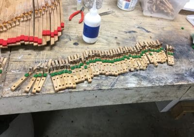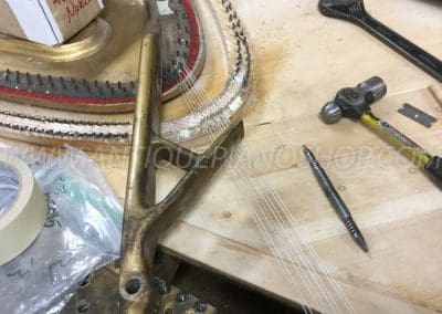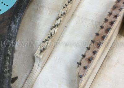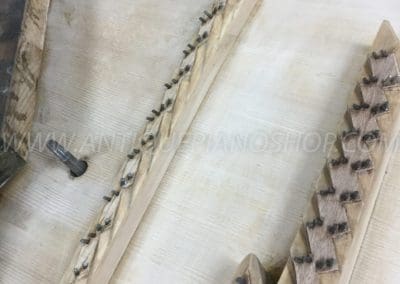 The old worn strings are so weak and brittle they are no longer able to be tuned. The strings are removed from the instrument with each individual string painstakingly measured and recorded in order to regenerate an accurate stringing scale. The gold harp is removed from the case exposing the old-growth wood soundboard. Multiple cracks and splits in the soundboard are repaired and the bridges are repaired and partially re-capped where needed. Thread is used to mimic the strings as the proper amount of down-bearing is achieved.
