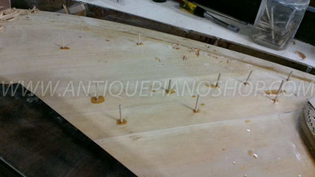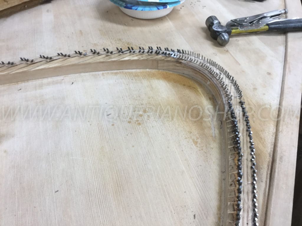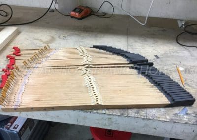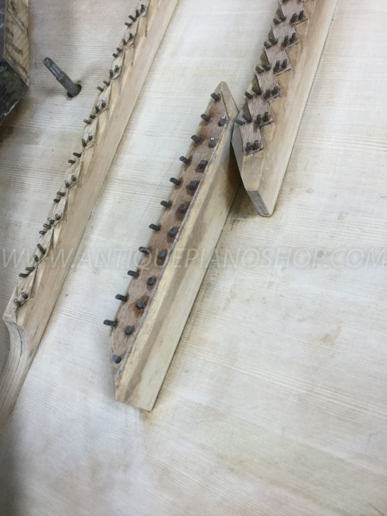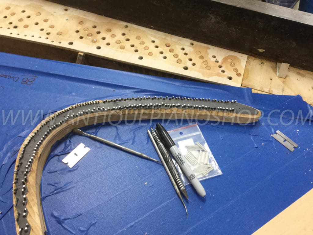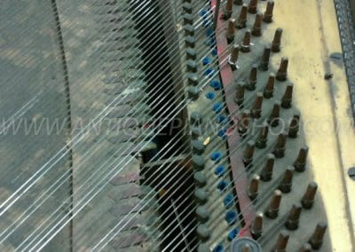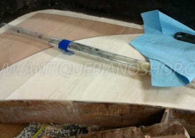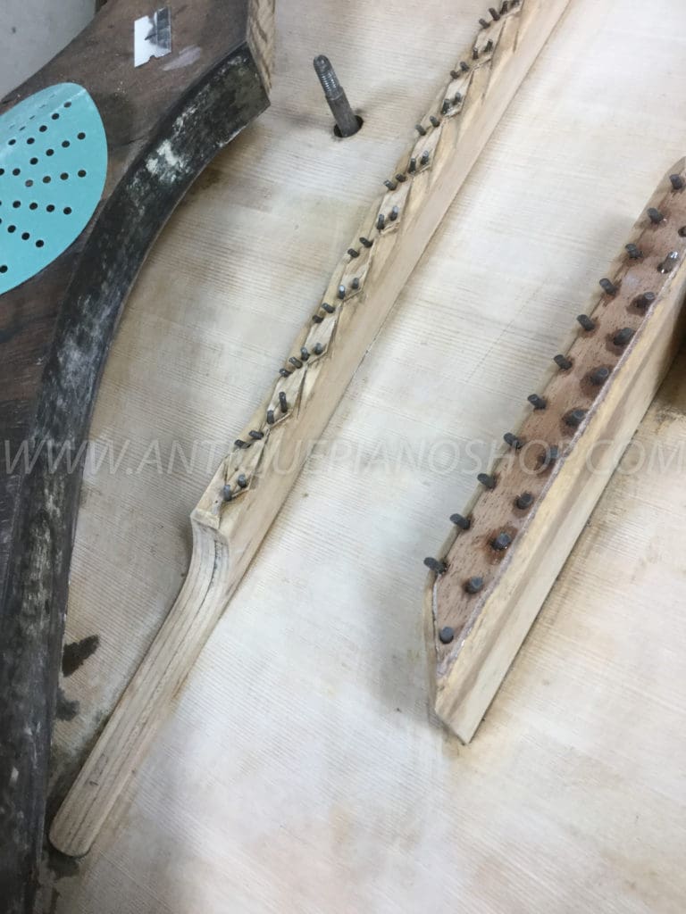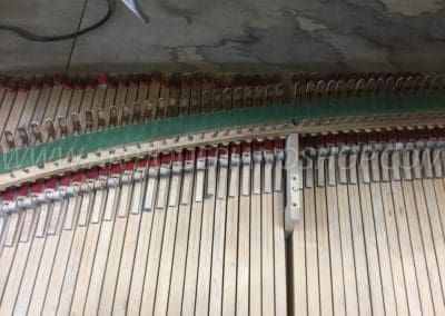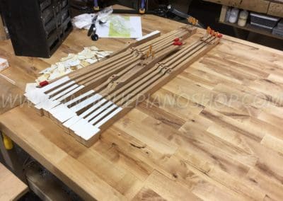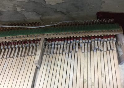 The old worn strings are so weak and brittle they are no longer able to be tuned. The strings are removed from the instrument with each individual string painstakingly measured and recorded in order to regenerate an accurate stringing scale. The gold harp is removed from the case exposing the old-growth wood soundboard. Multiple cracks and splits in the soundboard are repaired and the bridges are repaired and partially re-capped where needed. Thread is used to mimic the strings as the proper amount of down-bearing is achieved.